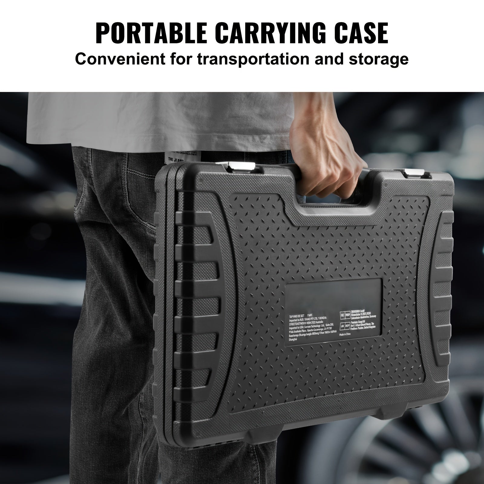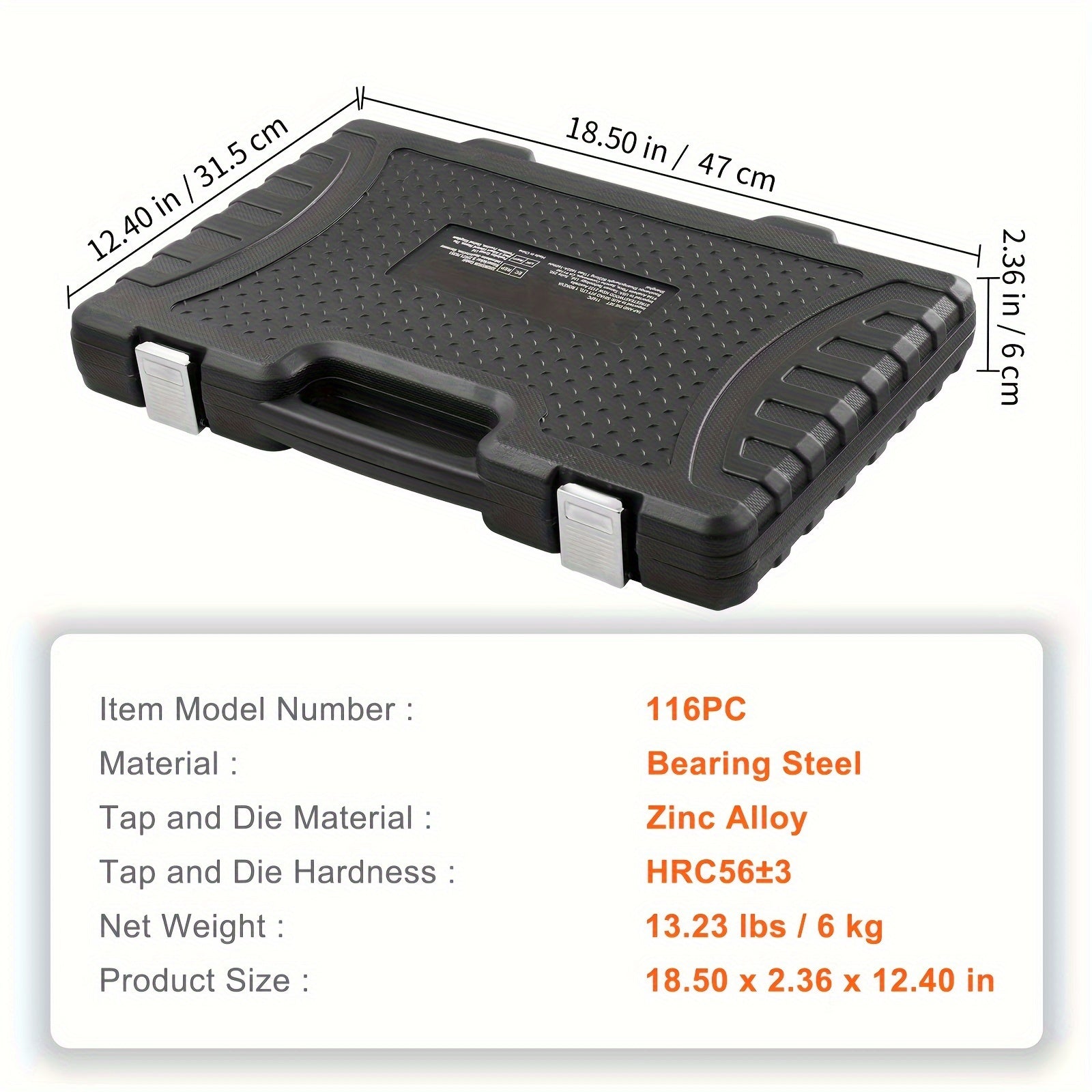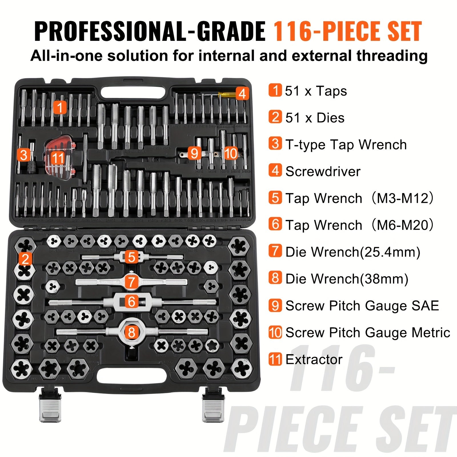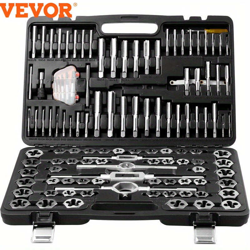 Kit per la filettatura VEVOR, 116 pezzi, combina dimensioni metriche e SAE, resistente costruzione in acciaio per cuscinetti, ideale per la creazione di filetti esterni e interni precisi, include accessori completi e custodia per il trasporto