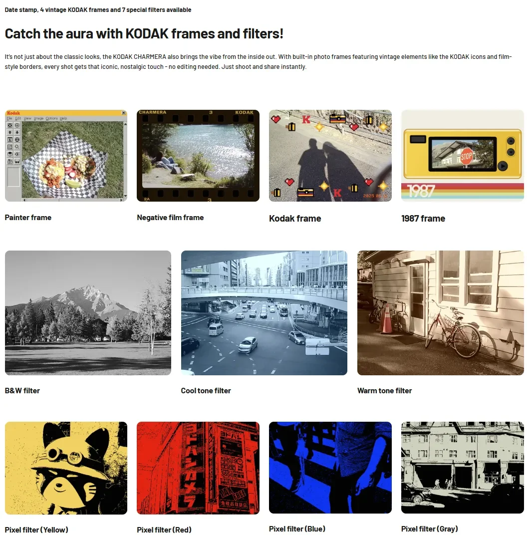 Nel 1987, KODAK ha lanciato la sua prima caratteristica fotocamera monouso, KODAK Fling, con l'obiettivo di promuovere la semplicità della fotografia di punti e riprese.Avanzamento veloce fino ad oggi, il nuovissimo KODAK Charmera reinventa quel fascino retrò con un tocco digitale.Abbastanza compatto da adattarsi al tuo portachiavi e riporta la gioia degli istantanee quotidiane.