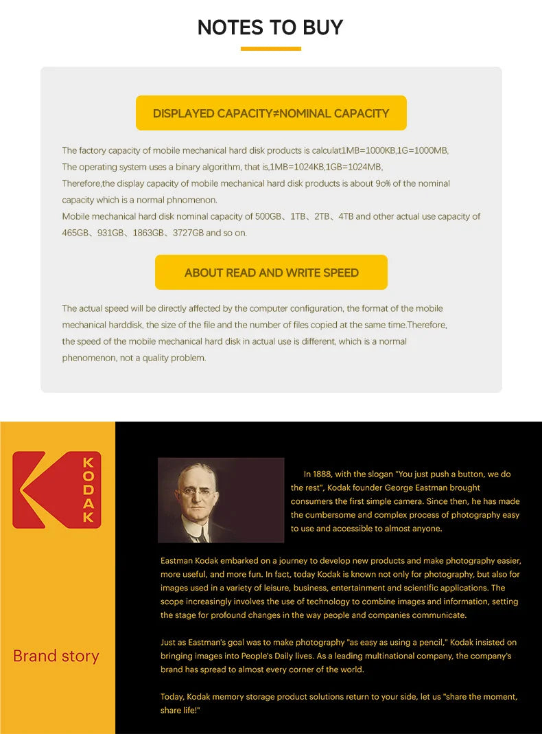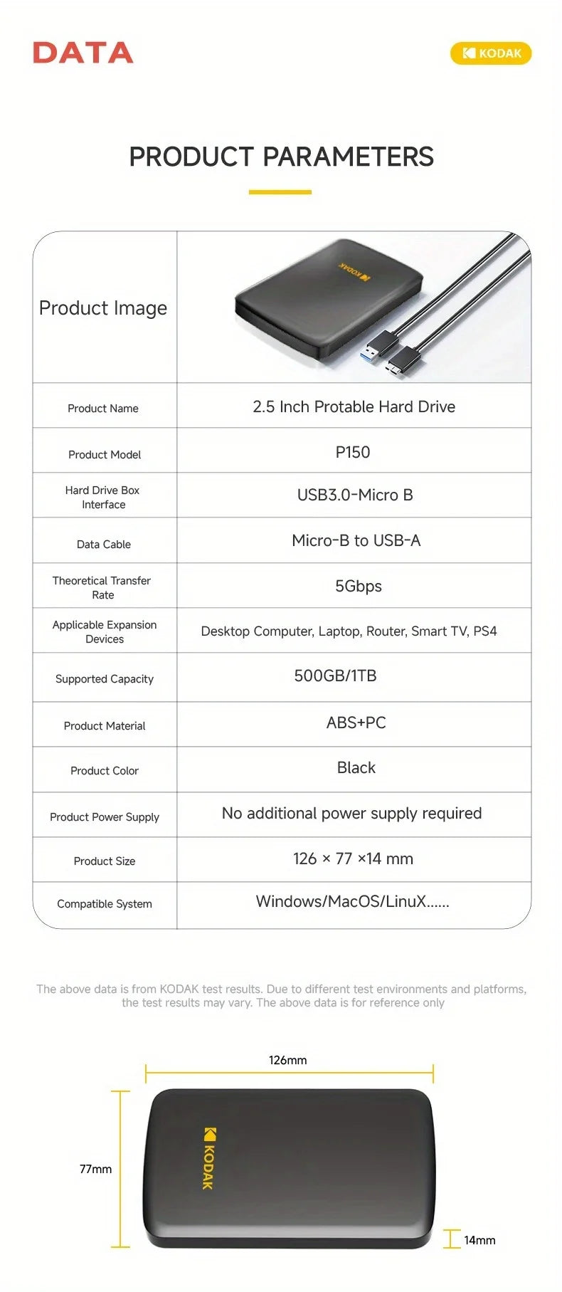 SPECIFICATIONSCapacità dell'HDD: 1 TBChoice: yesMarca: KodakOrigine: CN (Origine)Prodotti chimici ad alto impatto: Nessuno KODAK P150 HDD portatile Enorme capacità Più... Per saperne di più