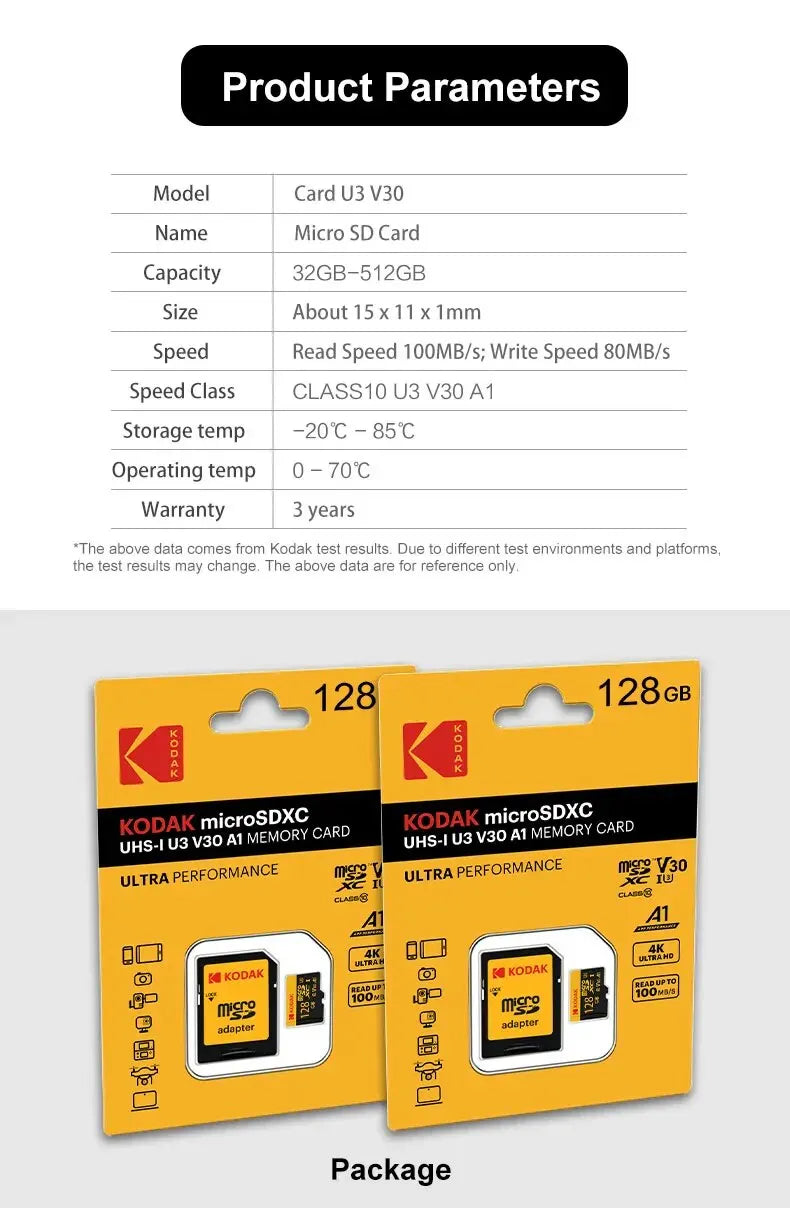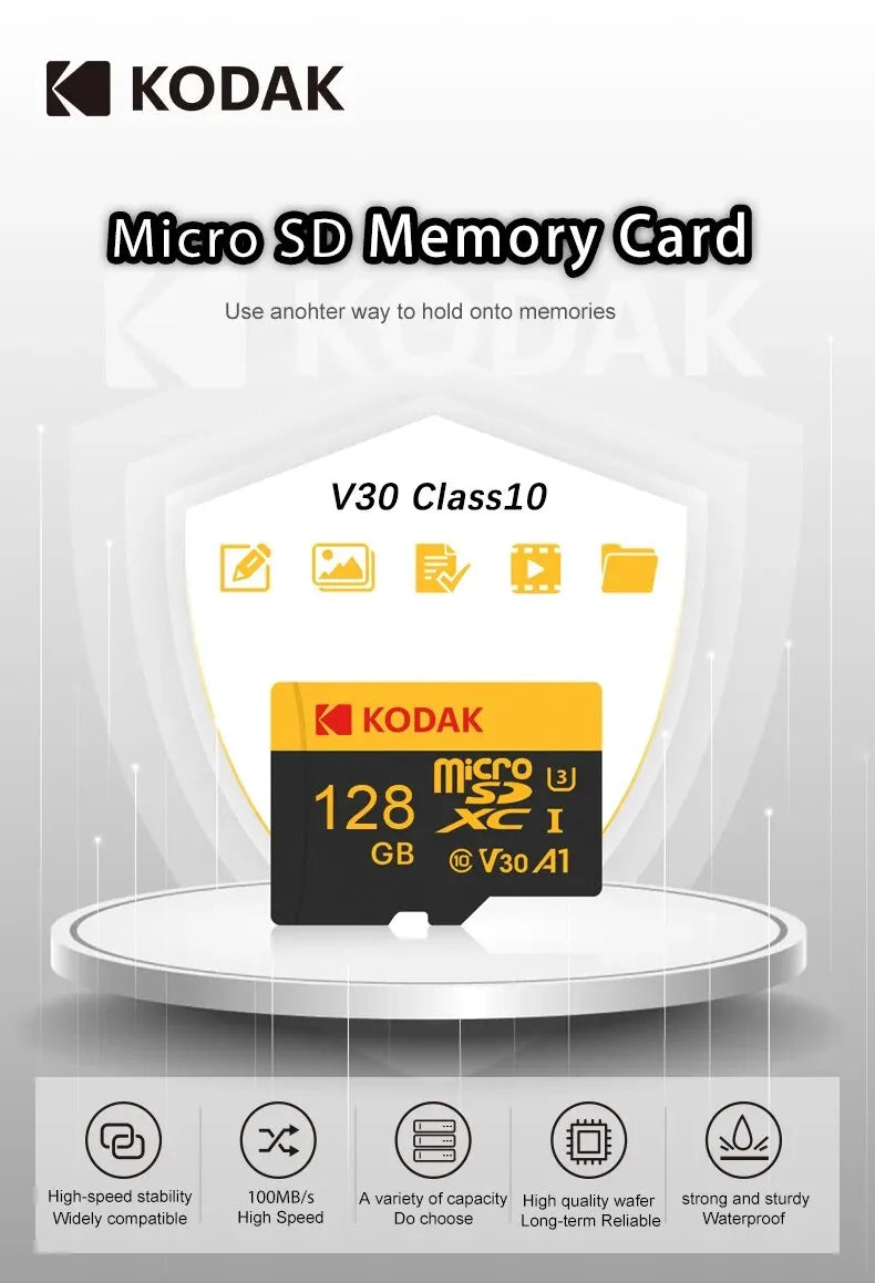 • Elevata capacità di stoccaggio :Questa micro card Kodak offre un'enorme capacità di archiviazione di 128GB, perfetta per la memorizzazione di file, foto, video e altro ancora.