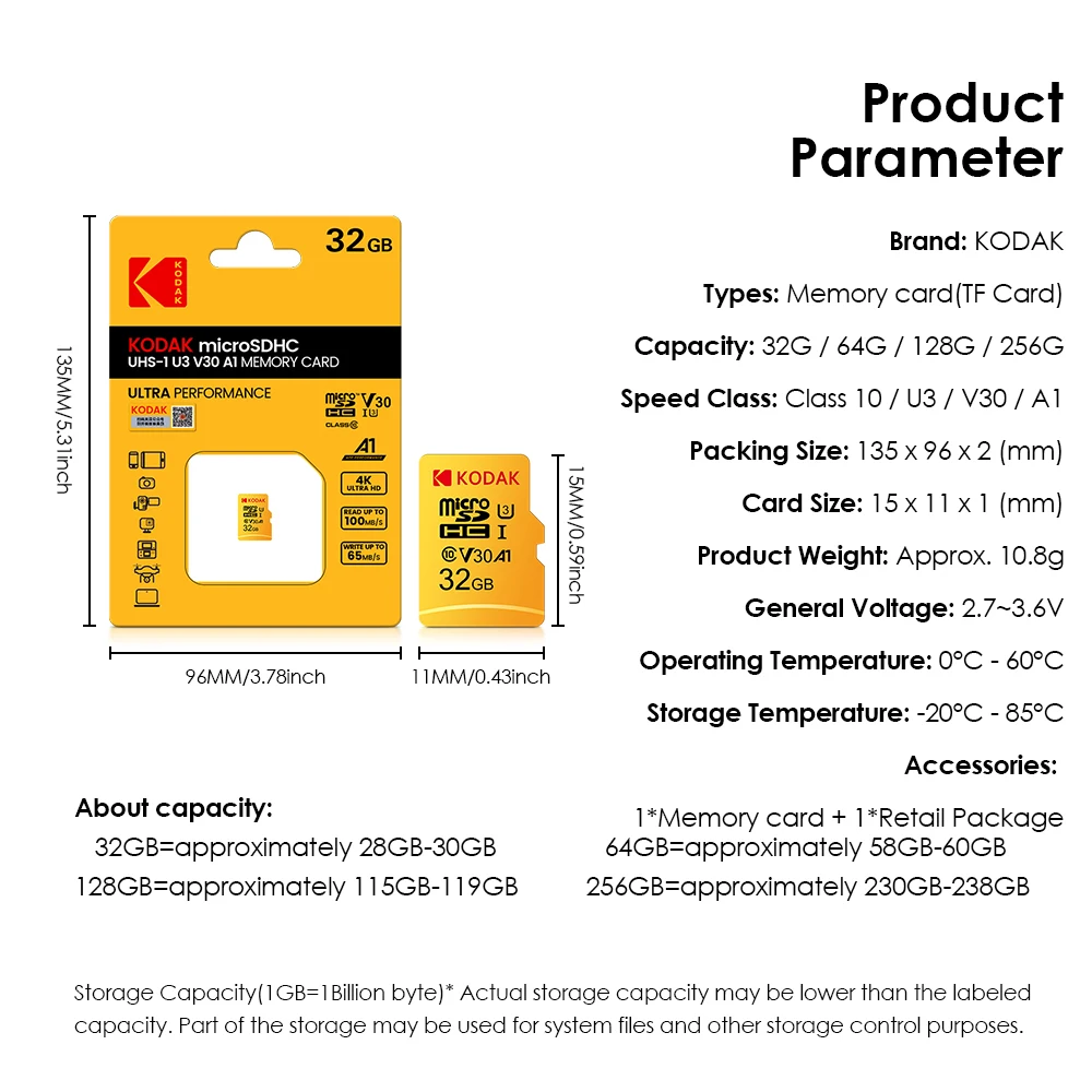 Kodak Micro SD 256GB 128GB U3 e 64GB 32GB C10 Scheda SD Flash Drive Scheda di memoria Classe 10 4K cartao de Memoria Scheda di memoria Micro SD
