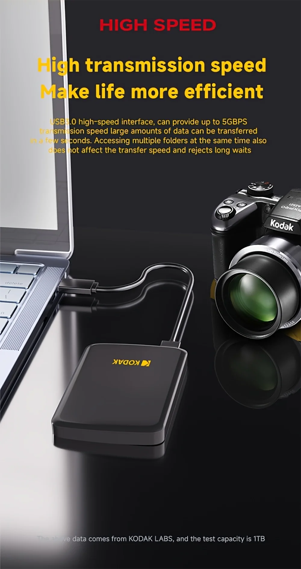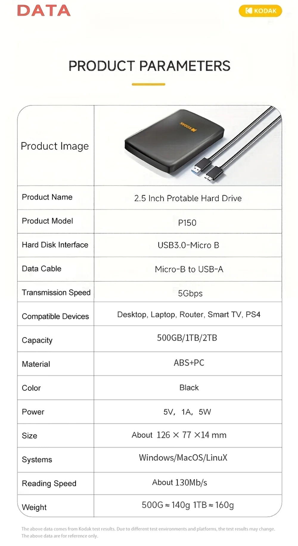 KODAK P150 Disco rigido portatile HDD esterno da 500 GB 5 Gbps HDD da gioco USB 3.0 ad alta velocità 130 MB/s da 2,5 pollici per PS5/PS4/Switch/Laptop