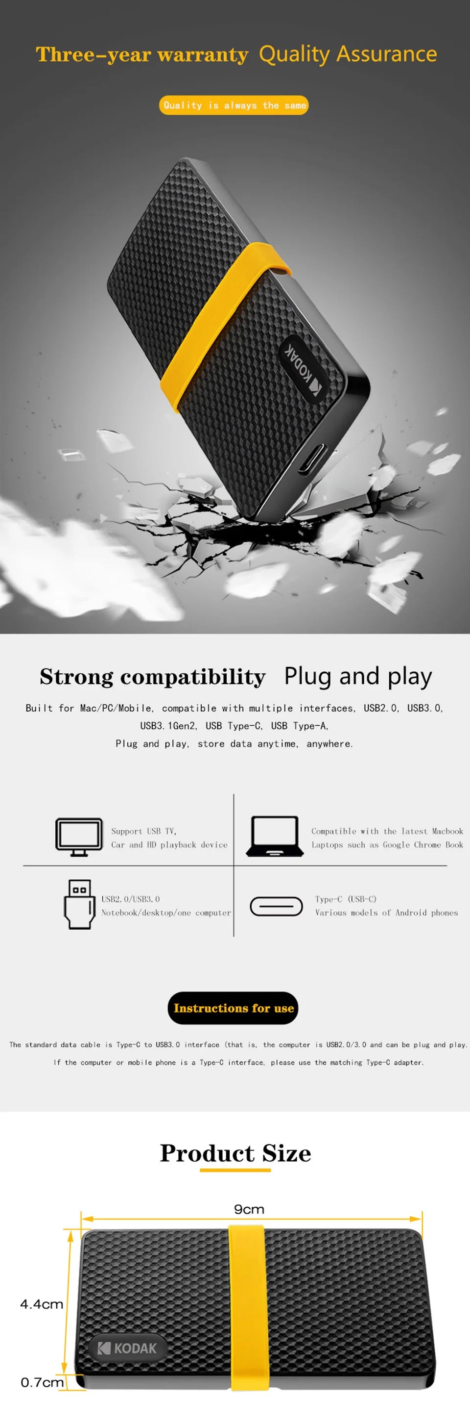 Kodak SSD portatile Type-C USB3.1 Unità a stato solido esterna mobile PSSD 256 GB 512 GB 1 TB 2 TB per laptop Destops PS5 PS4 XBOX TV