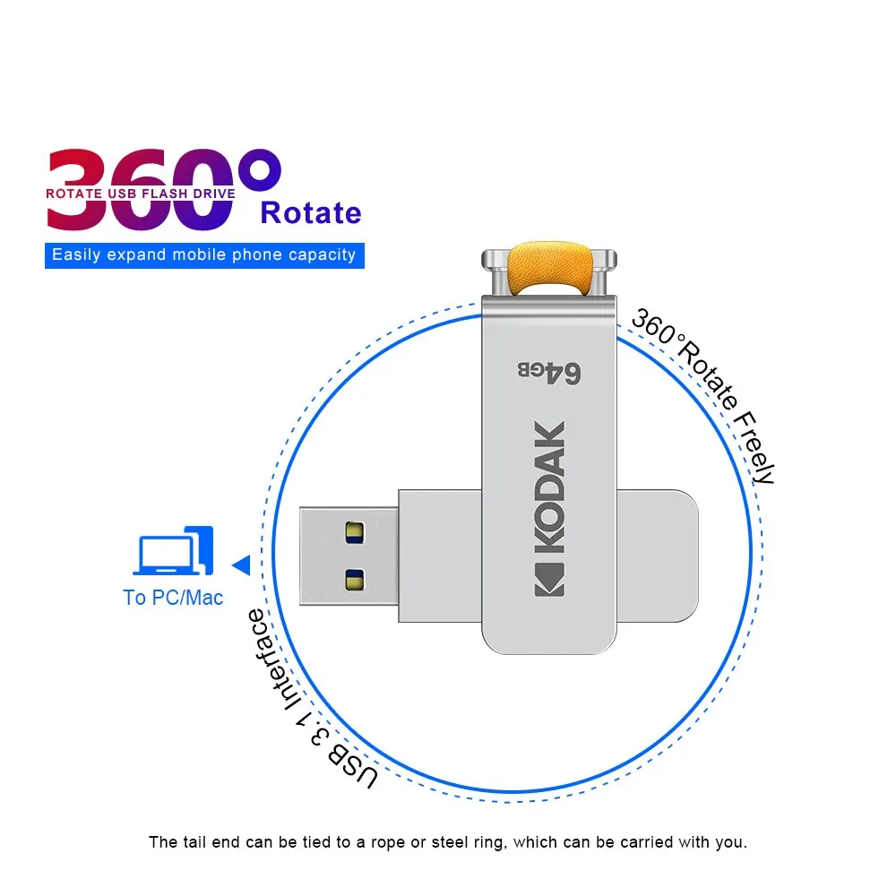 • Interfaccia USB 3.1 ad alta velocità :Sperimenta il trasferimento rapido dei dati con l'interfaccia USB 3.1 dell'unità flash USB KODAK, garantendo una gestione efficiente dei file e backup rapidi.