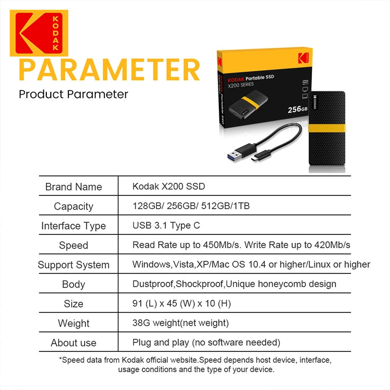 Kodak X200 SSD portatile 1TB 512GB 256GB USB 3.1 Tipo C Disco rigido esterno Gen 2 Disco rigido Unità a stato solido per laptop MacBook