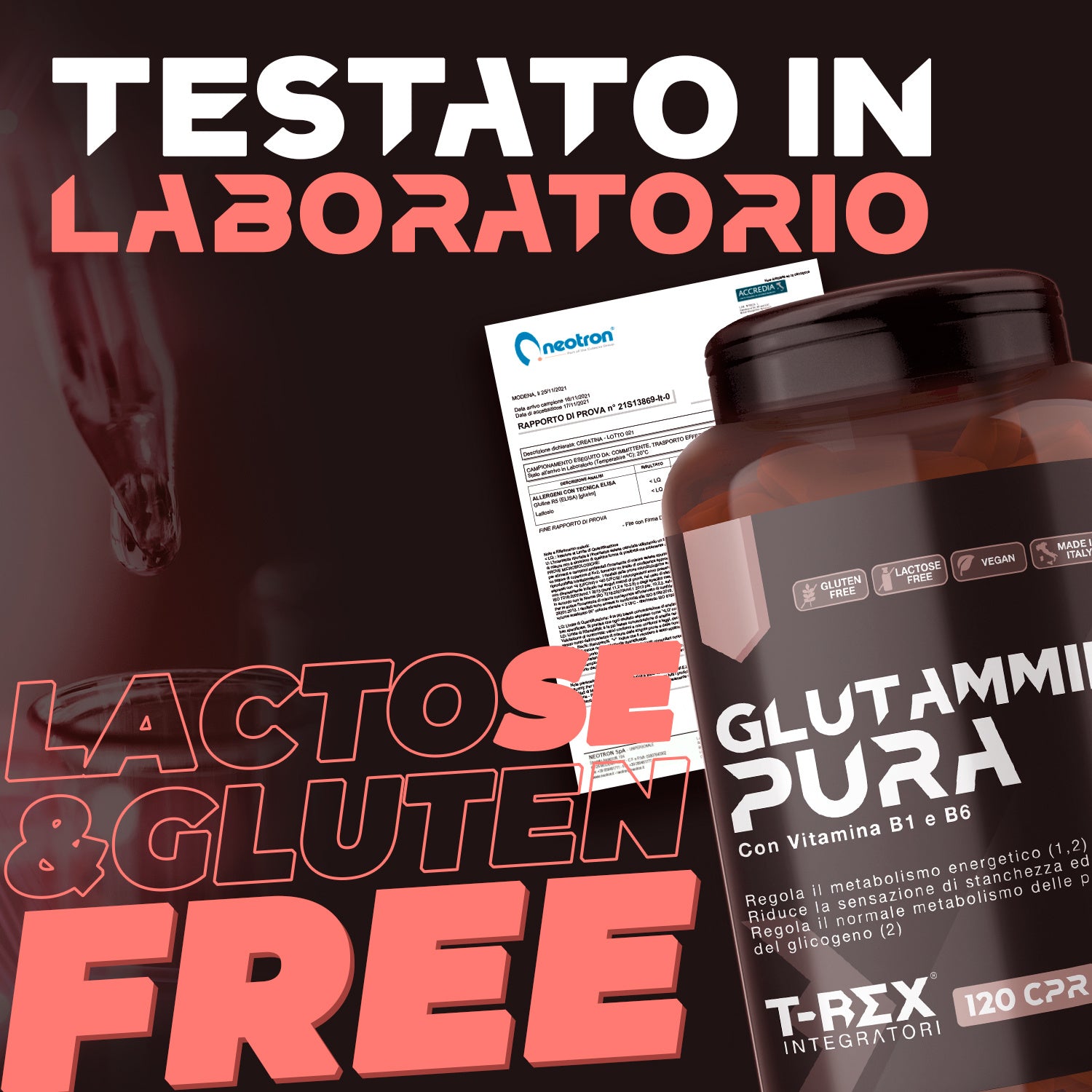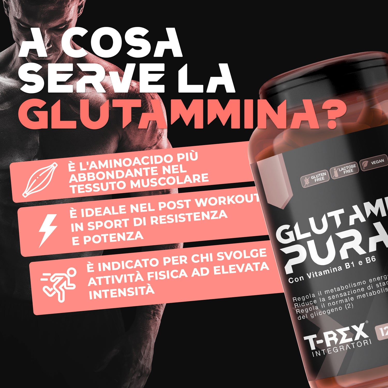 L-Glutammina Pura | Stimola aumento GH ormone della crescita | Diminuisce fatica post allenamento | Integratore di Glutamina Amminoacido Made in Italy | 120 compresse T-Rex Integratori