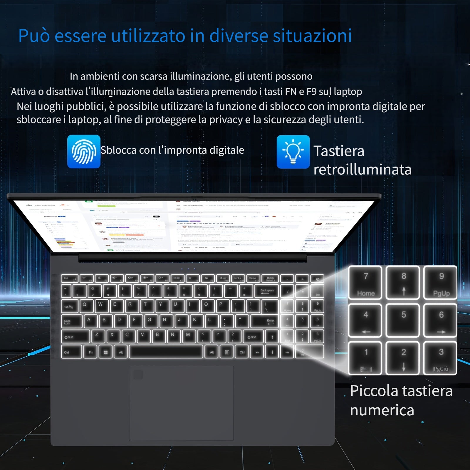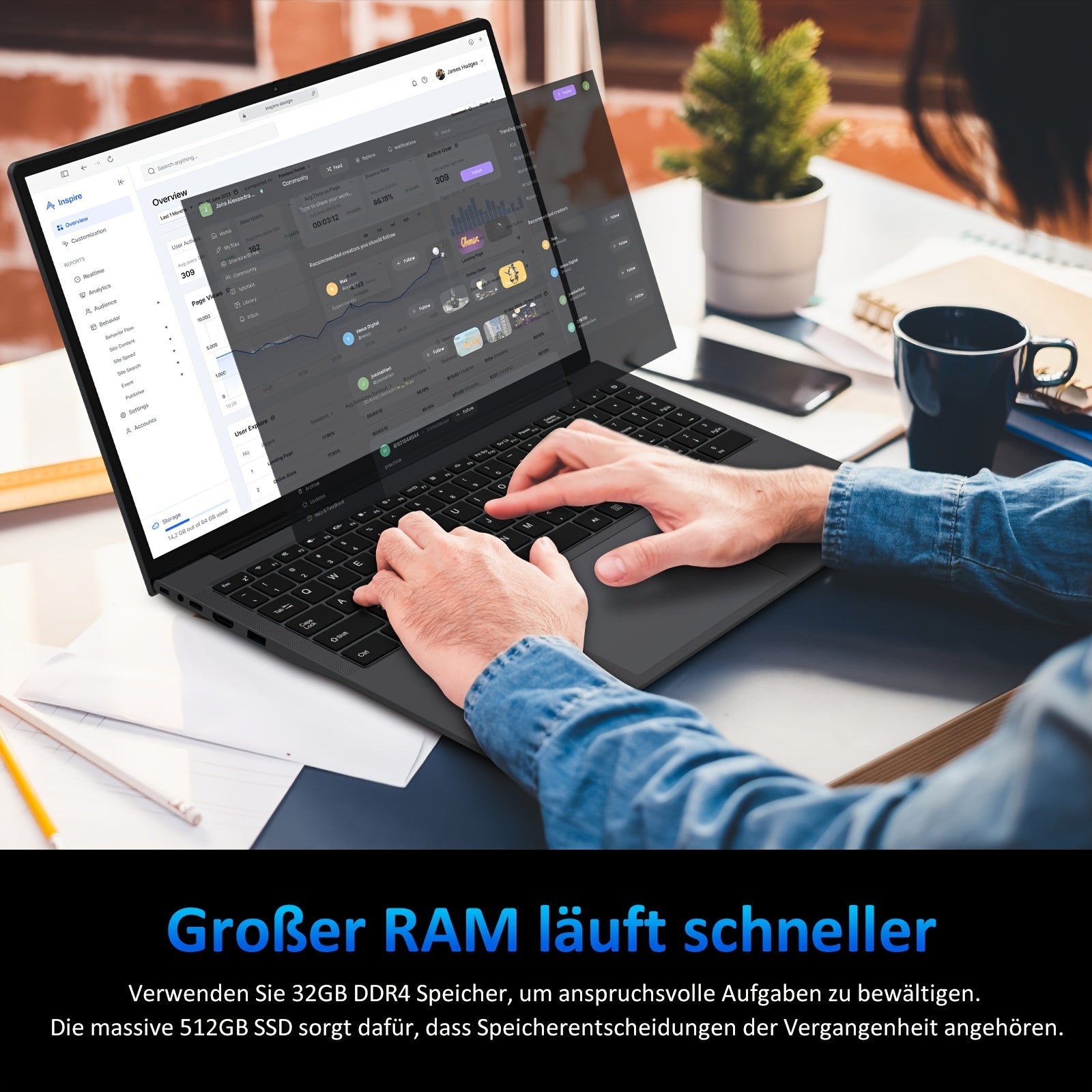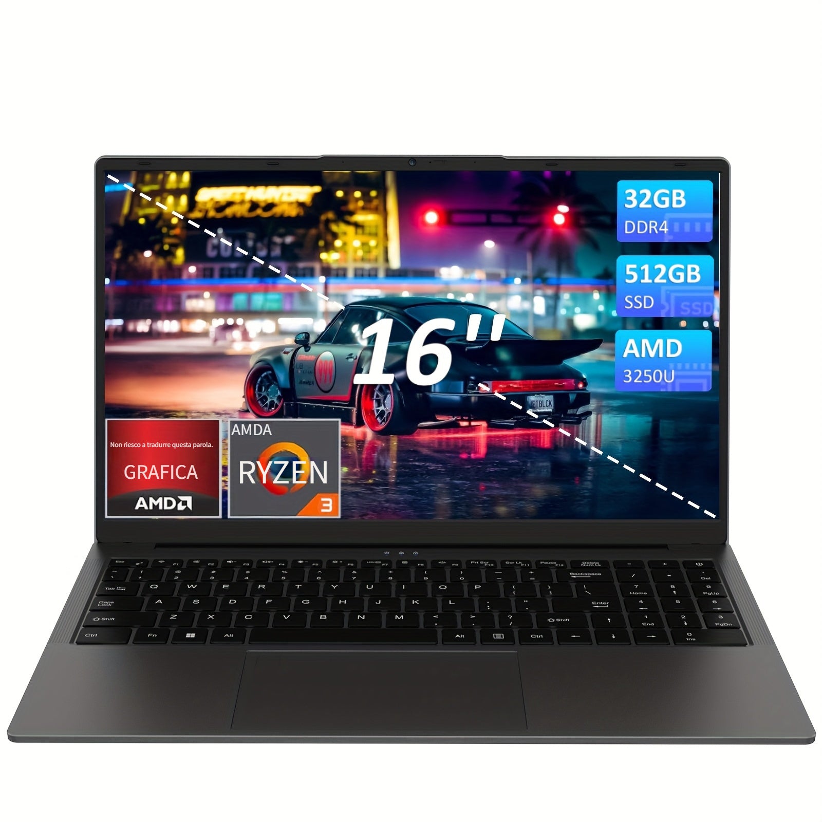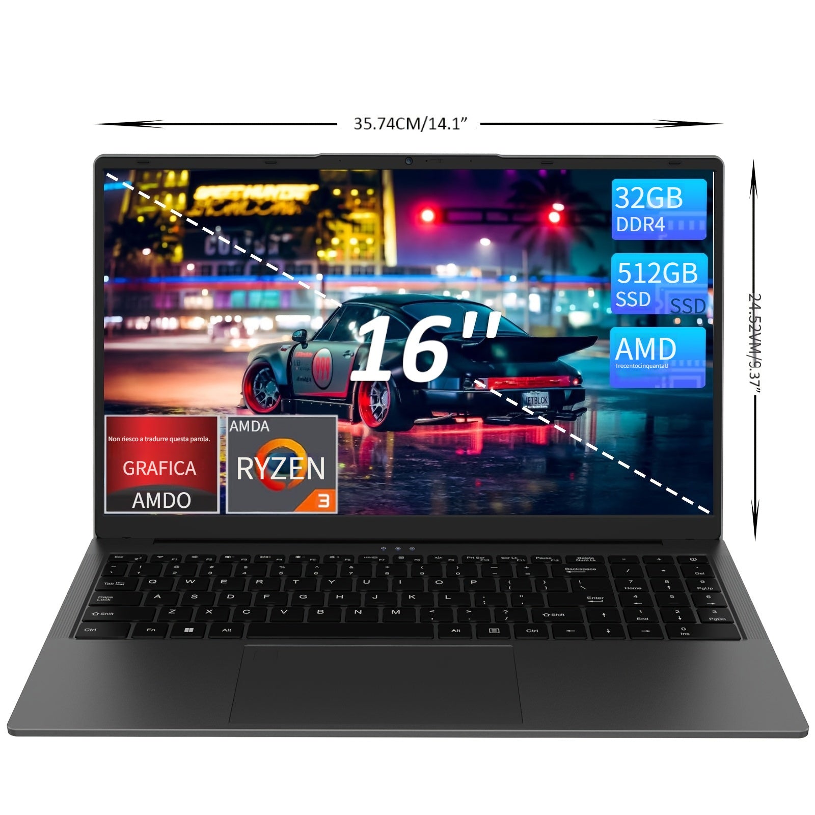 Laptop da 16" per Affari e Studenti con AMD Ryzen3 3250U, 32GB di RAM, SSD da 512GB, WiFi Doppia Banda 5G, Web Cam 1MP, Tastiera Retroilluminata - Design Nero Elegante, Ideale Regalo
