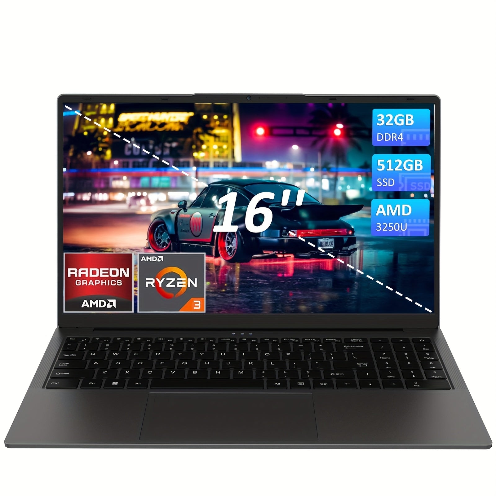 Laptop da 16 pollici per affari e studenti, AMD Ryzen3 3250U, 32GB di RAM, 5 SSD, regalo perfetto, WiFi Dual-Band 5G, fotocamera 1920*1200P 1MP, webcam, tastiera retroilluminata 12GB