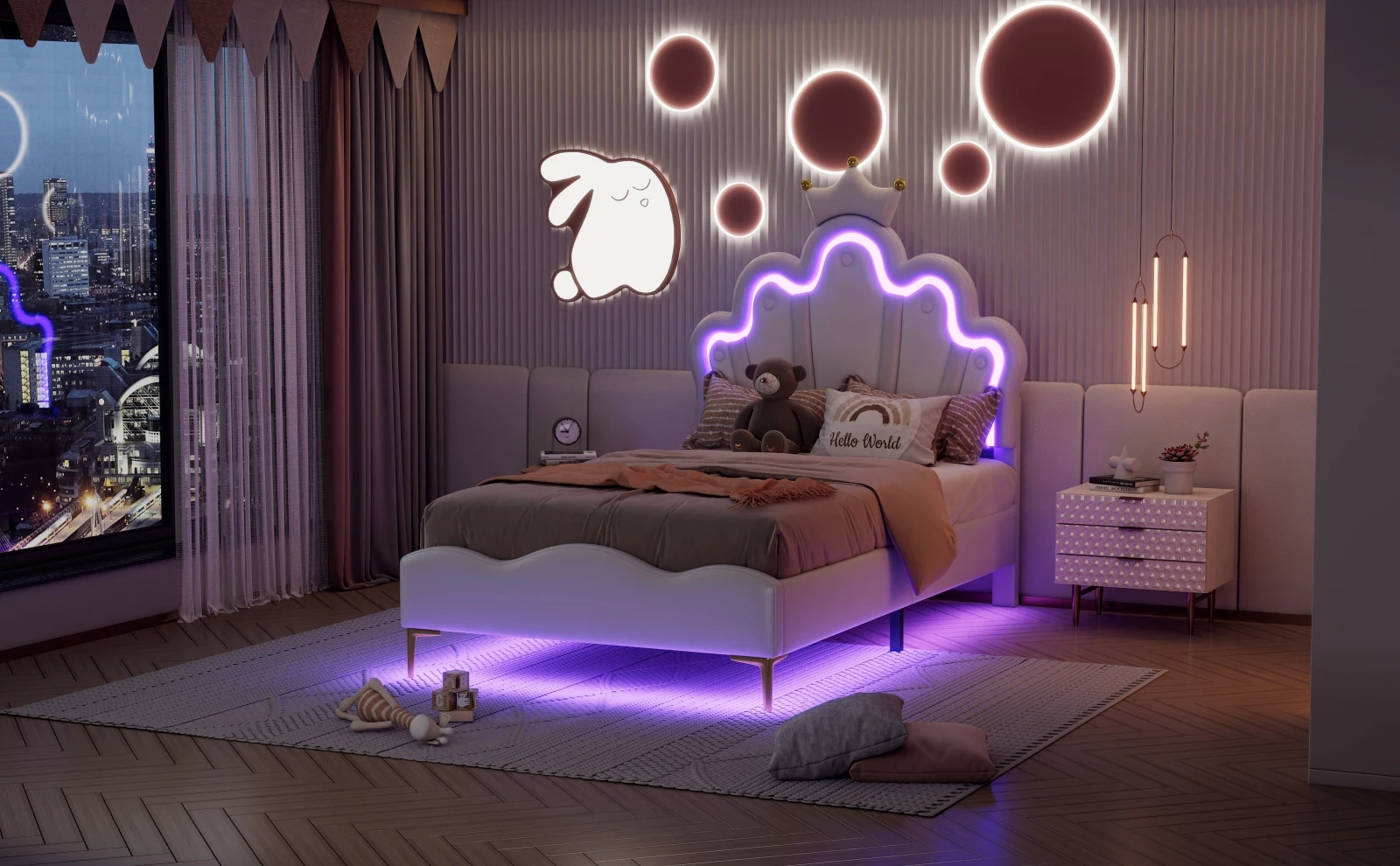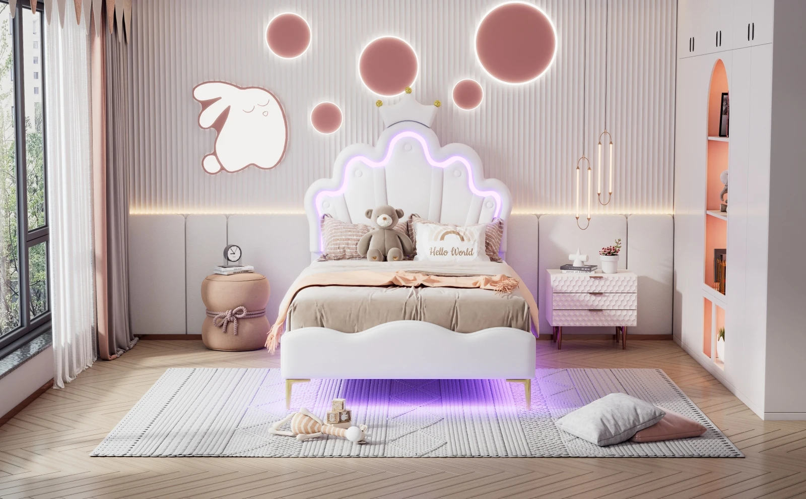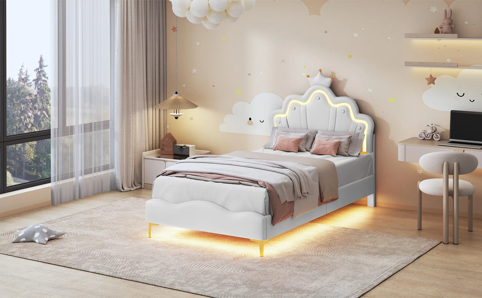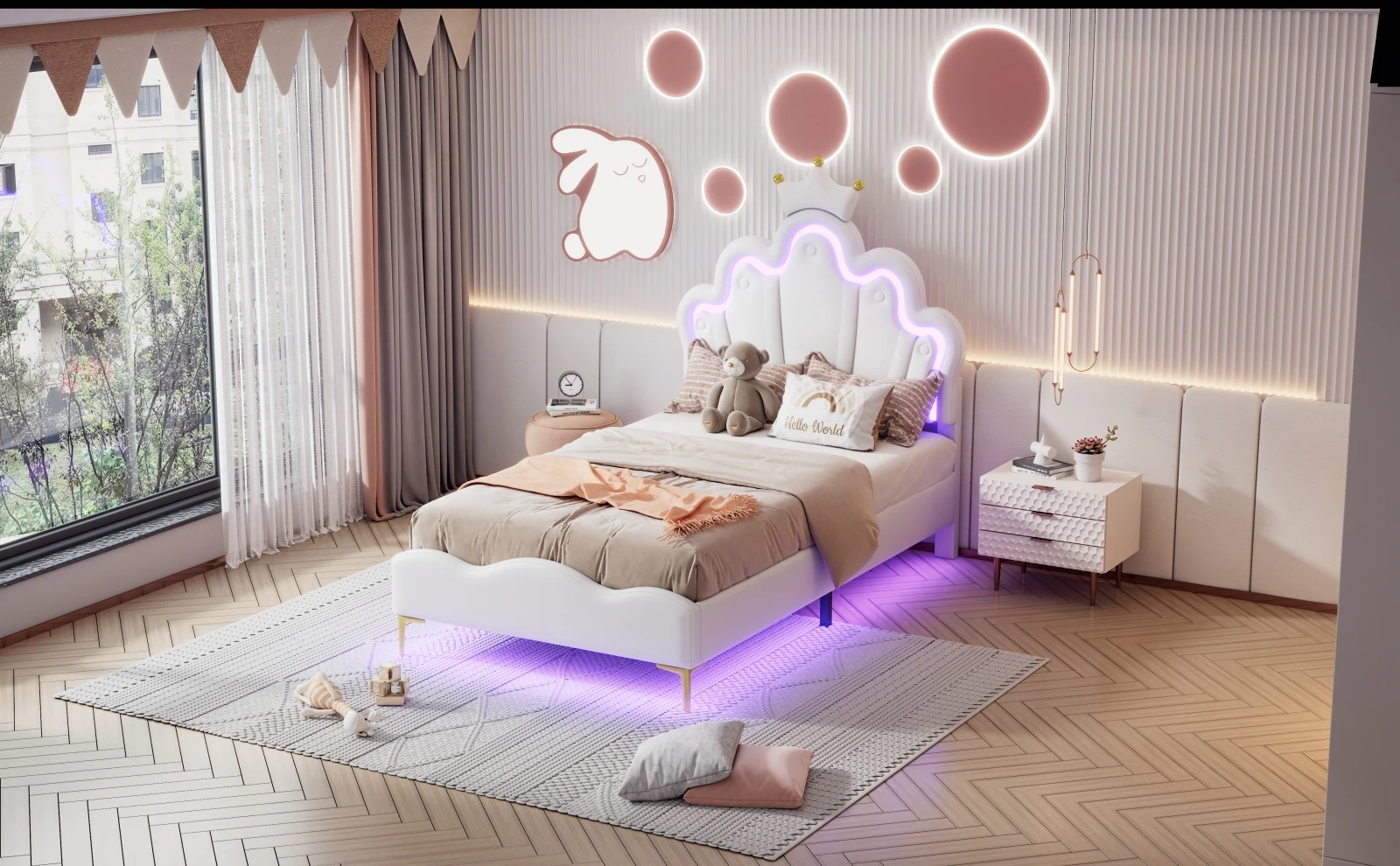 Questo letto per ragazza da 90x200 cm ha un design minimalista e lineare, che incarna uno stile elegante e contemporaneo.La testiera, a forma di nuvola, evoca un'affascinante corona.Morbido e confortevole, crea un'atmosfera diurna nella camera da letto.Il suo design esterno unico dona un tocco di eleganza e novità alla stanza.Il letto è dotato di illuminazione d'atmosfera per la testiera e la struttura, ed è fornito di un telecomando per una facile regolazione dell'illuminazione.Realizzato con materiali di alta qualità, questo lettino per bambini garantisce robustezza e stabilità.Così non dovrai preoccuparti di danneggiare la struttura, anche se tuo figlio ci salta sopra.I suoi robusti supporti garantiscono una manutenzione sicura e un ambiente di sonno stabile.L'intero letto è progettato con eleganza e gusto, aggiungendo un tocco di lusso alla cameretta del tuo bambino.