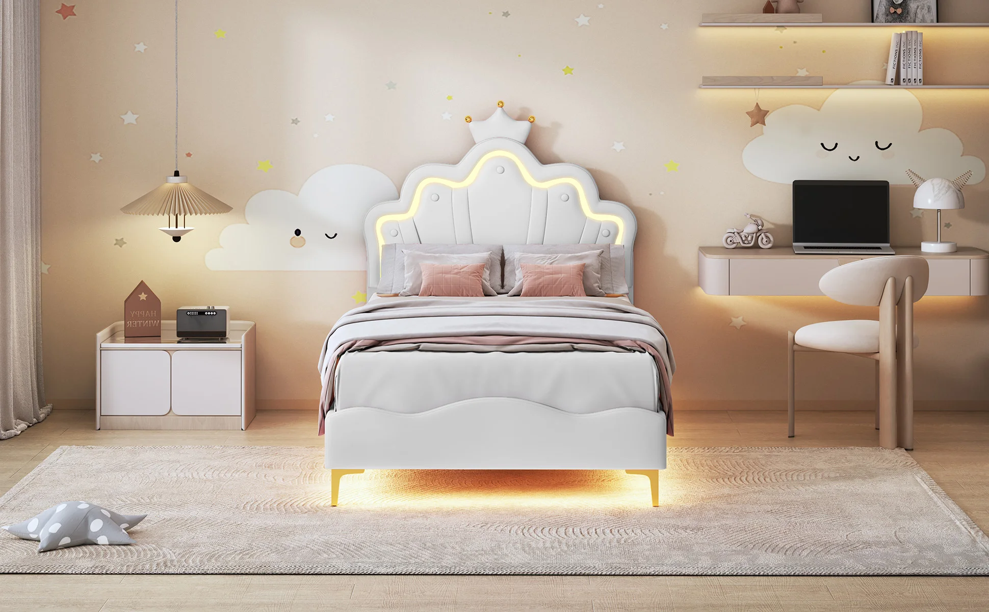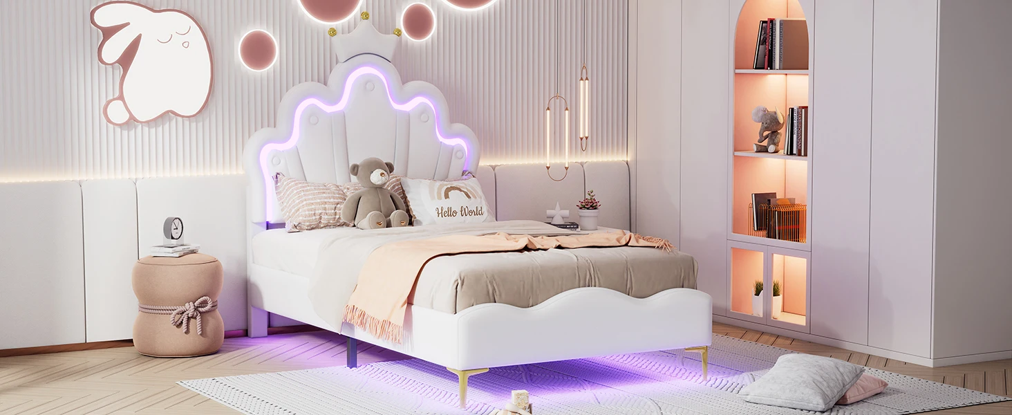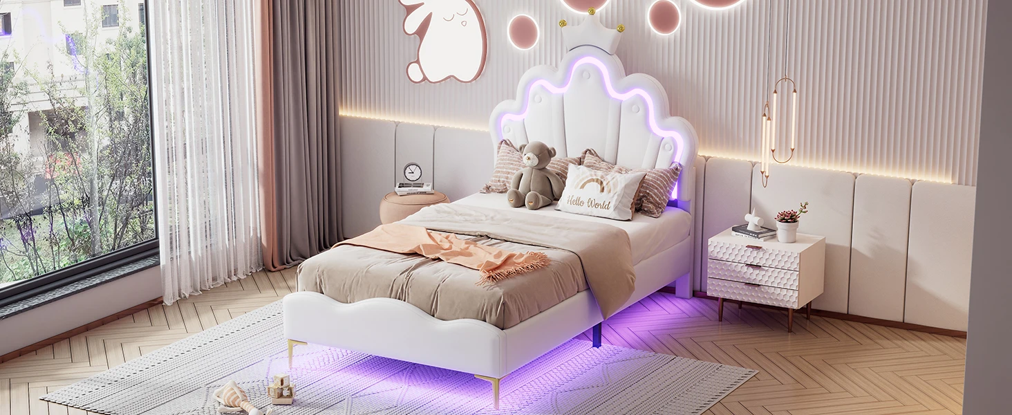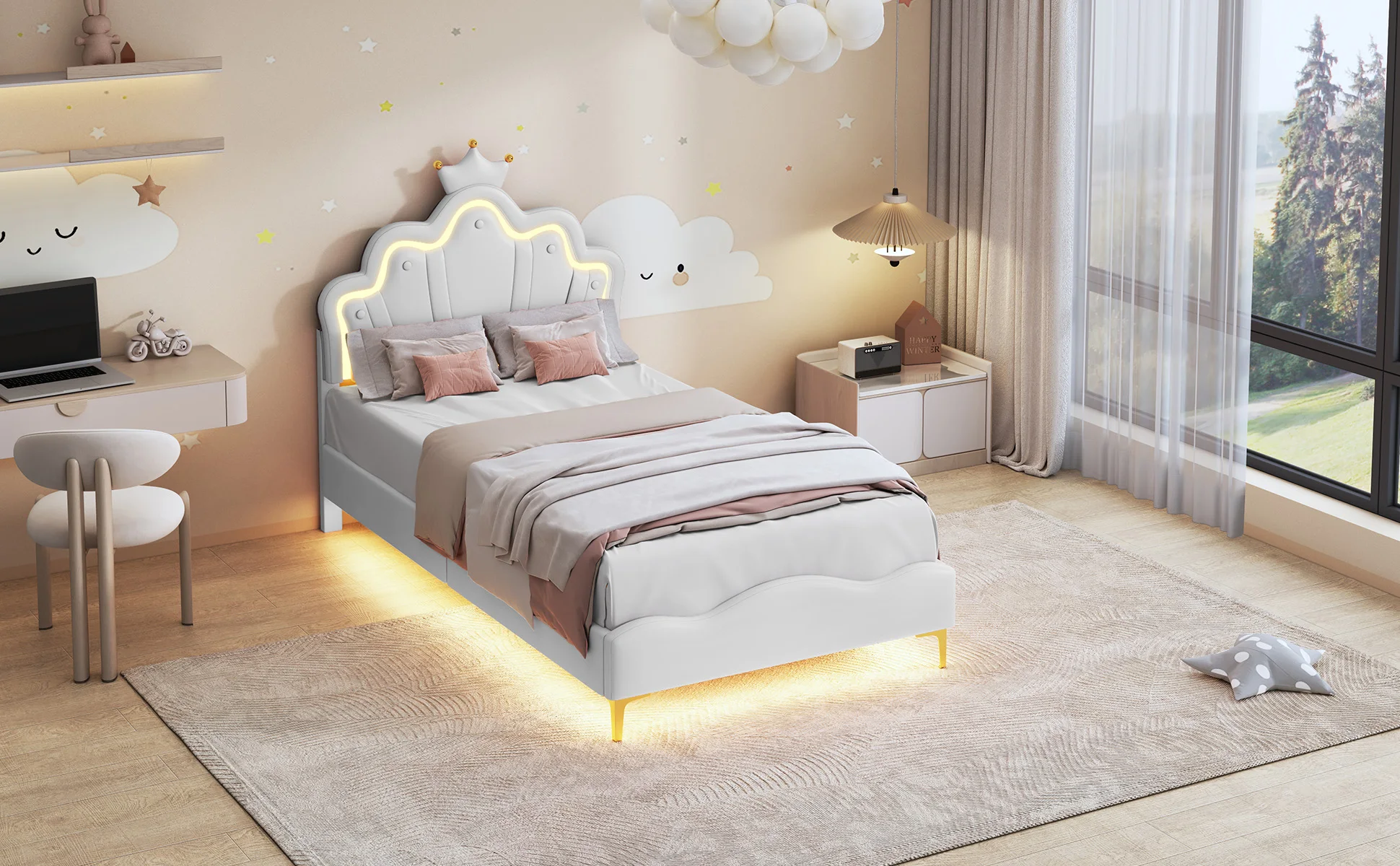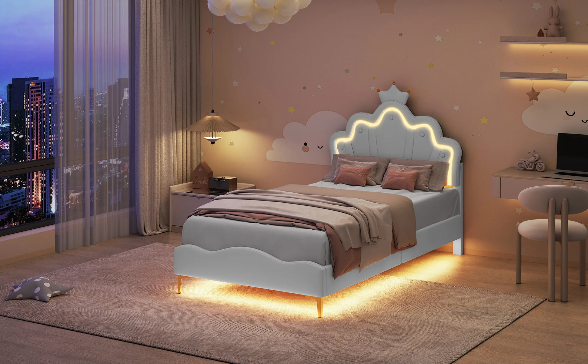 Questo letto per ragazza da 90x200 cm ha un design minimalista e lineare, che incarna uno stile elegante e contemporaneo.La testiera, a forma di nuvola, evoca un'affascinante corona.Morbido e confortevole, crea un'atmosfera diurna nella camera da letto.Il suo design esterno unico dona un tocco di eleganza e novità alla stanza.Il letto è dotato di illuminazione d'atmosfera per la testiera e la struttura, ed è fornito di un telecomando per una facile regolazione dell'illuminazione.Realizzato con materiali di alta qualità, questo lettino per bambini garantisce robustezza e stabilità.Così non dovrai preoccuparti di danneggiare la struttura, anche se tuo figlio ci salta sopra.I suoi robusti supporti garantiscono una manutenzione sicura e un ambiente di sonno stabile.L'intero letto è progettato con eleganza e gusto, aggiungendo un tocco di lusso alla cameretta del tuo bambino.