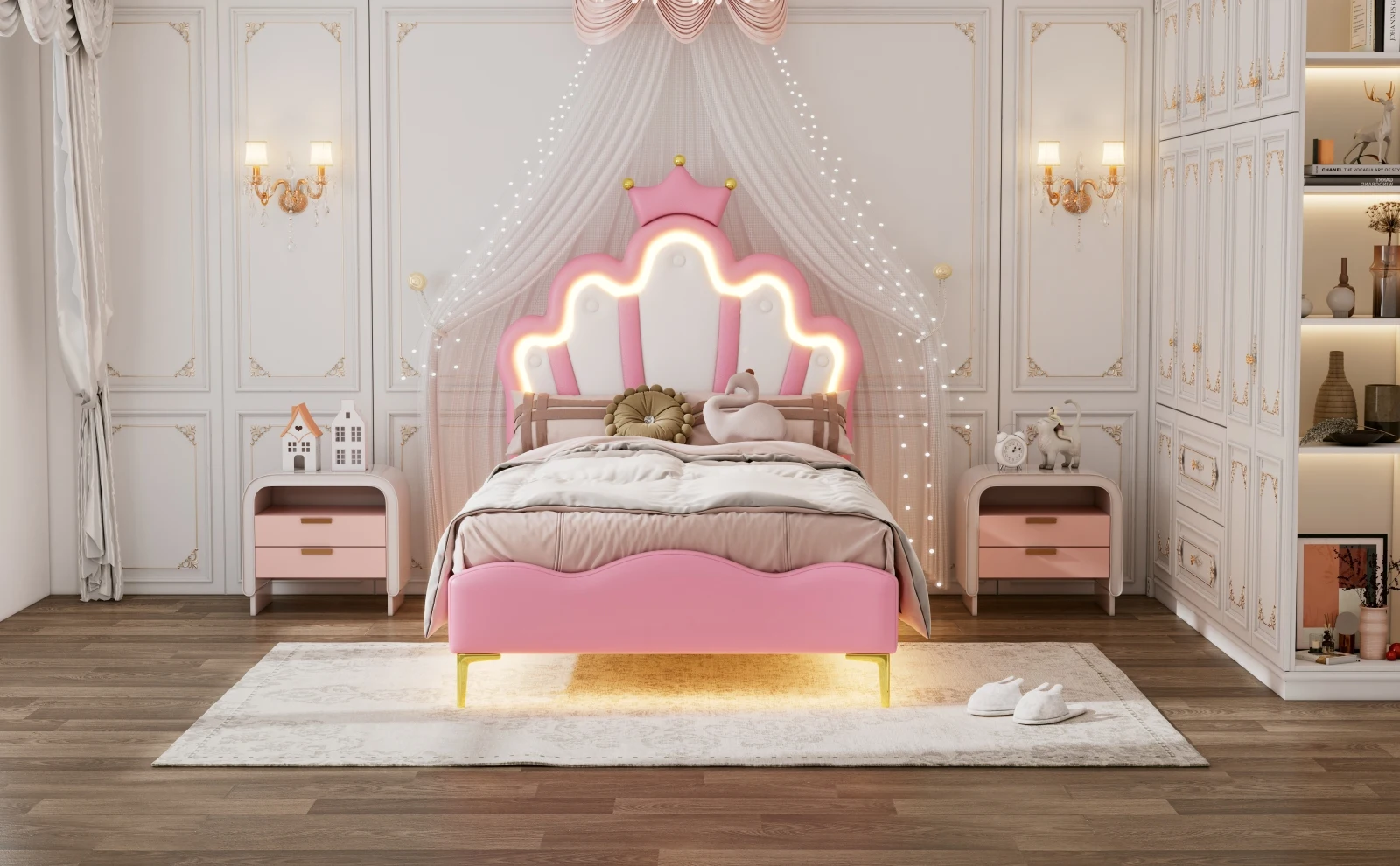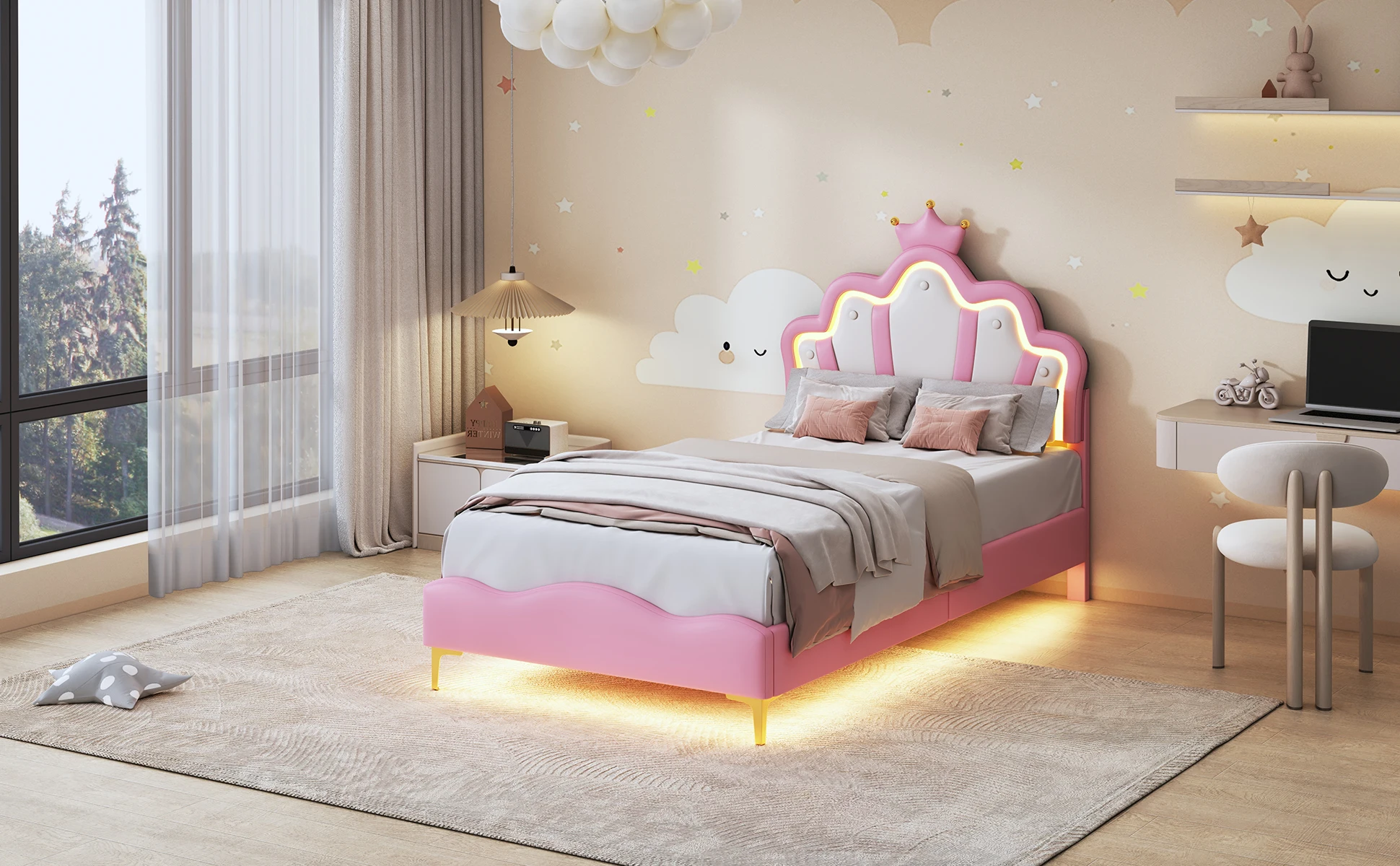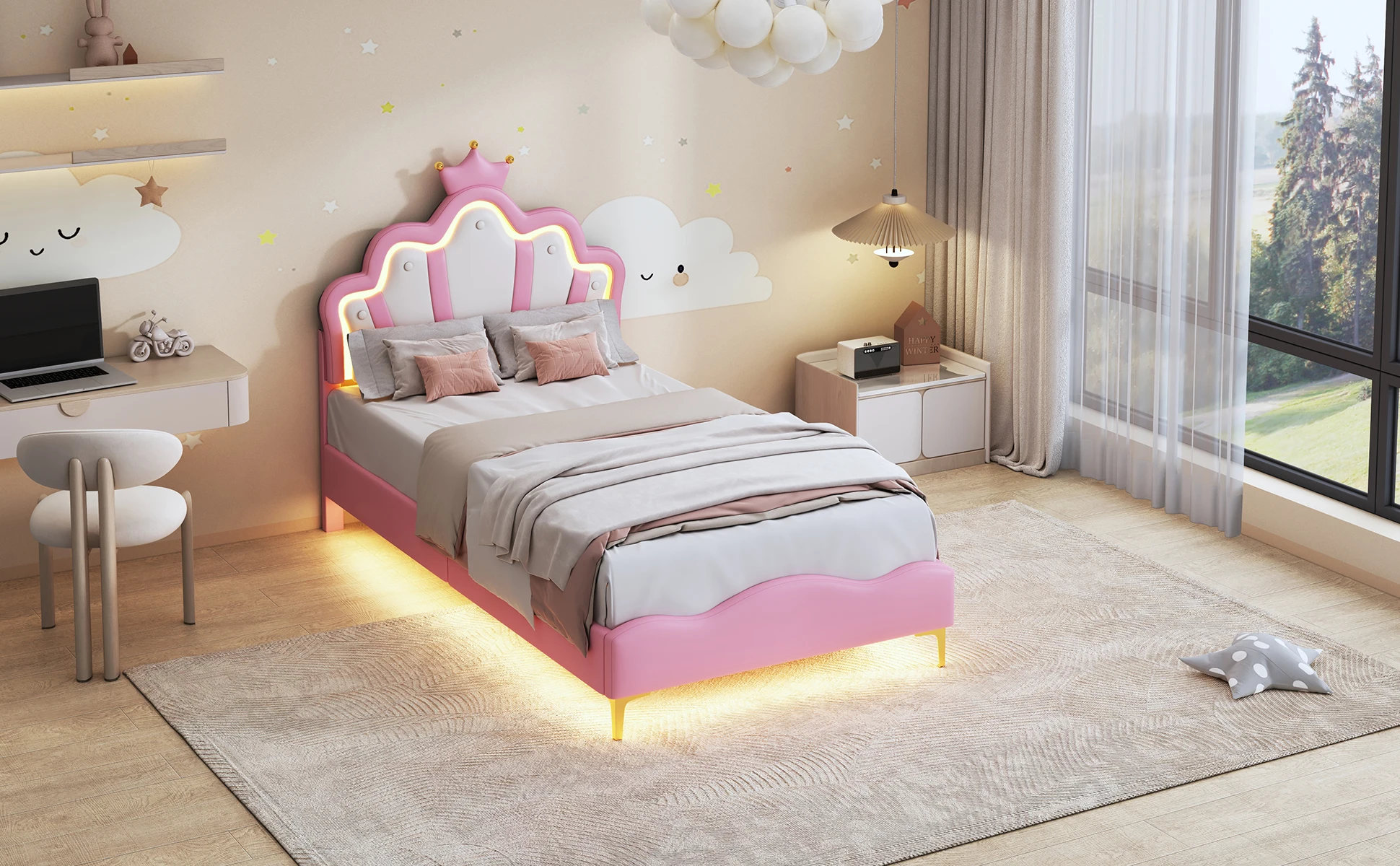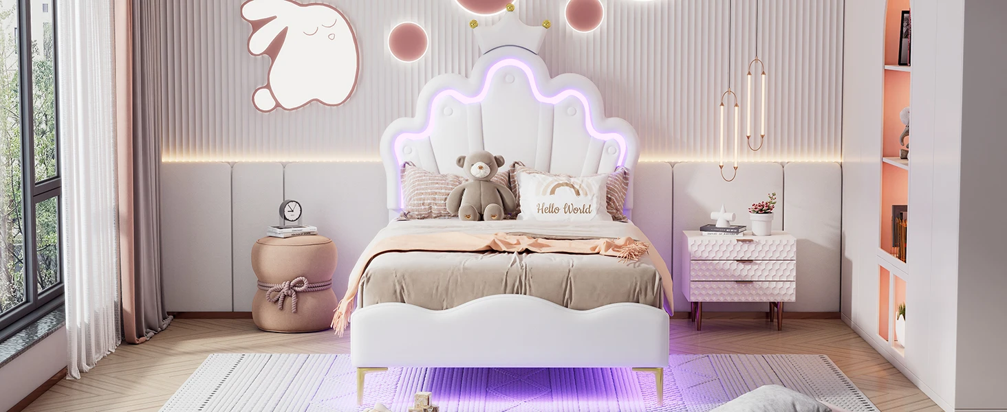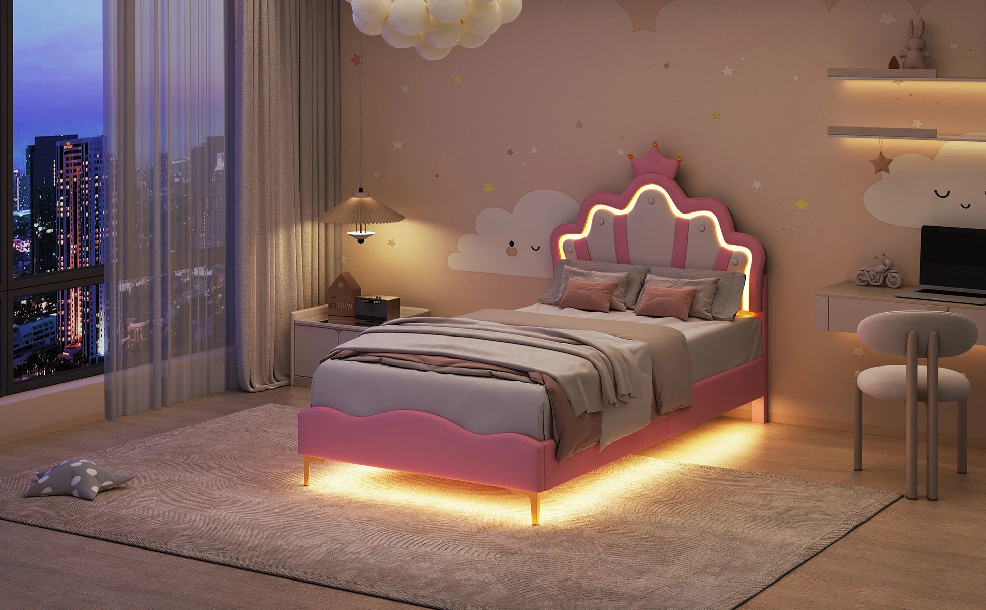 Questo letto per ragazza da 90x200 cm ha un design minimalista e lineare, che incarna uno stile elegante e contemporaneo.La testiera, a forma di nuvola, evoca un'affascinante corona.Morbido e confortevole, crea un'atmosfera diurna nella camera da letto.Il suo design esterno unico dona un tocco di eleganza e novità alla stanza.Il letto è dotato di illuminazione d'atmosfera per la testiera e la struttura, ed è fornito di un telecomando per una facile regolazione dell'illuminazione.Realizzato con materiali di alta qualità, questo lettino per bambini garantisce robustezza e stabilità.Così non dovrai preoccuparti di danneggiare la struttura, anche se tuo figlio ci salta sopra.I suoi robusti supporti garantiscono una manutenzione sicura e un ambiente di sonno stabile.L'intero letto è progettato con eleganza e gusto, aggiungendo un tocco di lusso alla cameretta del tuo bambino.