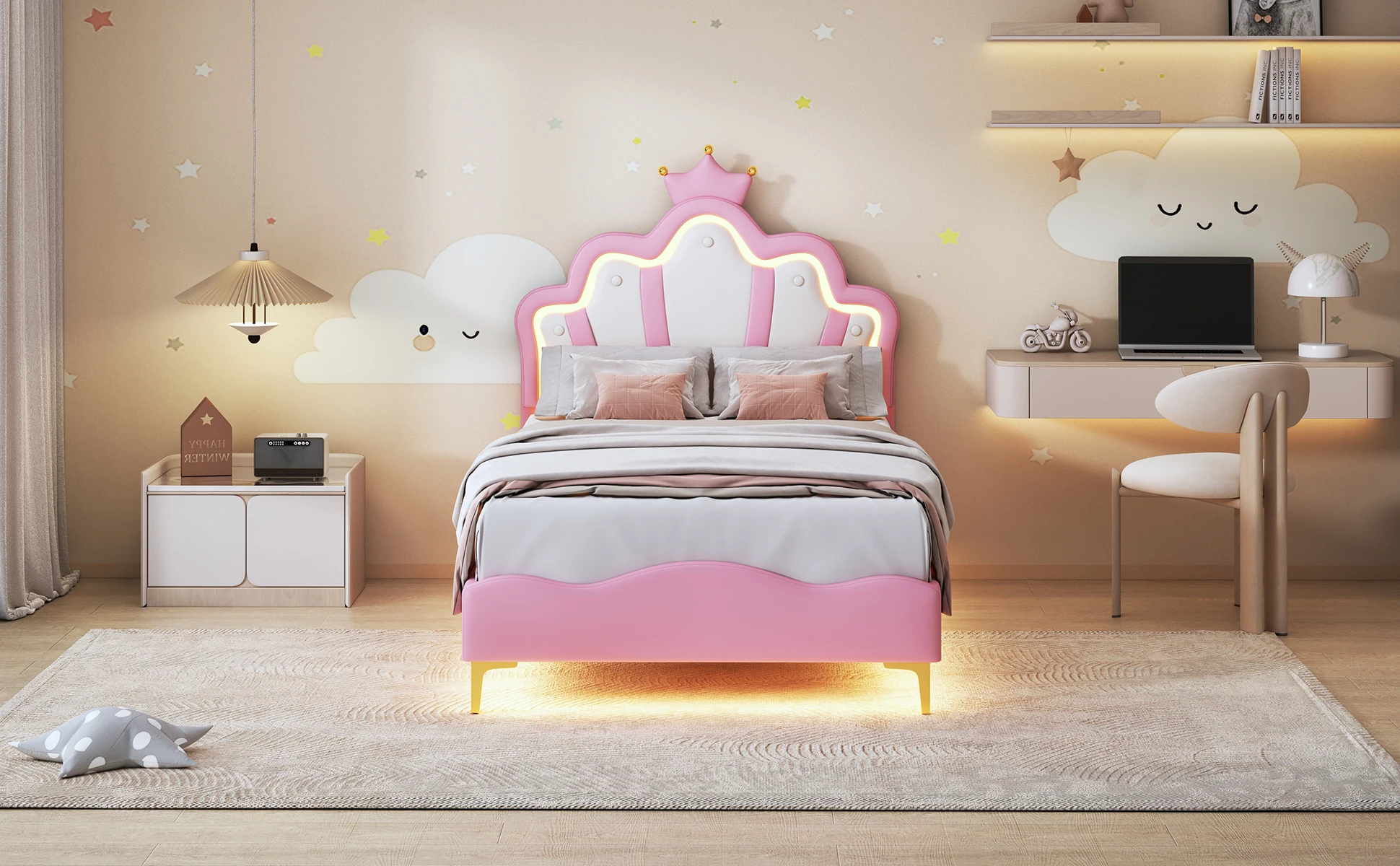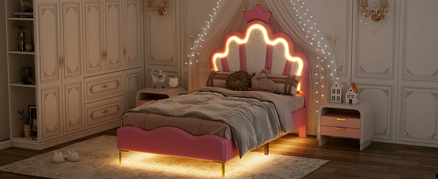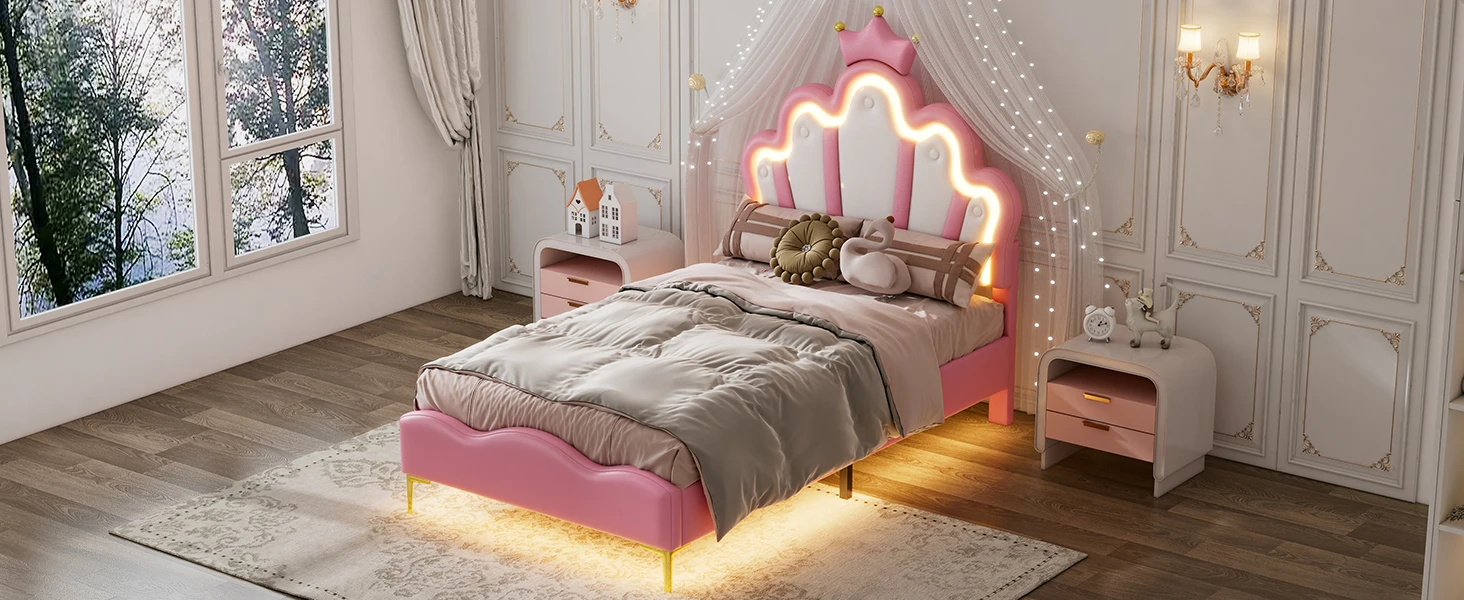 Insieme a stile e funzionalità, questo letto semplice si adatta perfettamente a diversi stili di decorazione d'interni.La sua elegante struttura letto, con delicate tonalità di rosa e bianco, unisce stile e funzionalità.La testiera di questo letto imbottito per BAMBINI è regolabile in altezza, adattandosi facilmente alla taglia del tuo bambino.Il letto è rivestito in pelle PU, un materiale resistente all'acqua e facile da pulire, che semplifica la manutenzione quotidiana.Che tu preferisca uno stile moderno e minimalista o un classico stile europeo, questa struttura letto per bambina si integrerà perfettamente nel tuo arredamento, aggiungendo un tocco di eleganza e romanticismo.