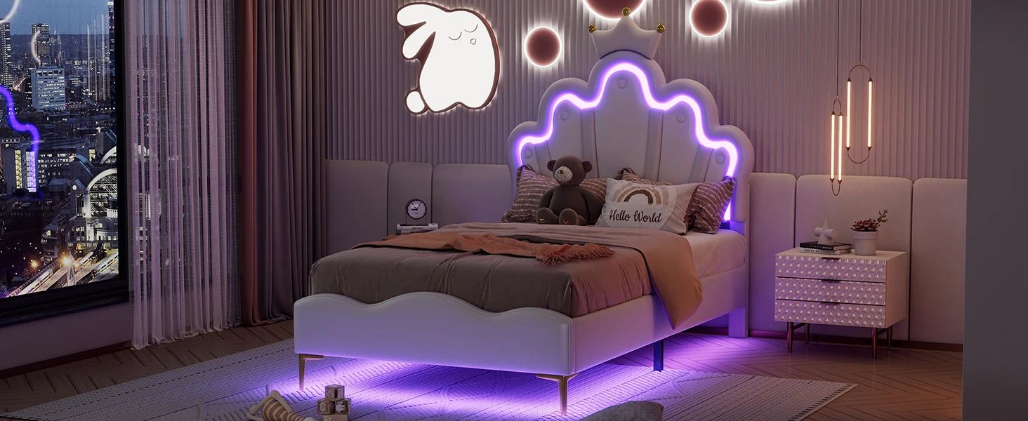 【Illuminazione a LED e testiera regolabile】La testiera Princess da 90x200 cm è dotata di strisce luminose LED integrate, controllabili tramite telecomando o app per smartphone.Puoi regolare il colore, la luminosità, la modalità musica, il timer e altro ancora.I bambini potranno così personalizzare il proprio spazio per dormire grazie alle diverse modalità di illuminazione, per notti più divertenti e fantasiose.L'altezza della testiera è regolabile per soddisfare le preferenze di tutti e garantire un comfort ottimale per la lettura o il riposo.