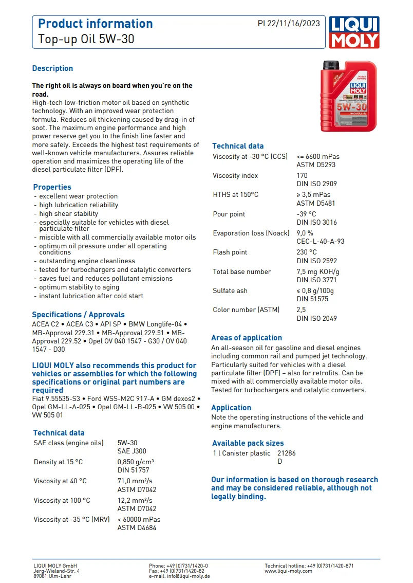 SPECIFICATIONSMarca: NSOUROrigine: DE(Origine)Prodotti chimici ad alto impatto: NessunoTipo: Altro LIQUI MOLY Olio top-up 5W-30 1L una bottiglia Per... Per saperne di più