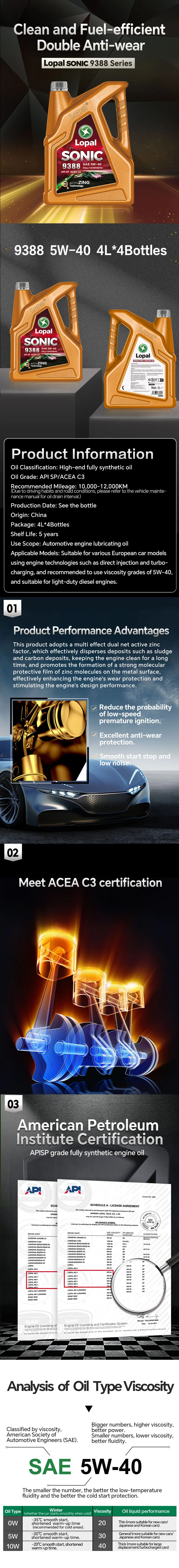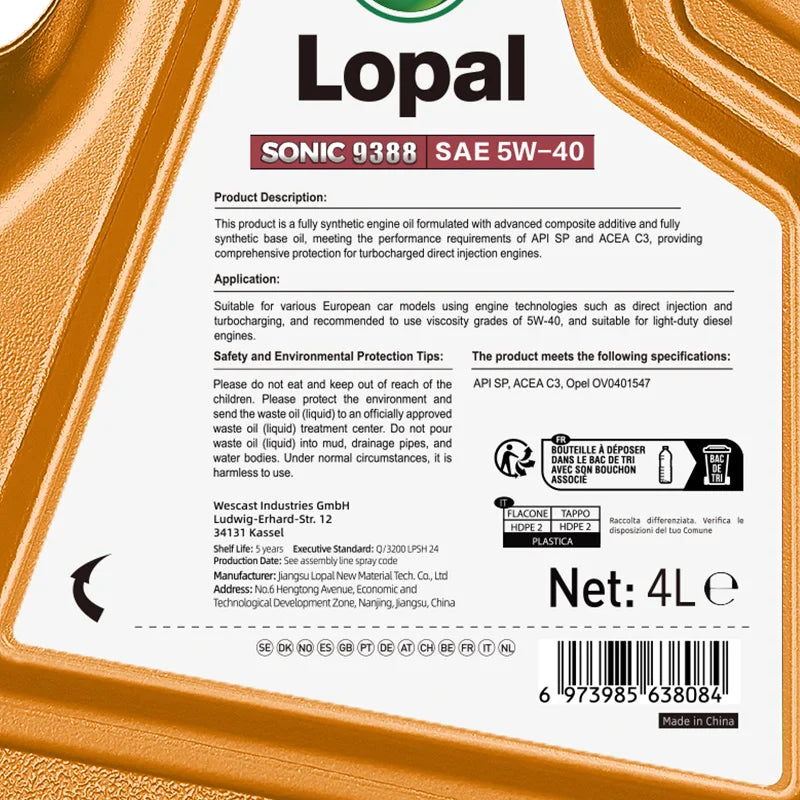 Lopal SONIC 9388 5W-40 C3 SP 4L * 4 boot Car Engine Oil 16L Lubrificante Olio motore completamente sintetico per auto, camion e veicoli