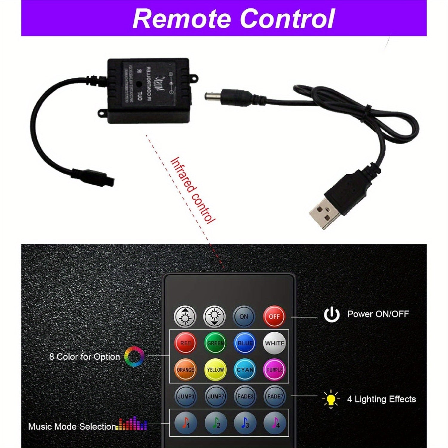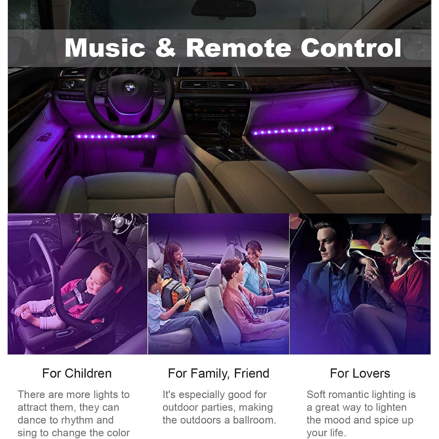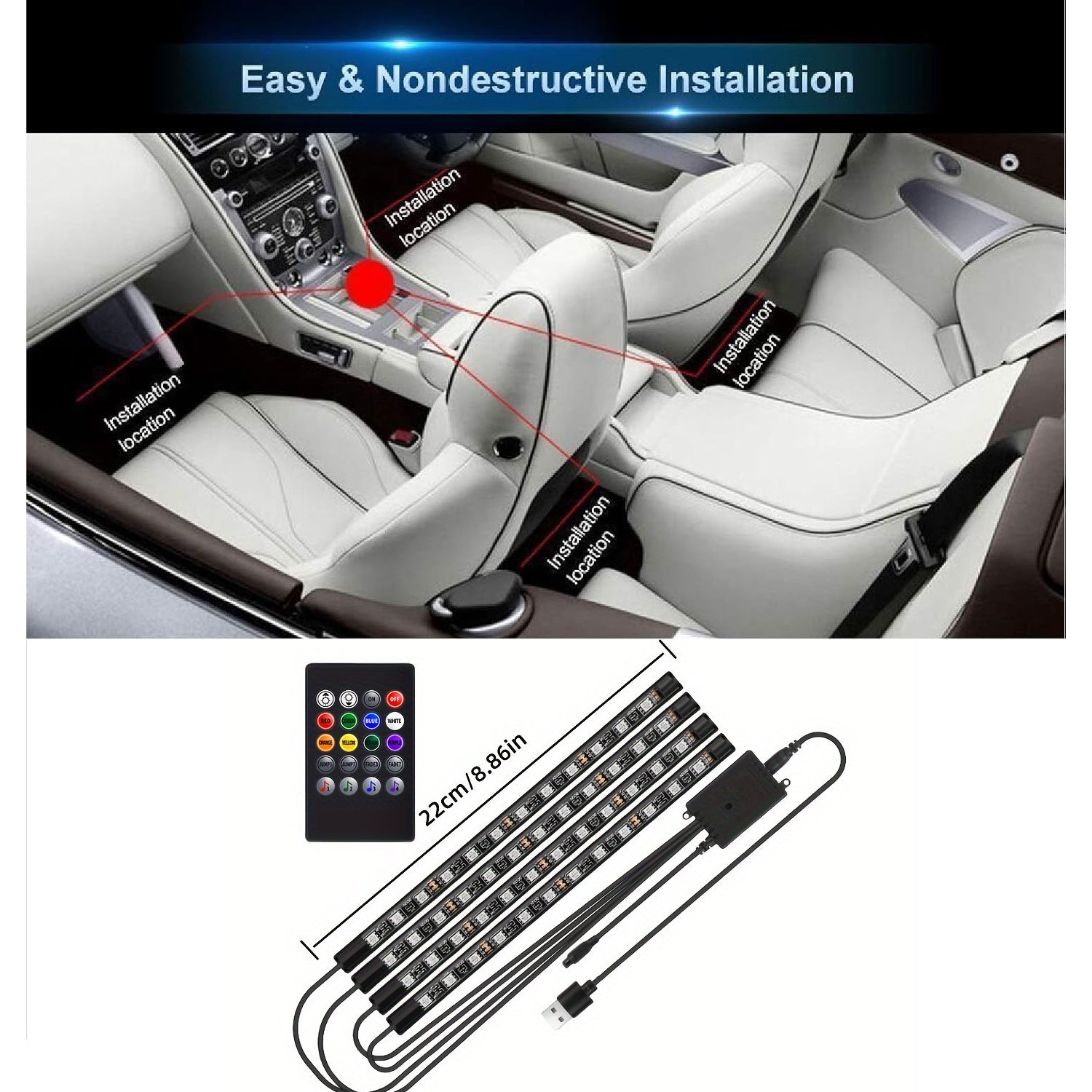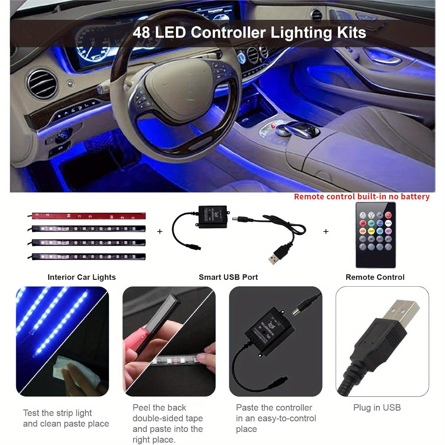 Luci interne per auto a LED, luci a LED per auto con controller, kit di illuminazione multicolore con funzione attiva del suono, 4 luci interne a LED USB da 48 LED, DC 5V, senza batteria