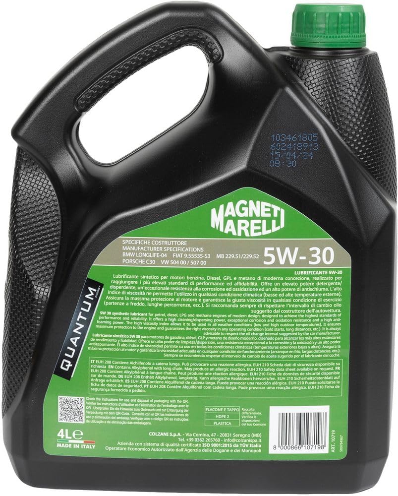 Magneti Marelli Quantum Energy da sempre ha nella propria missione l’essere il punto di riferimento per il mercato dell'Aftermarket, distribuendo ricambi e servizi di qualità nell’ottica di avanguardia e innovazione tecnologica. Nel DNA Magneti Marelli si fondono innovazione e tradizione, tecnologia e qualità. Magneti Marelli è presente in oltre 100 paesi nel mondo fra Europa, America e Asia. Una vasta gamma di batterie per auto e autocarri. Disponibili anche con il sistema Start & Stop. Una vasta gamma di batterie moto con acido incluso, pronte all'uso. Una vasta gamma di lubrificanti per tutte le esigenze della tua auto. Una vasta gamma di spray tecnici per la cura della tua auto. Una vasta gamma di additivi per migliorare le prestazione della tua auto. Una vasta gamma di spazzole slim e flex per la tua auto. Una vasta gamma di lampadine, per la sicurezza durante la guida. Wallbox e cavi di collegamento per colonnette elettriche. Magneti Marelli distribuisce più di 100.000 componenti automotive di qualità originale o equivalente all’originale garantendo la qualità e l’affidabilità dei prodotti. Ogni anno soddisfa più di 10 milioni di automobilisti attraverso la propria rete di officine nel mondo. Sicurezza e soddisfazione del cliente sono le nostre priorità. Una linea completa di lubrificanti di alta qualità per soddisfare le specifiche richieste dalle case costruttrici e far fronte a tutte le esigente di guida. I lubrificanti Magneti Marelli Quantum Energy sono formulati e realizzati in Italia per garantire i migliori livelli di protezione e minori consumi, per tutti i tipi di automobile. Proteggono il motore a lungo prevenendo la formazione di depositi. Offrono la massima prestazione del motore nel breve e lungo periodo. Qualità garantita Made in Italy progettati con basi selezionate e additivi di moderna concezione. Adatti a tutte le tipologie di motore, Benzina, Diesel, GPL e Hybrid. I lubrificanti Magneti Marelli Quantum Energy sono disponibili nelle tipologie Minerale, Semi-sintetico e Sintetico nelle viscosità più richieste dal mercato nei formati da 1 e 4 litri. La gamma dedicata alle 2 ruote comprende i lubrificanti 2 tempi MIX e MIX SYNT e 4 tempi 10W-40.