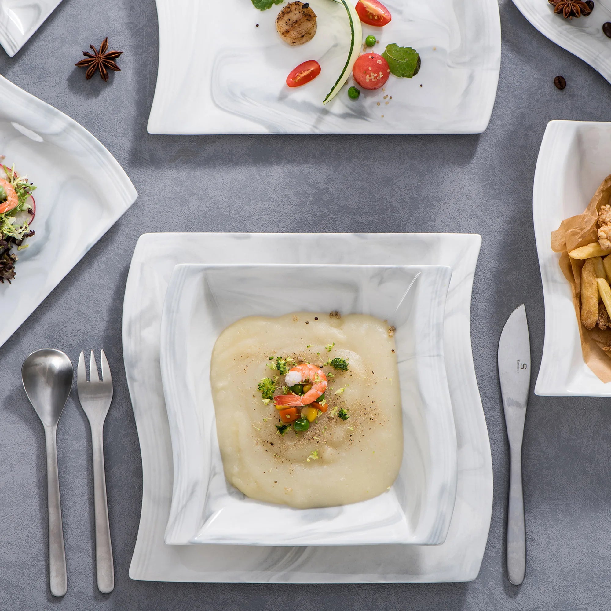 ● I set di servizio per la cena MALACASA sono realizzati in porcellana bianca avorio, certificati FDA senza piombo e cadmio per l'uso quotidiano. Con forma quadrata classica, che rende il tavolo da pranzo bello ed elegante.