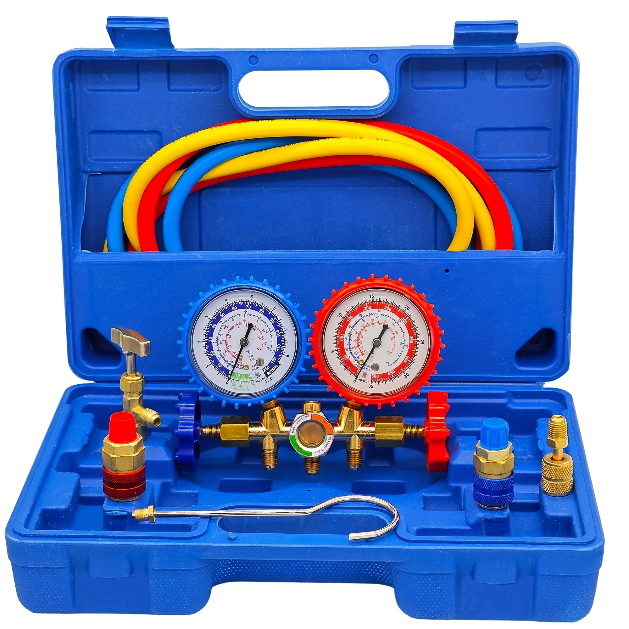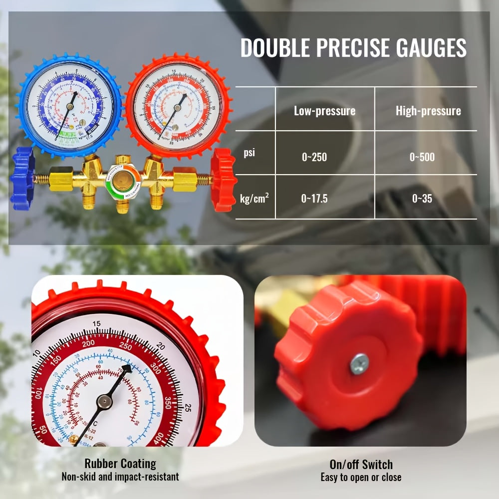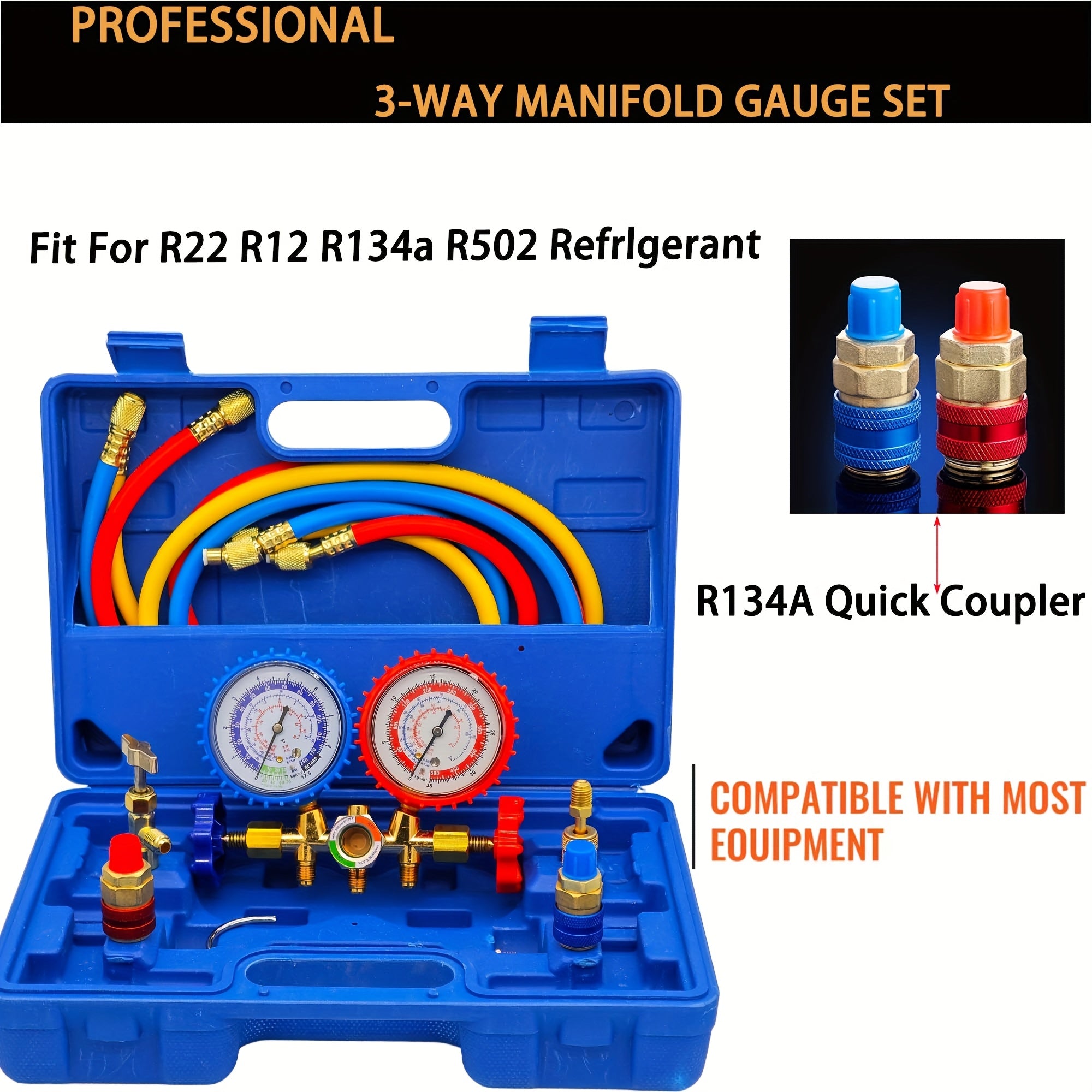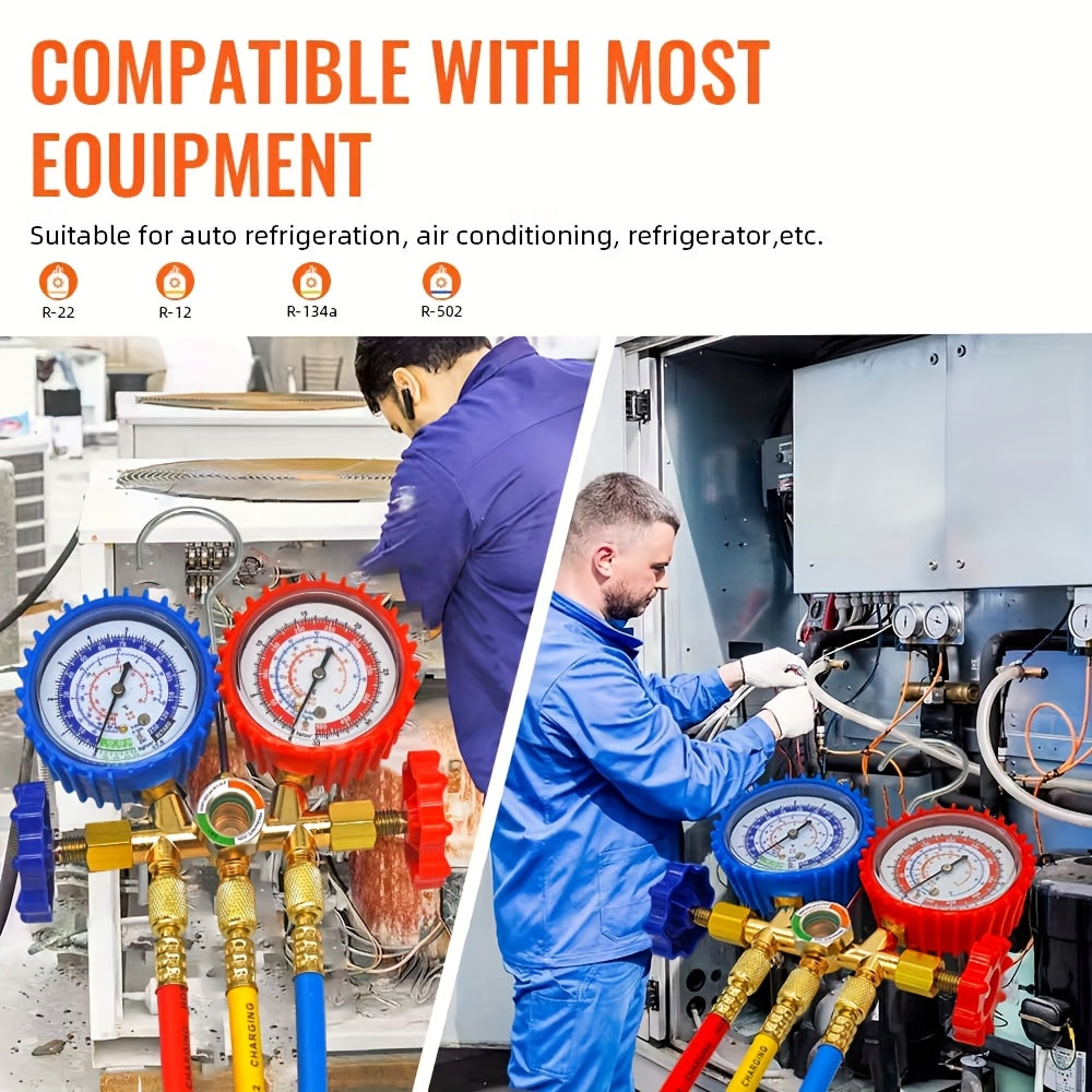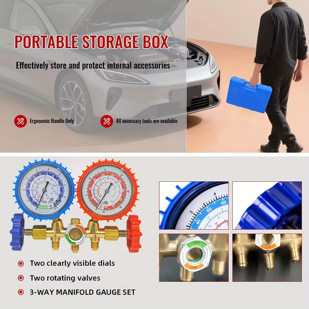 Manometro AC Set per R134a, R12 e R22, 3 Vie con Tubi, Accoppiatori e Adattatore per Auto