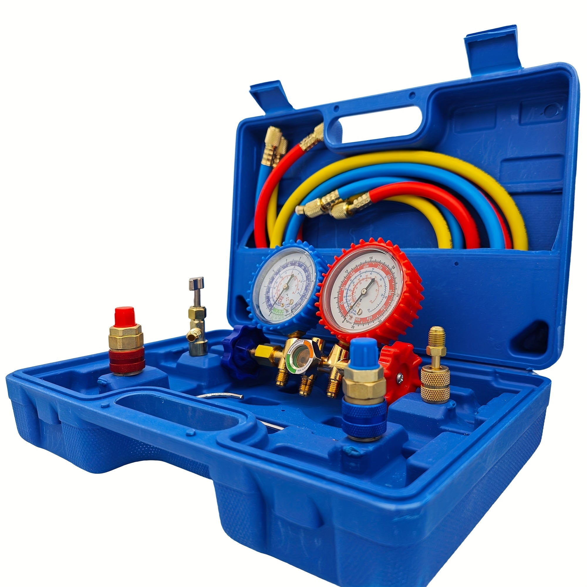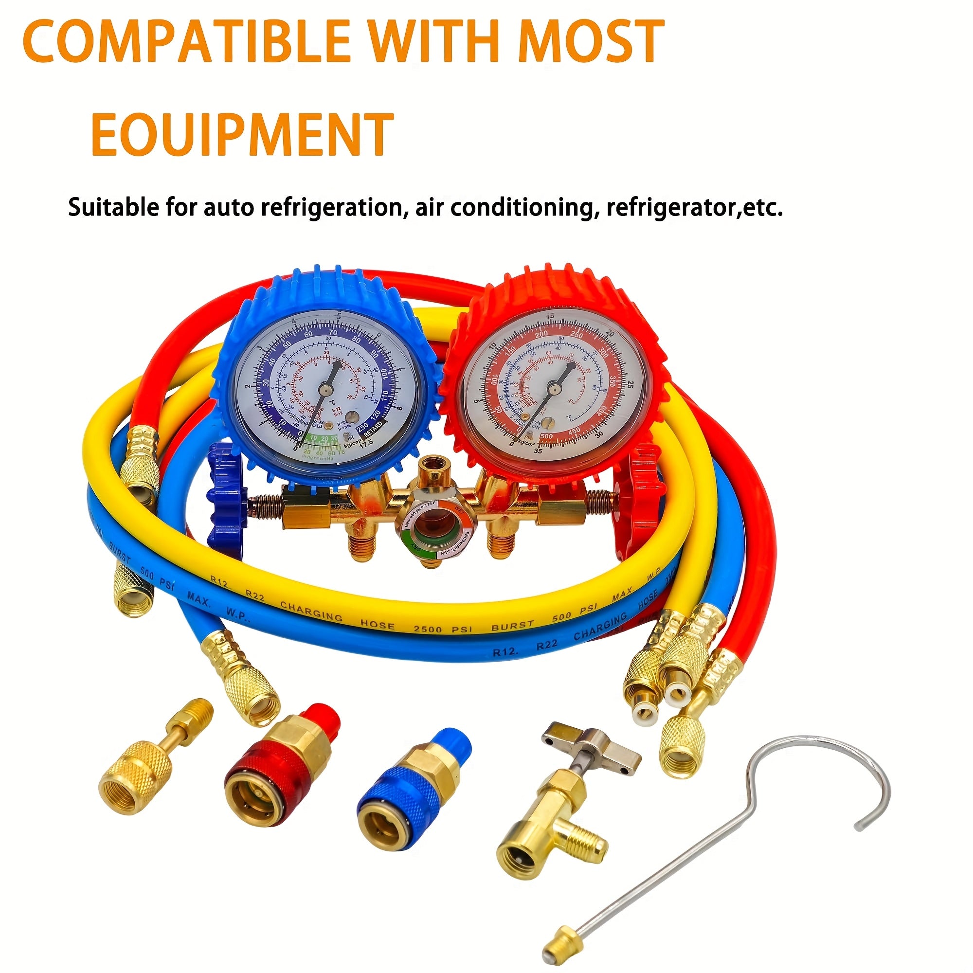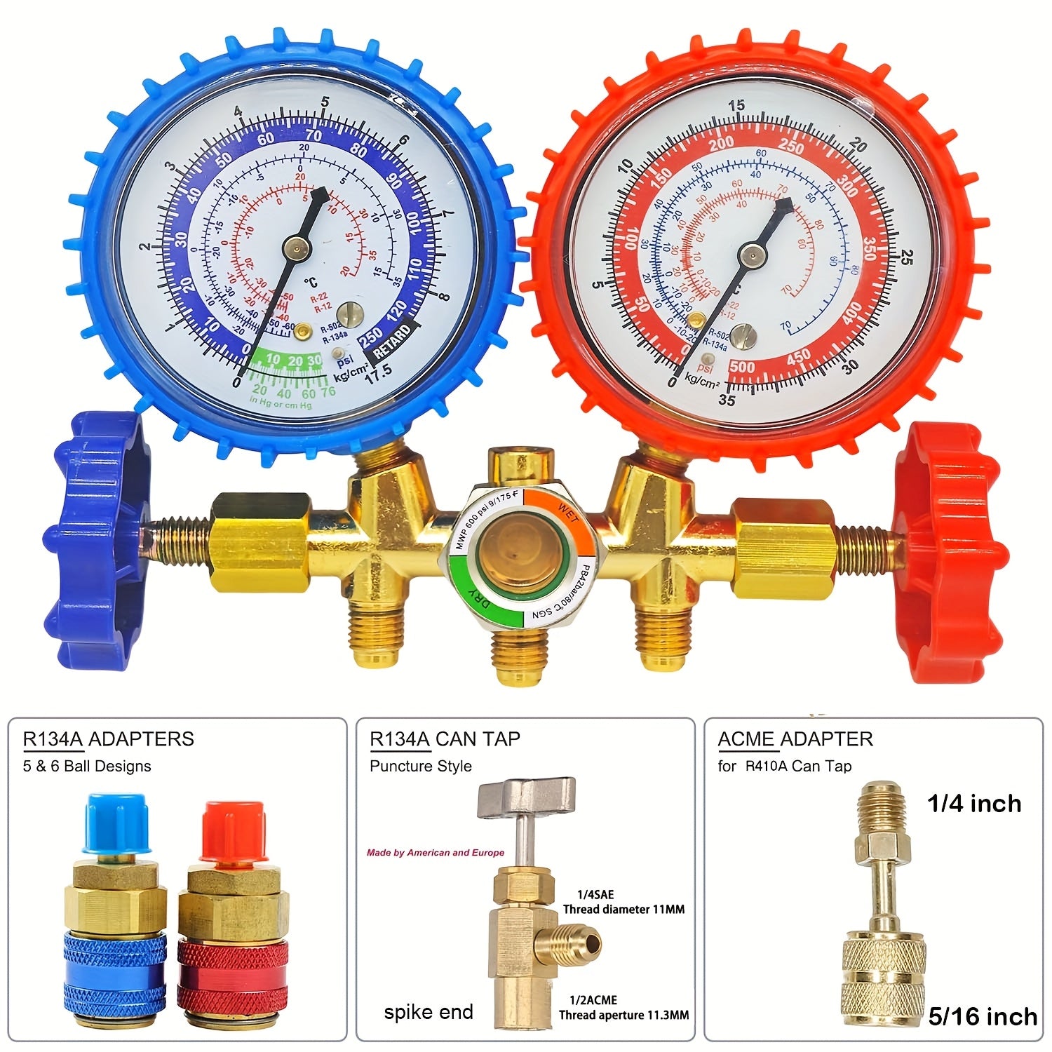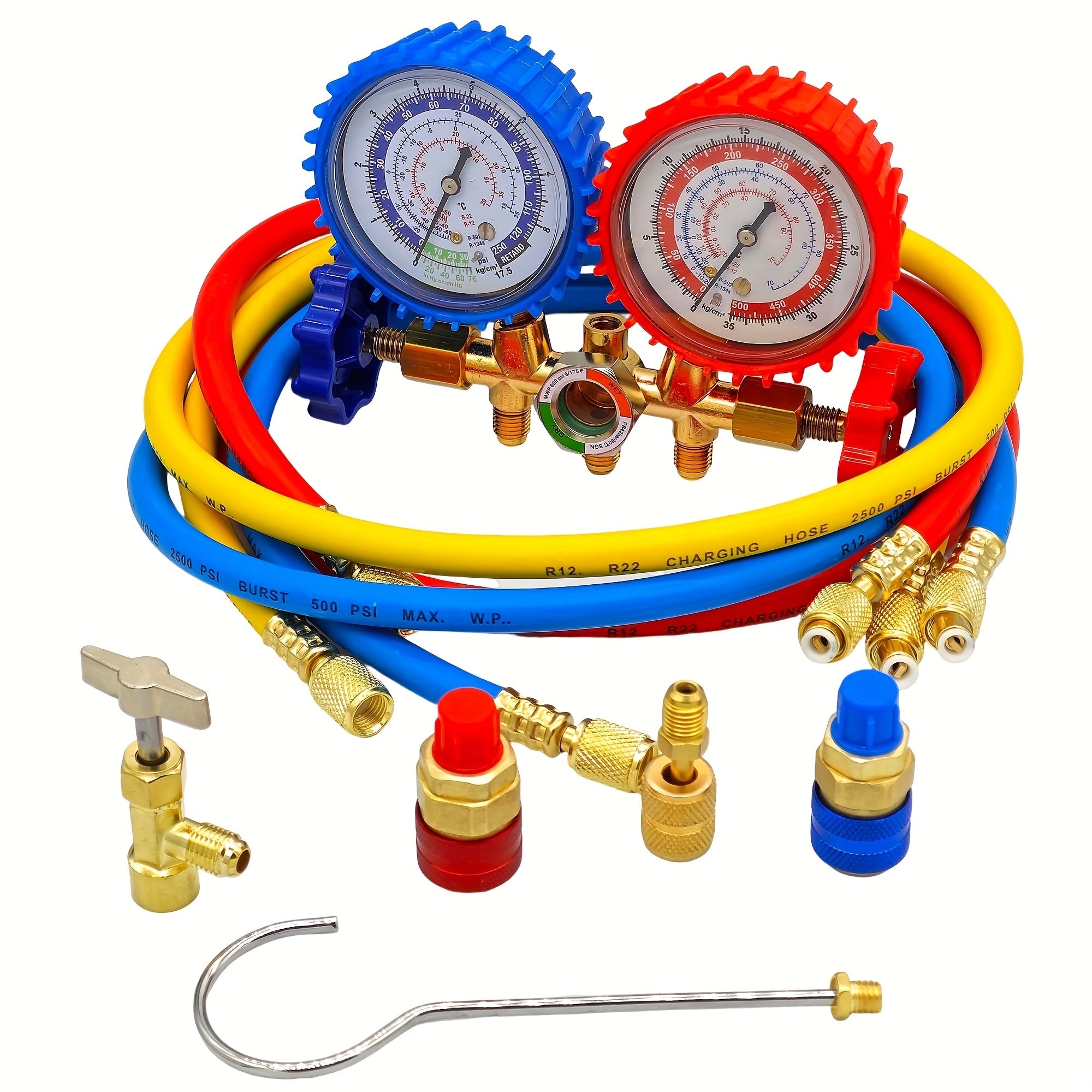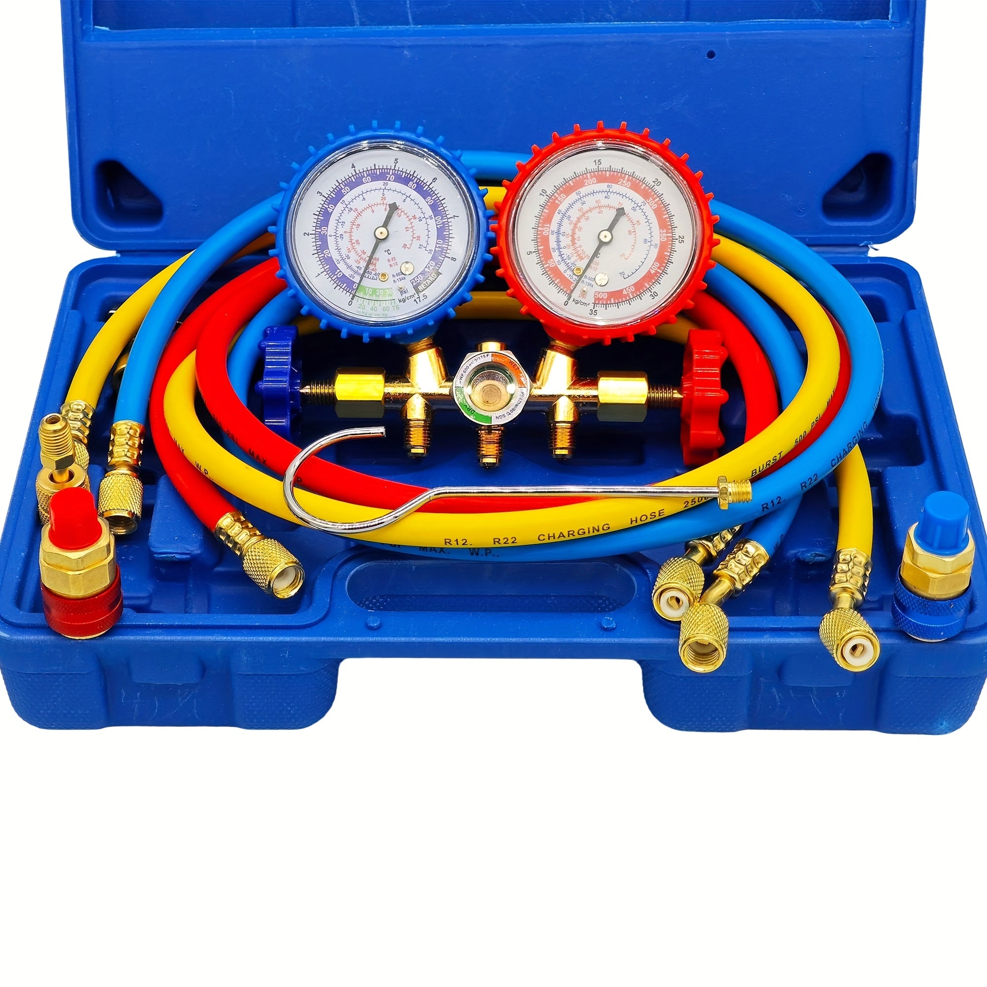 Manometro AC Set per R134a, R12 e R22, 3 Vie con Tubi, Accoppiatori e Adattatore per Auto