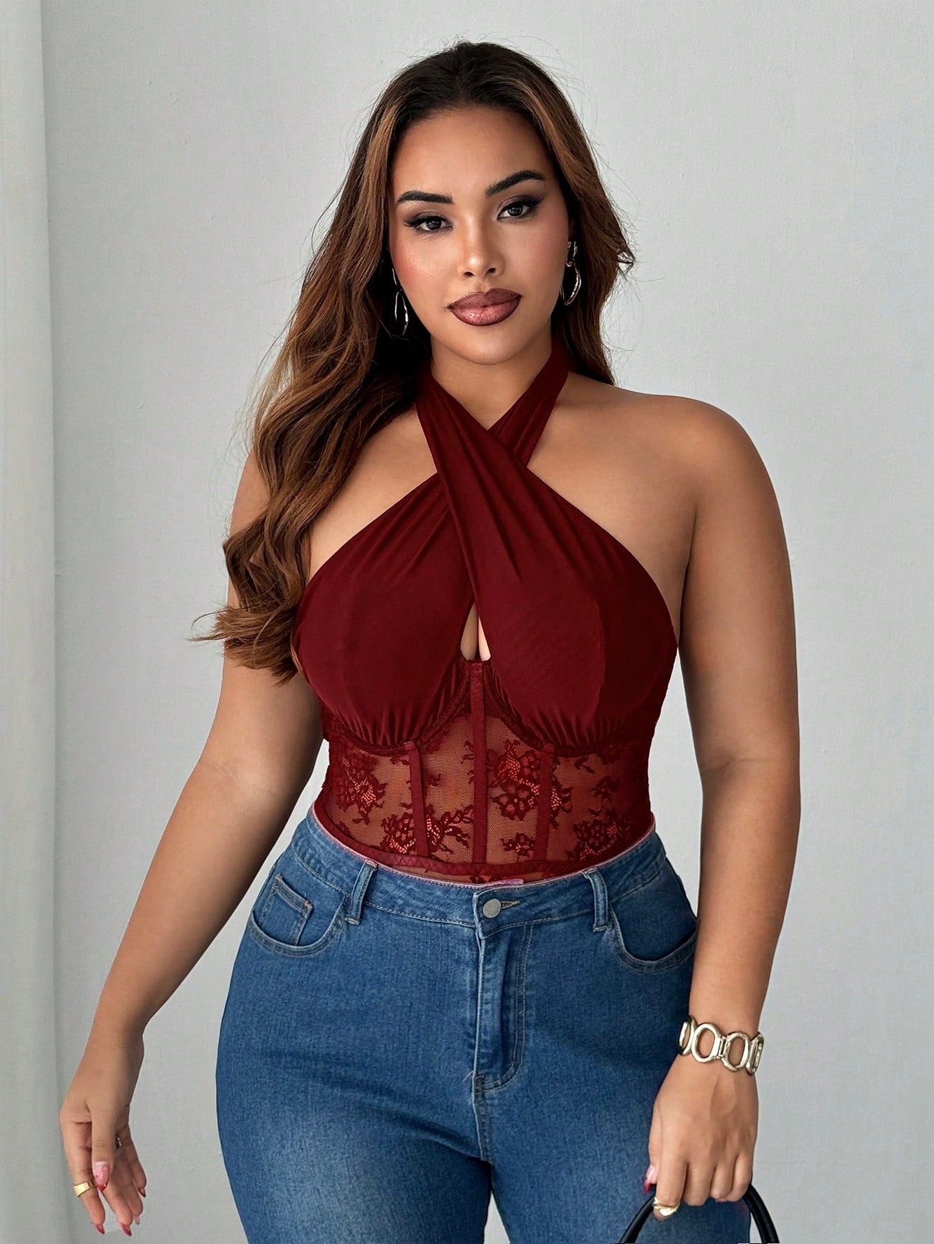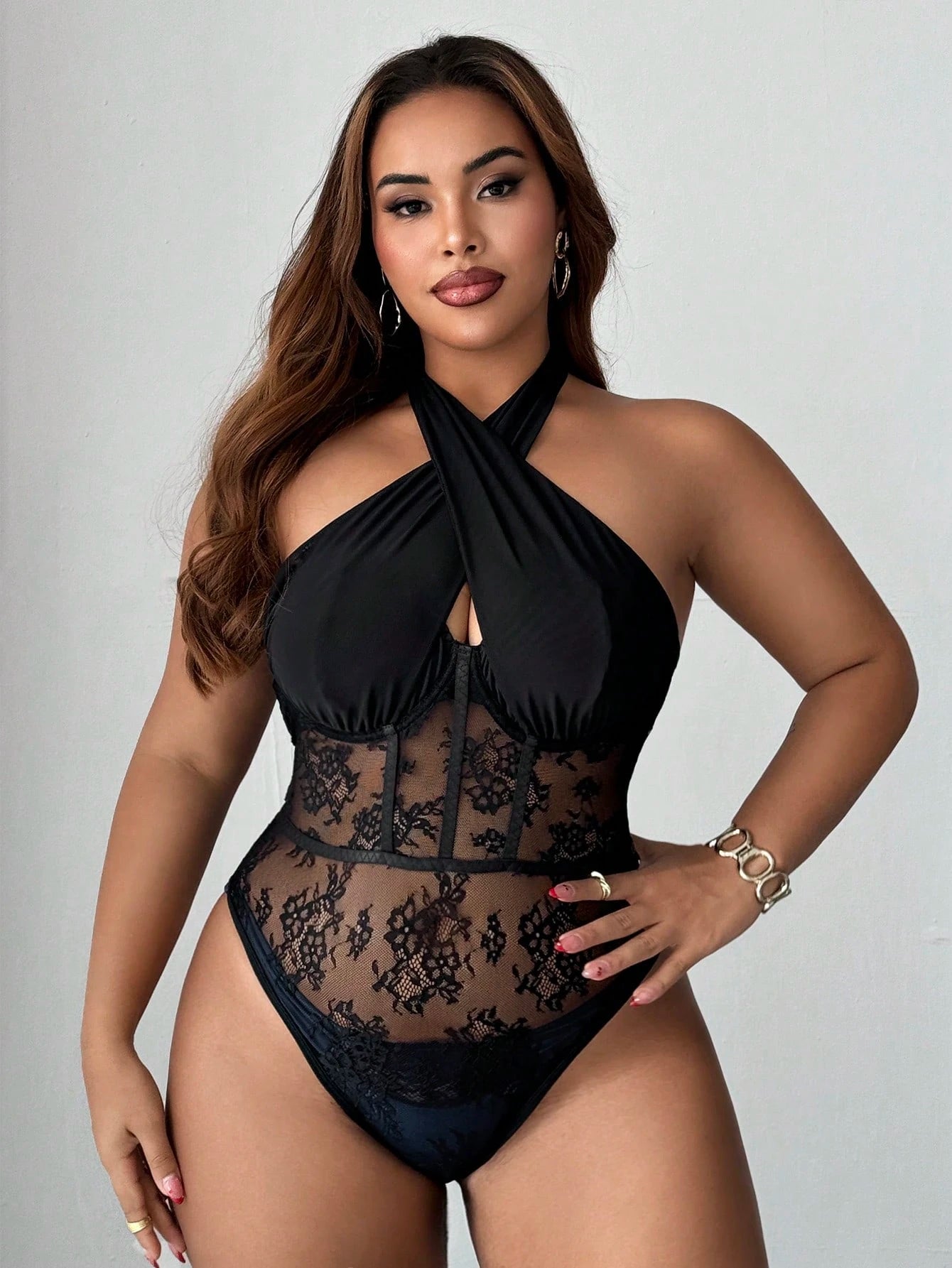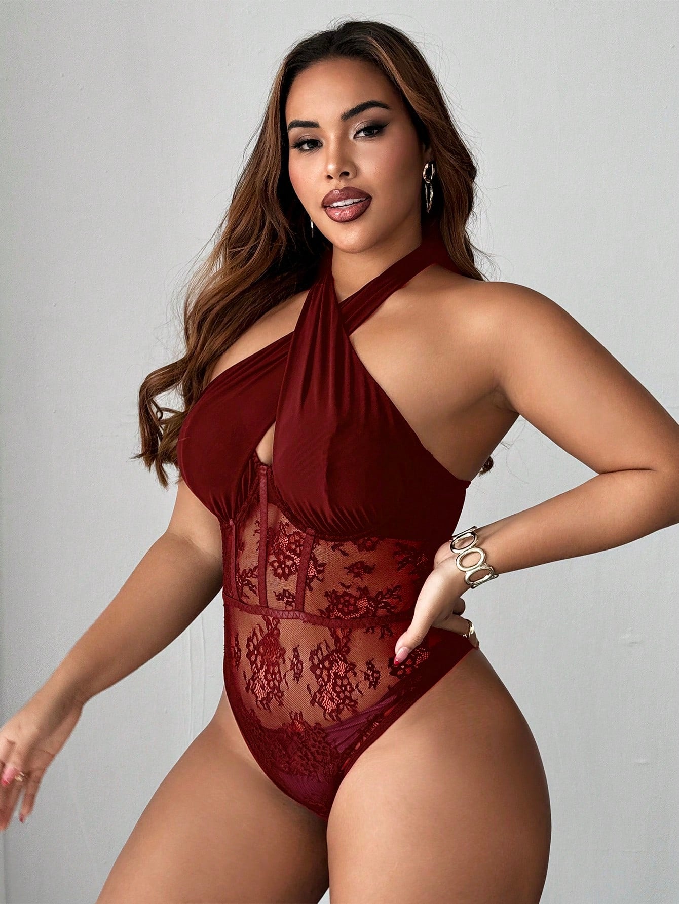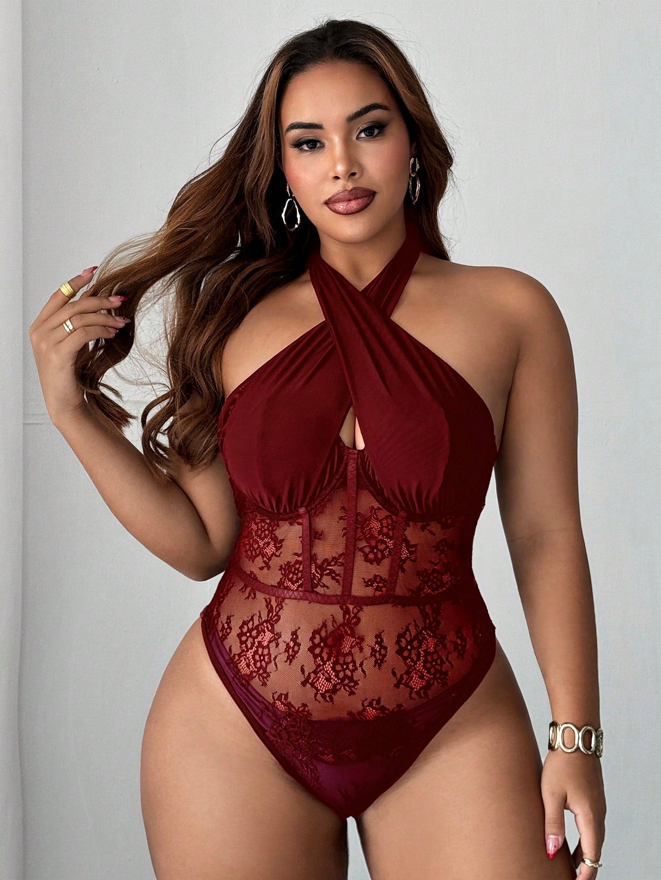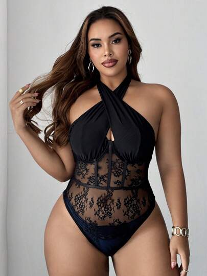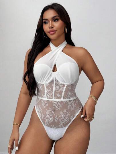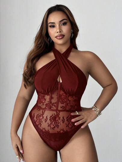 Maweii Plus Size Women's Criss-Cross Halter Lace Lingerie, Sexy & Elegant One-Piece Bodysuit For Everyday Wear,Valentine