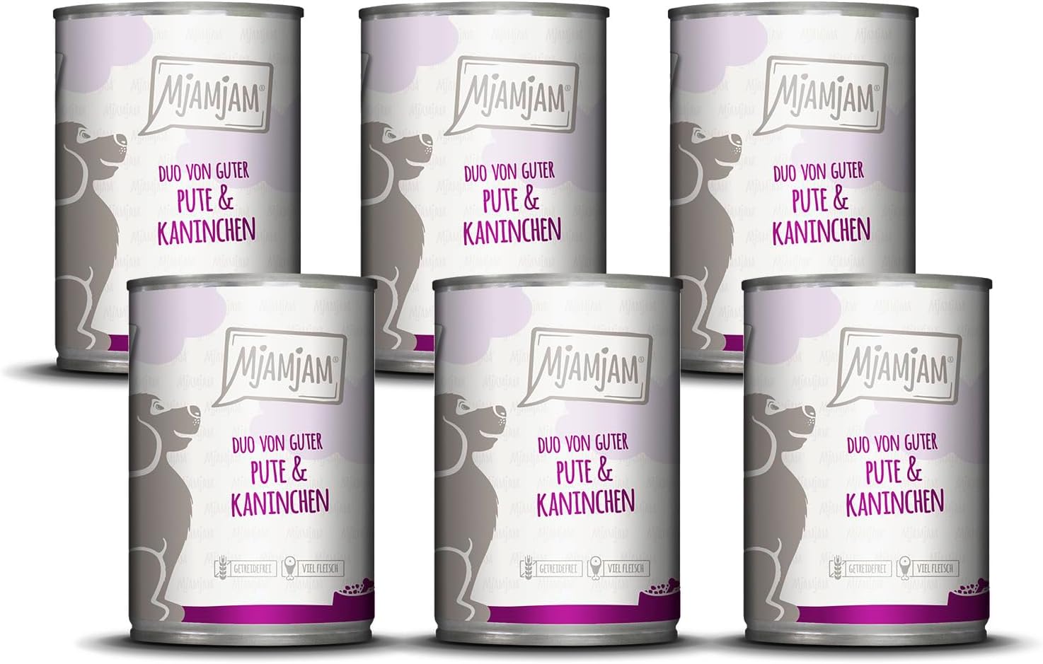 MjAMjAM - Cibo umido premium per cani - DUO di tacchino e coniglio, confezione da 6 (6 x 400g), senza cereali con carne extra