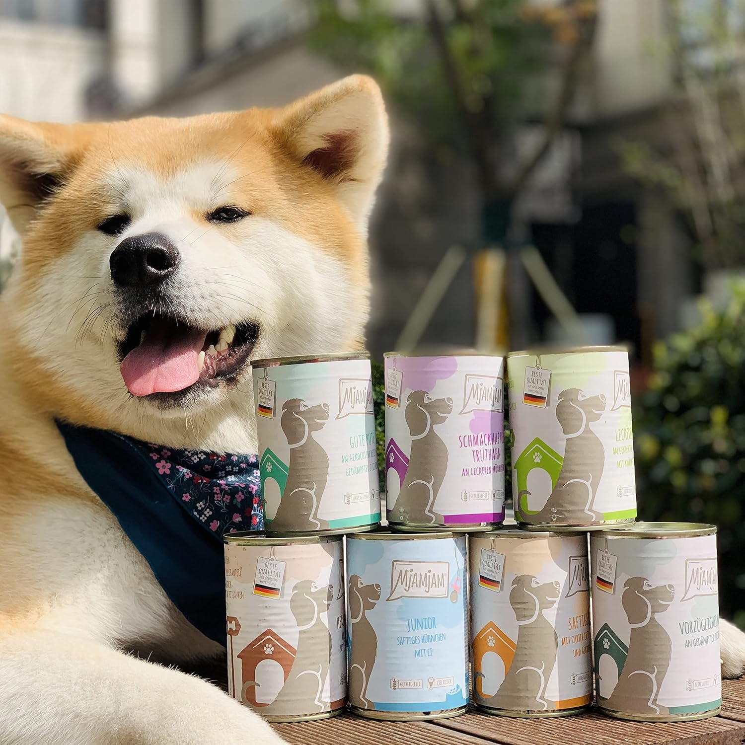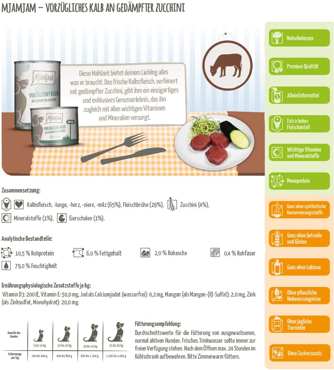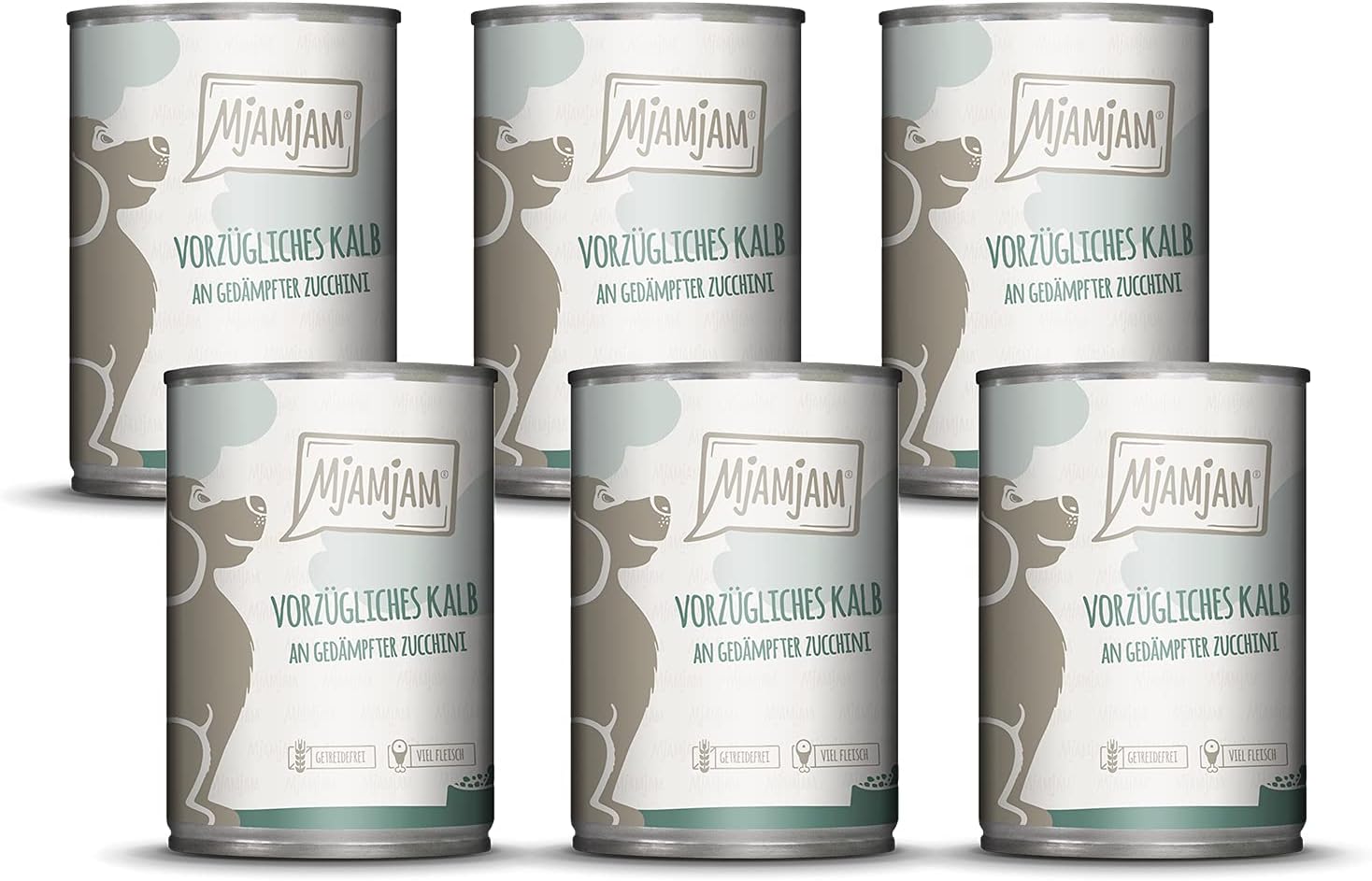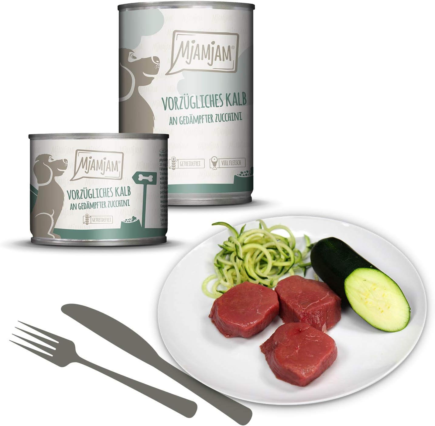 MjAMjAM - cibo umido premium per cani - ottimo vitello con zucchine al vapore, confezione da 6 (6 x 400 g), senza cereali con carne extra