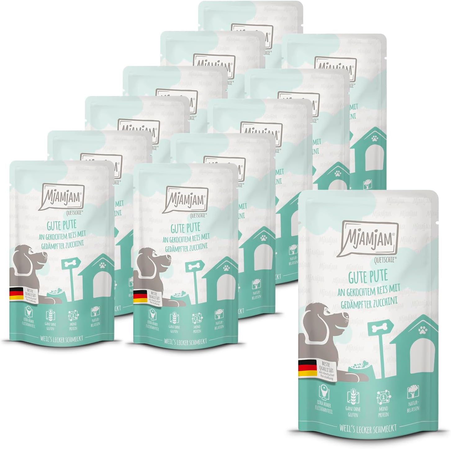 MjAMjAM - Cibo umido premium per cani - Quetschie - tenero tacchino accompagnato da riso cotto con zucchine, confezione da 12 (12 x 125g), senza glutine con carne extra