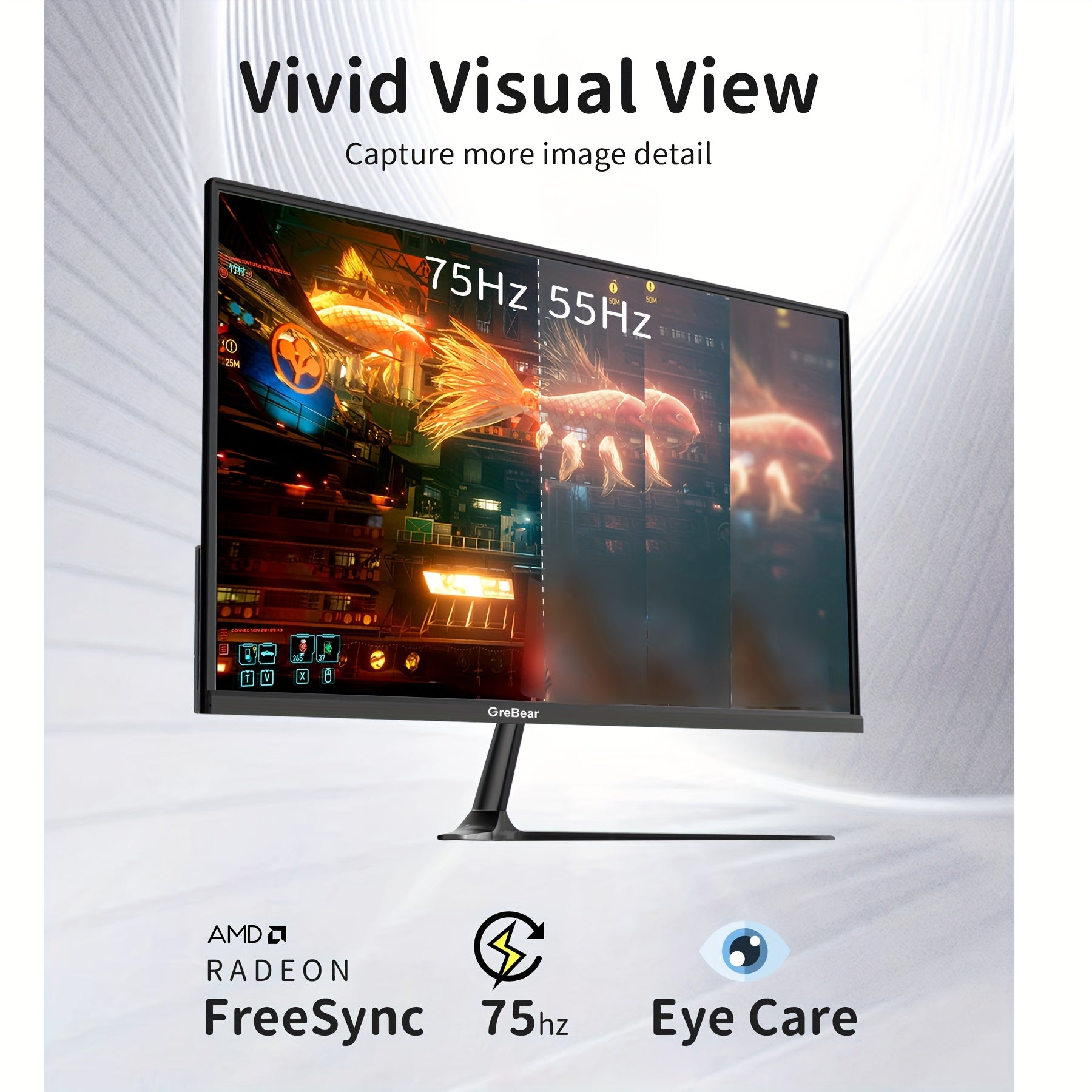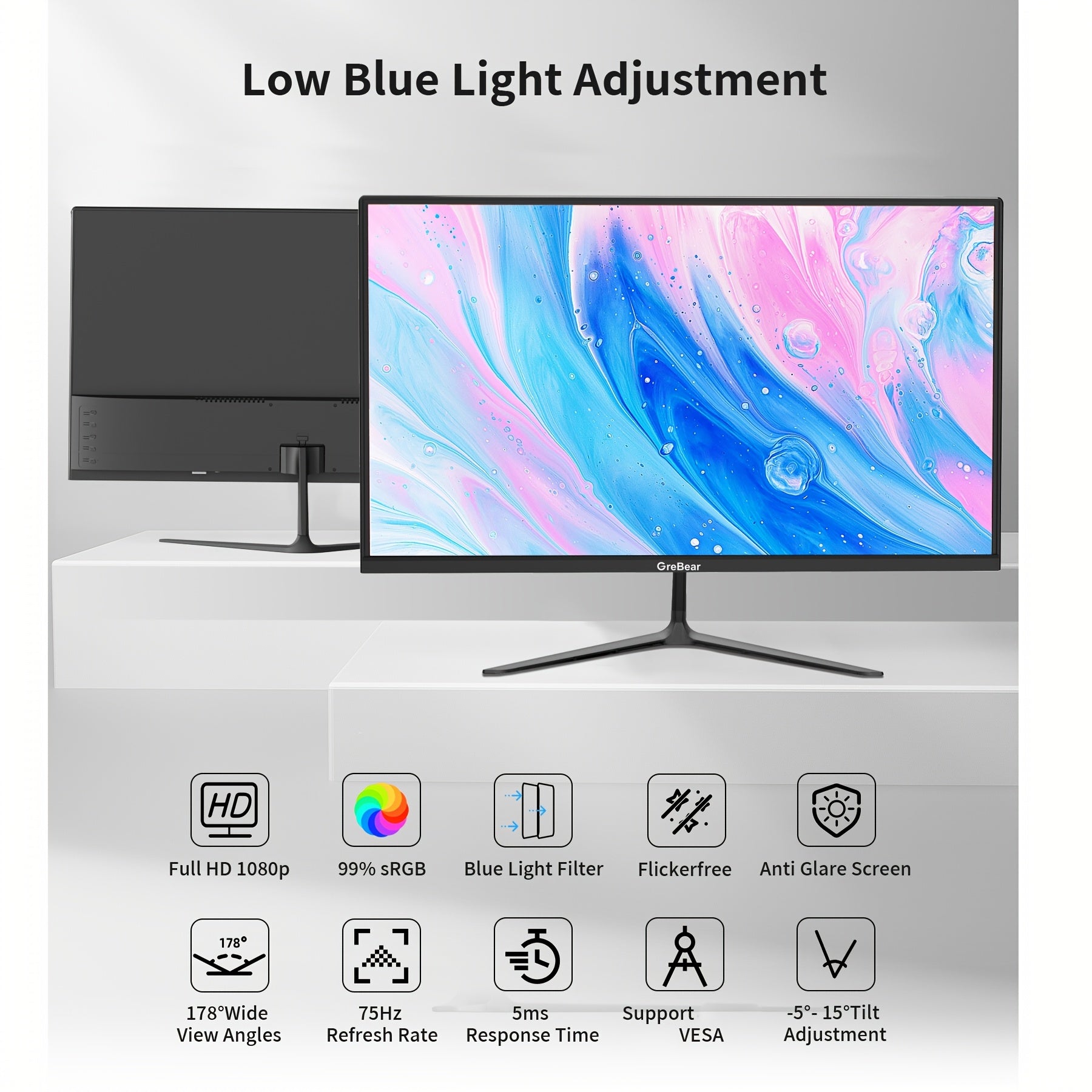 Monitor GreBear 24 Pollici FHD 1080p, Monitor per PC con Schermo a 75 Hz, 99% SRGB 5ms Luce Blu Bassa, Pannello IPS Antiriflesso, Display LCD Desktop con HDtv/VGA/Audio/Freesync, Inclinazione Regolabile