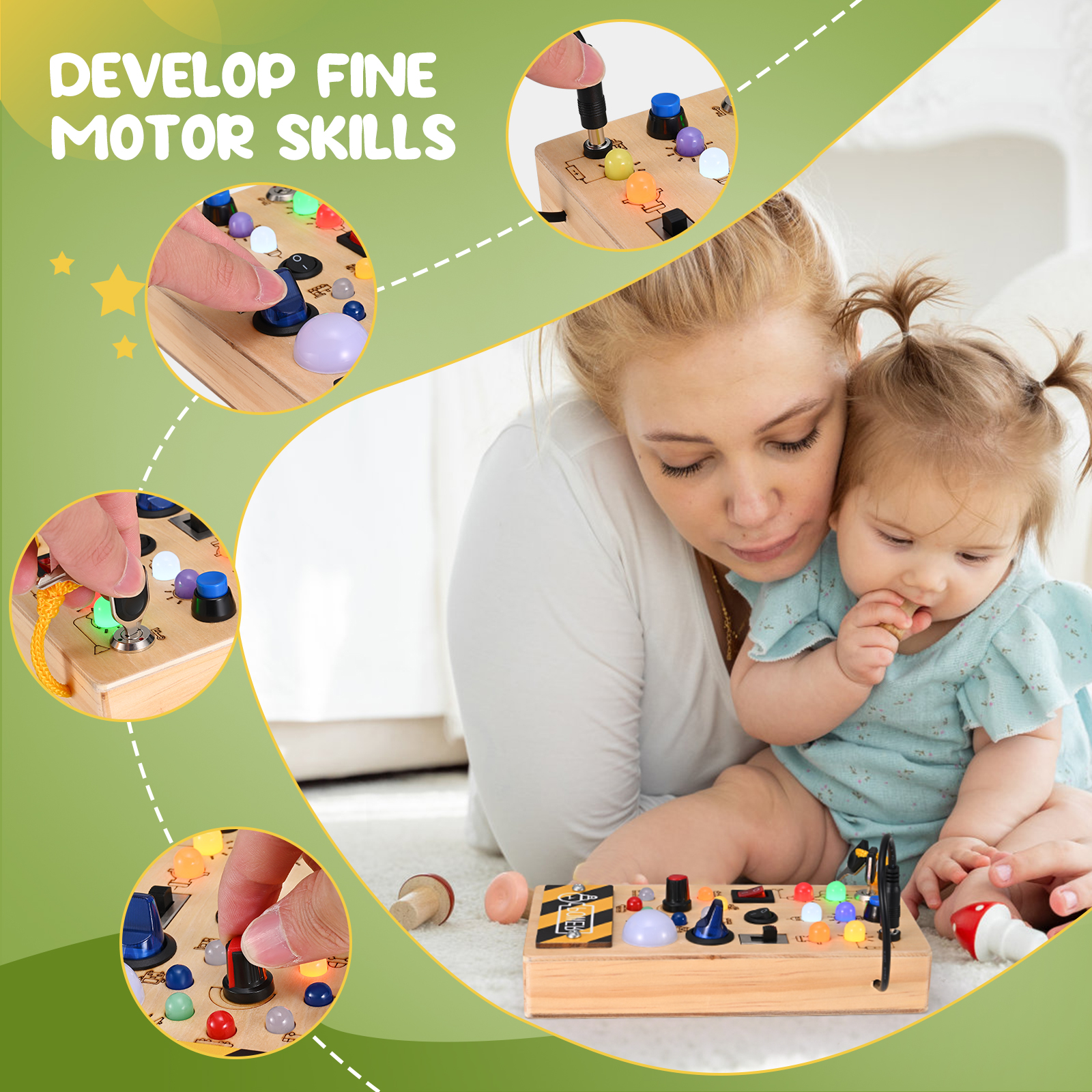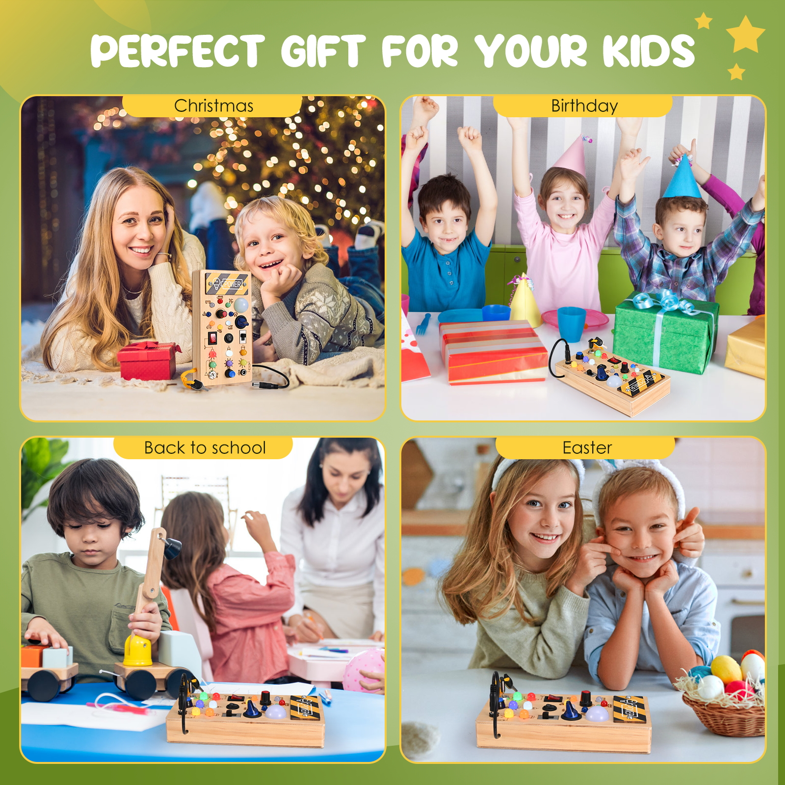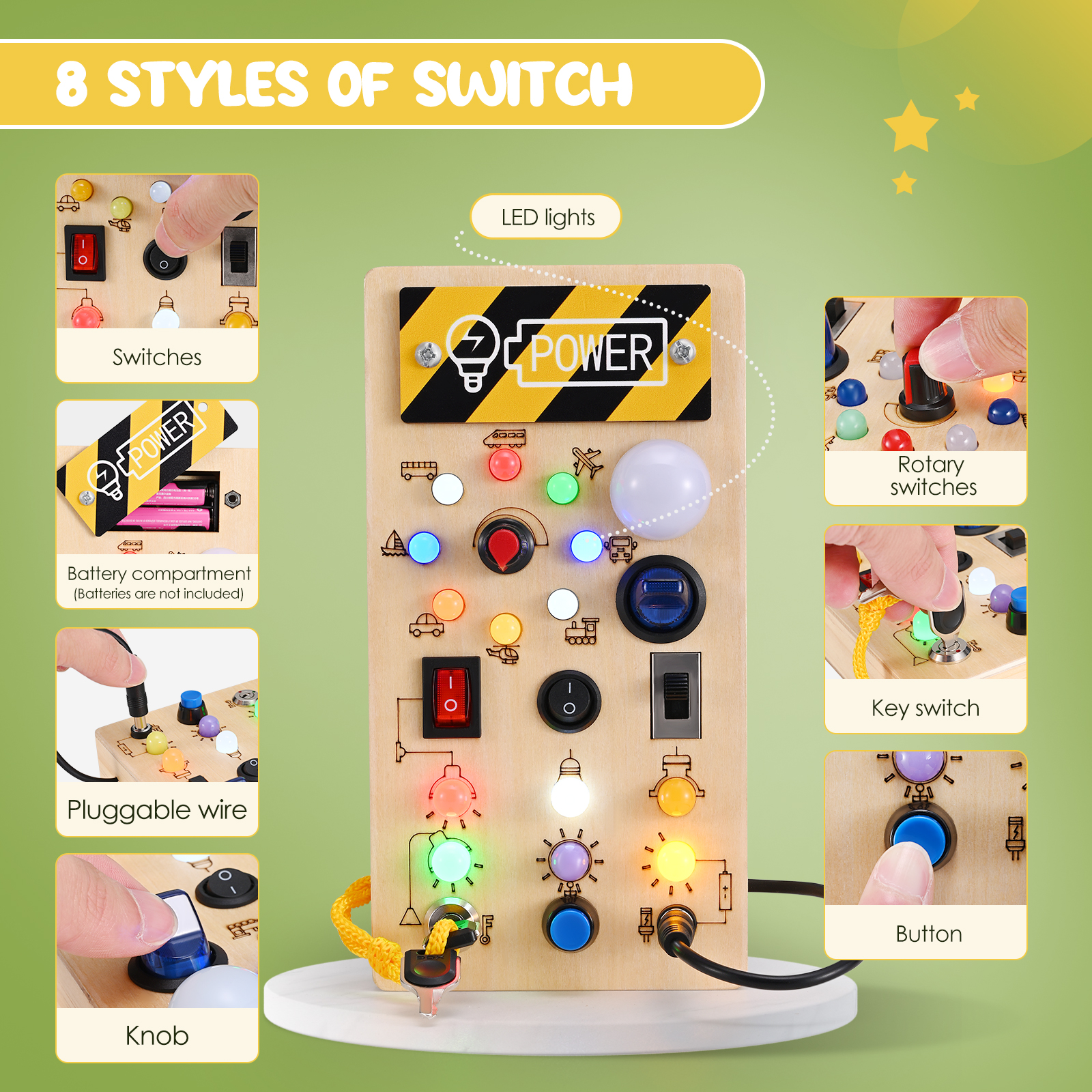 Il tabellone impegnativo dei nostri bambini è progettato per promuovere l'apprendimento attraverso il gioco pratico.Man mano che i bambini interagiscono con gli 8 stili di interruttore, sviluppano competenze essenziali come la coordinazione occhio-mano e il pensiero logico.Rende l'apprendimento un'esperienza coinvolgente per le giovani menti.