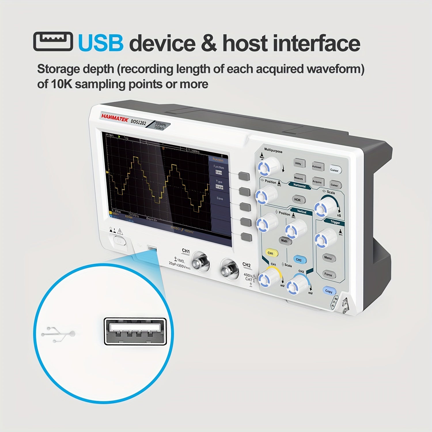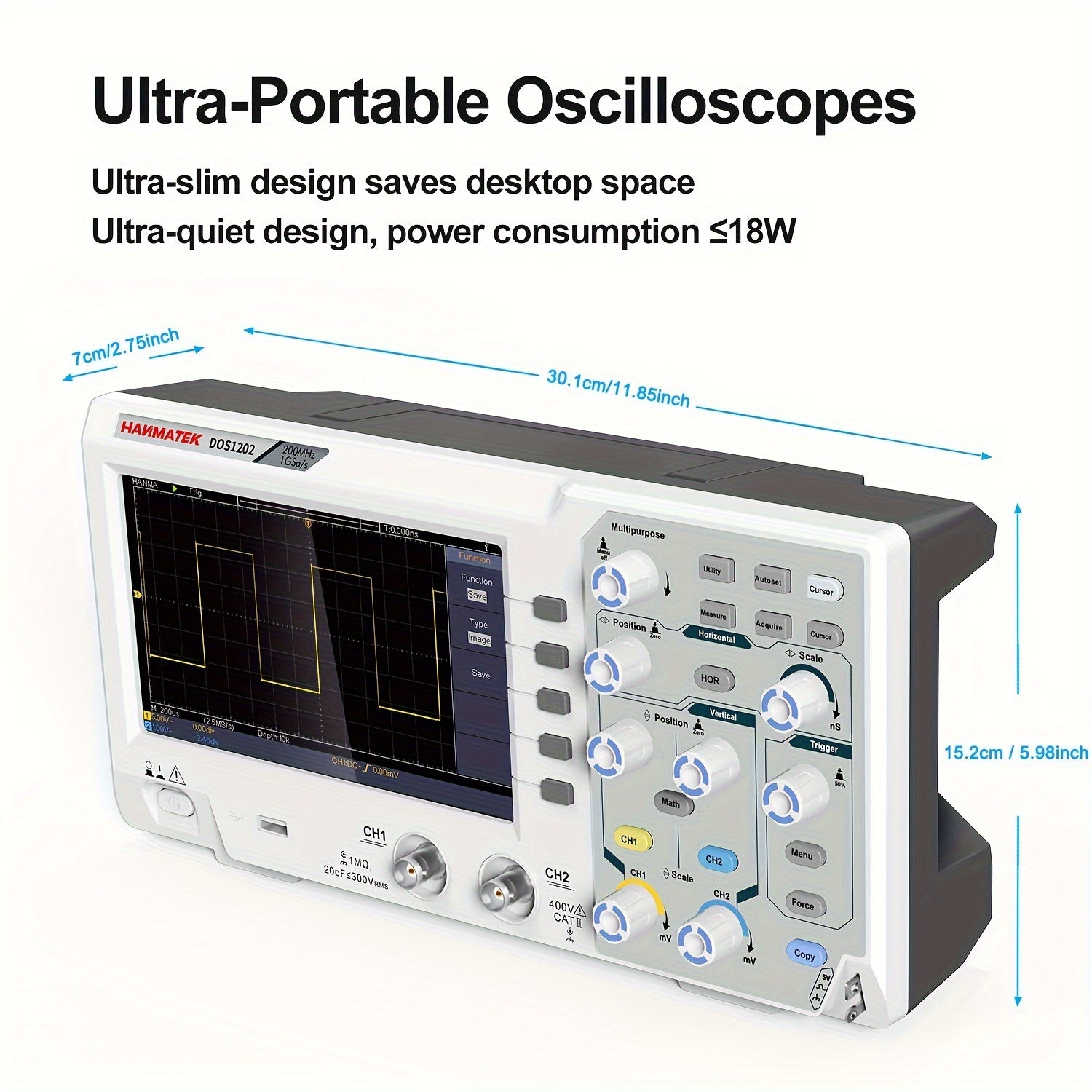 Ocilloscopio digitale HANMATEK DOS1202, larghezza di banda 200 MHz, 2 canali, display TFT-LCD da 7 pollici, kit oscilloscopio professionale portatile, frequenza di campionamento 1GSa/S, modello da tavolo, alimentazione USB, tensione 5V, senza wireless, ba