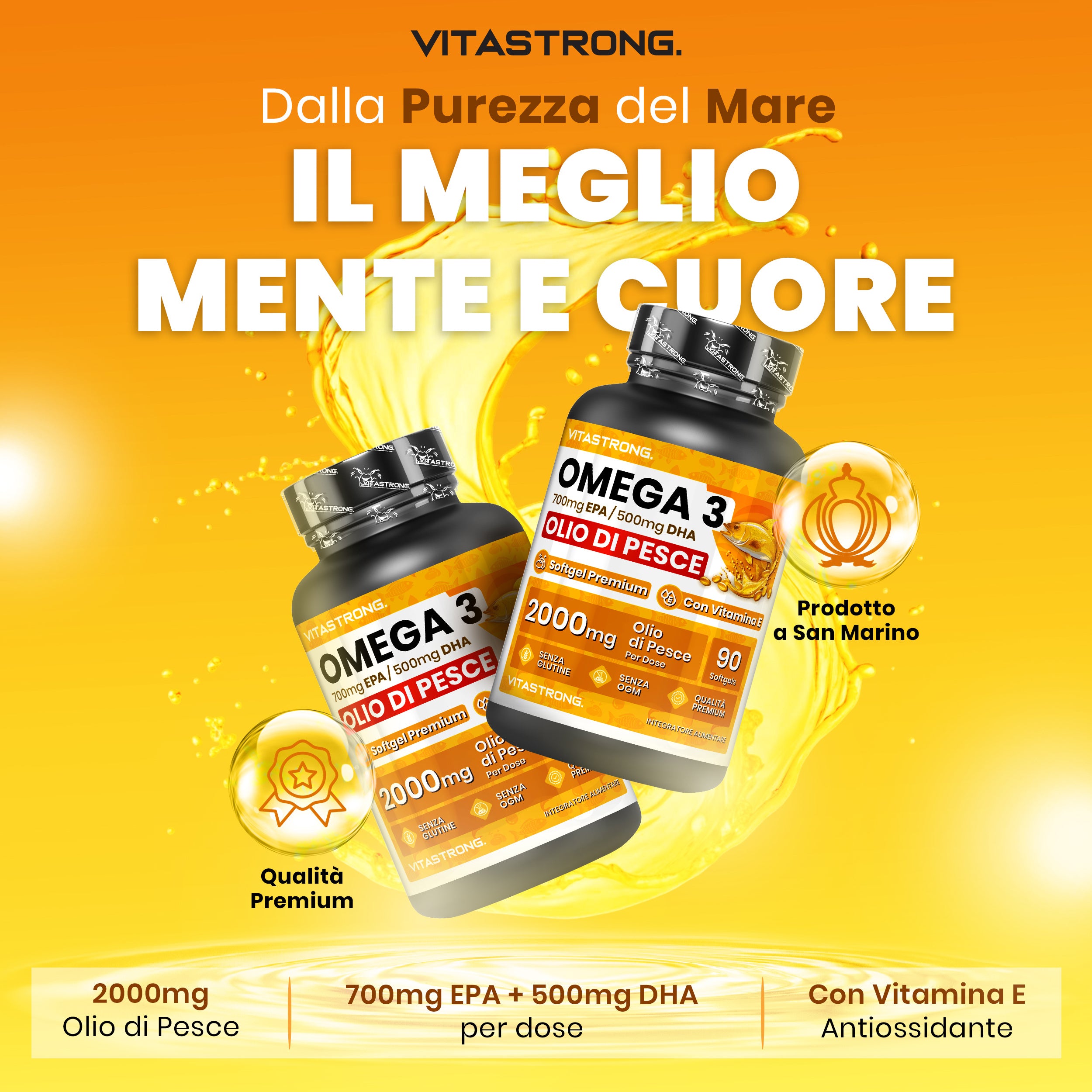 Omega 3 Olio di Pesce 2000mg Alto Dosaggio con Vitamina E, Senza Retrogusto, Omega3 Olio di Pesce (Fish Oil) 700mg EPA 500mg DHA, Alta Concentrazione, Integratore Omega - 3 Puro Cuore, Vista, Cervello