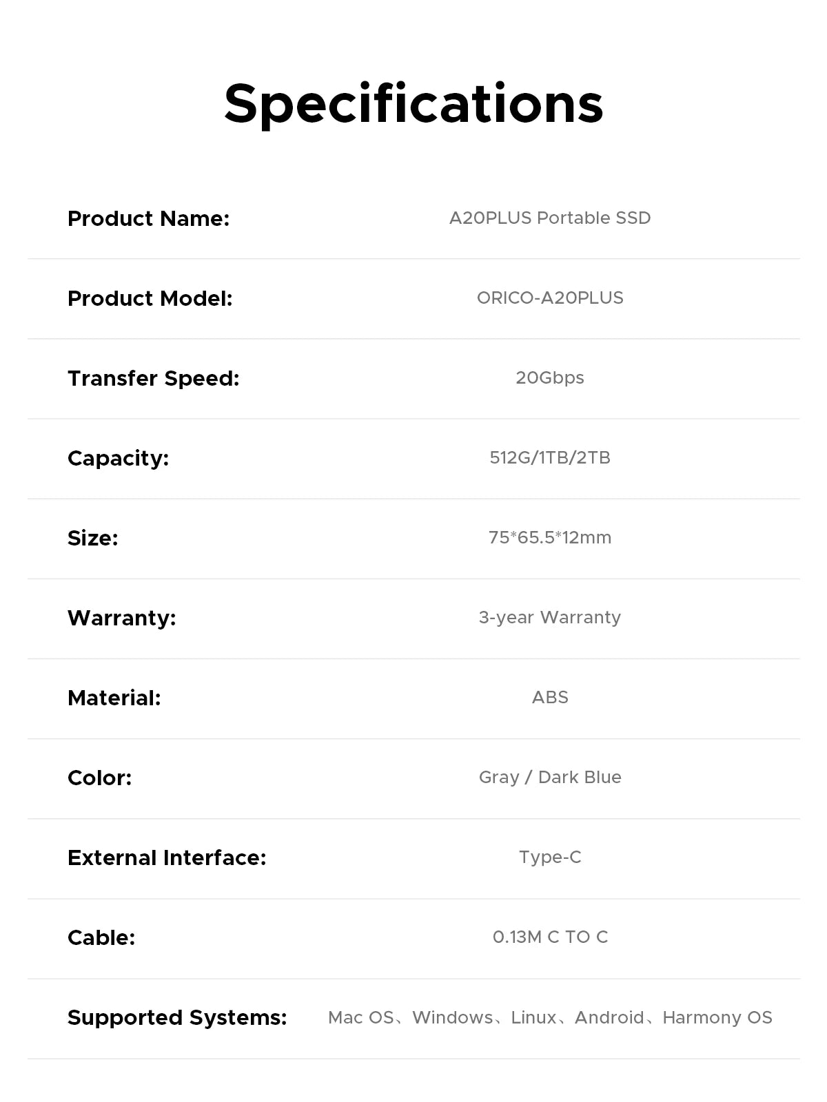SPECIFICATIONSCertificazione: CE,FCCChoice: yesDimensione: 1.8"Item: 20Gbps Portbable SSDMarca: OricoNumero di modello: A20PLUSOrigine: CN (Origine)Outpout: USB C 20GbpsProdotti chimici ad alto impatto:... Per saperne di più