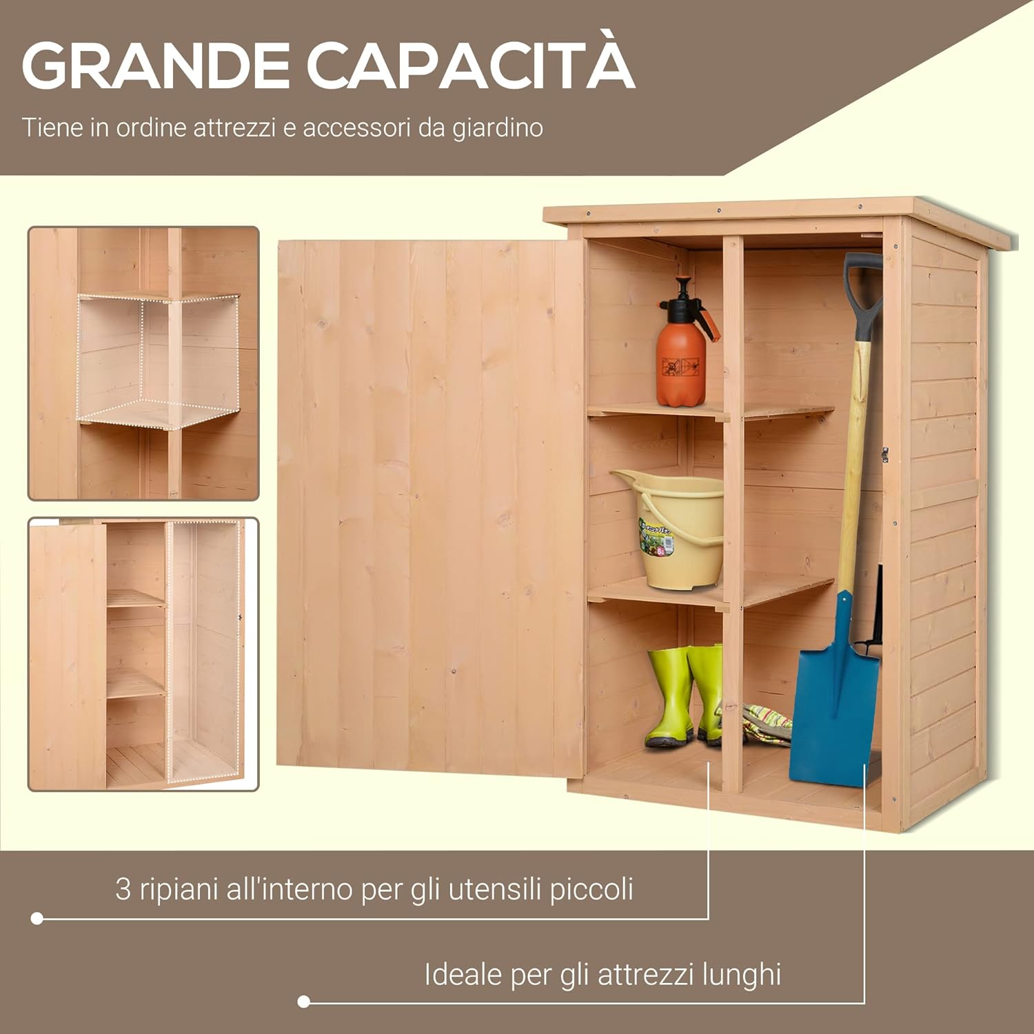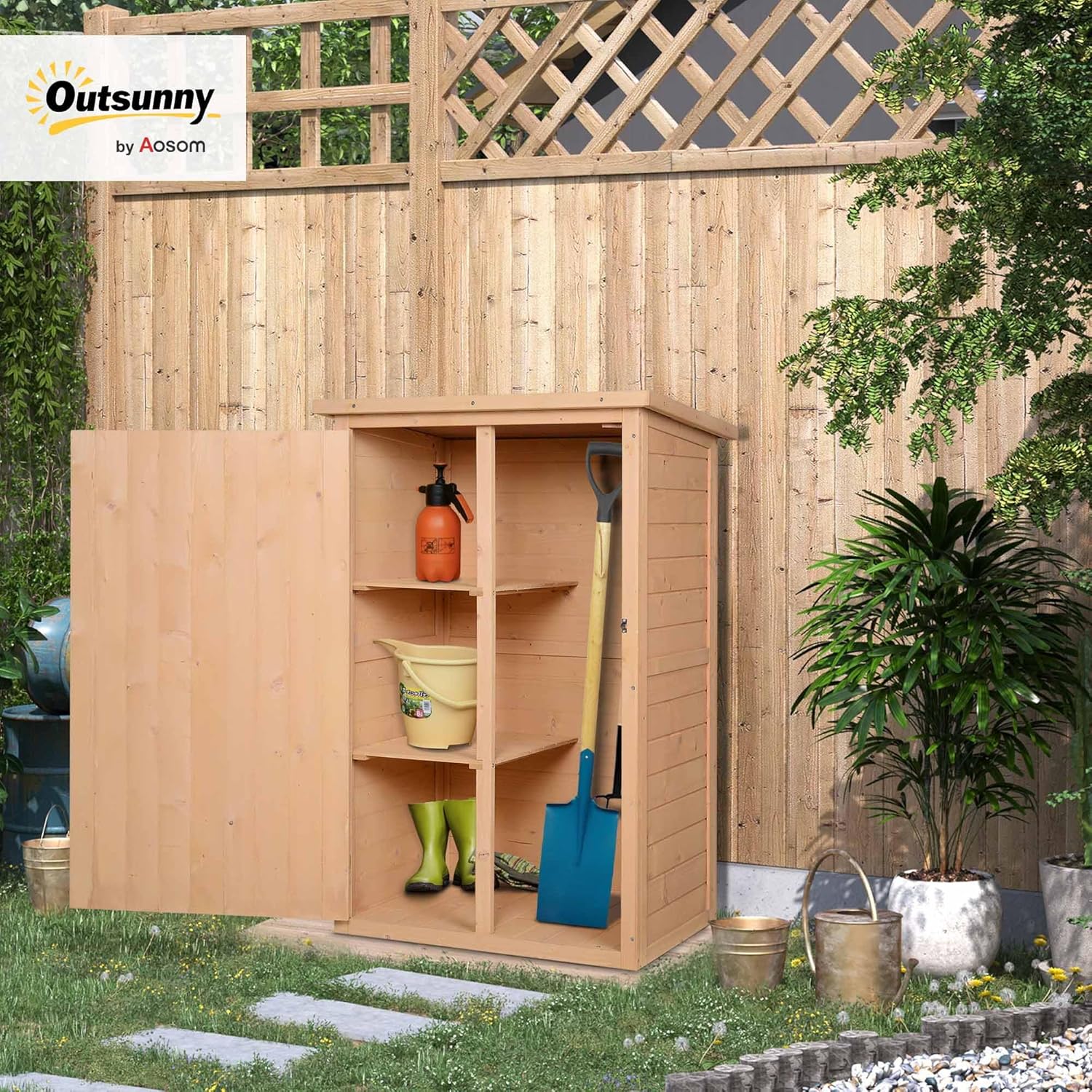 Outsunny Casetta da Giardino in Legno con Tetto Impermeabile, Armadio Porta Attrezzi da Esterno con 2 Mensole, 75x56x115cm, Colore Legno