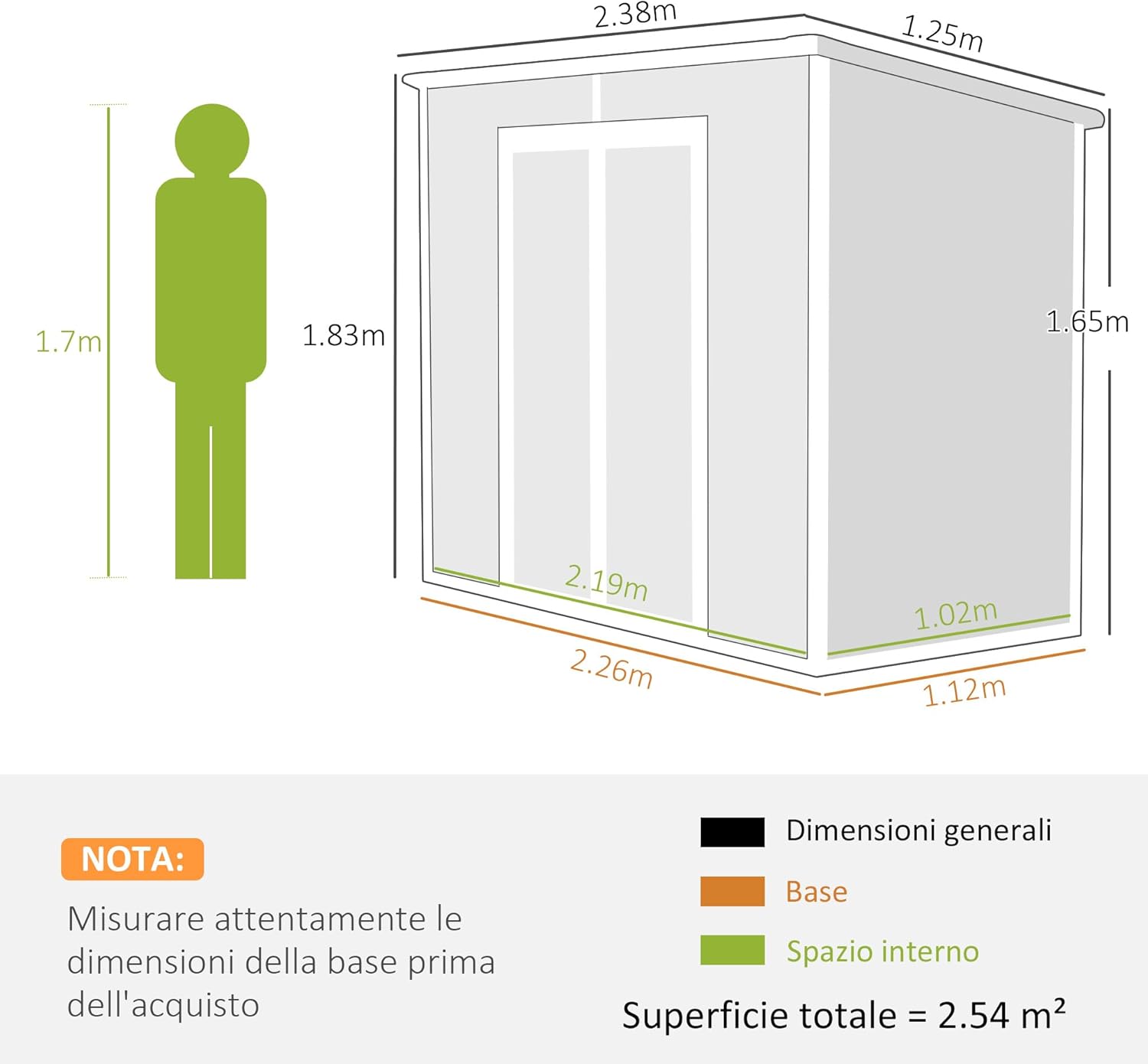 Outsunny Casetta da Giardino Porta Attrezzi in PP con Pavimento, 2.54m² Capanno da Giardino con 2 Porte e Blocco, Tetto Inclinato, Capannone per Prato, Patio, Cortile, Esterno, 238x125x183cm, Grigio