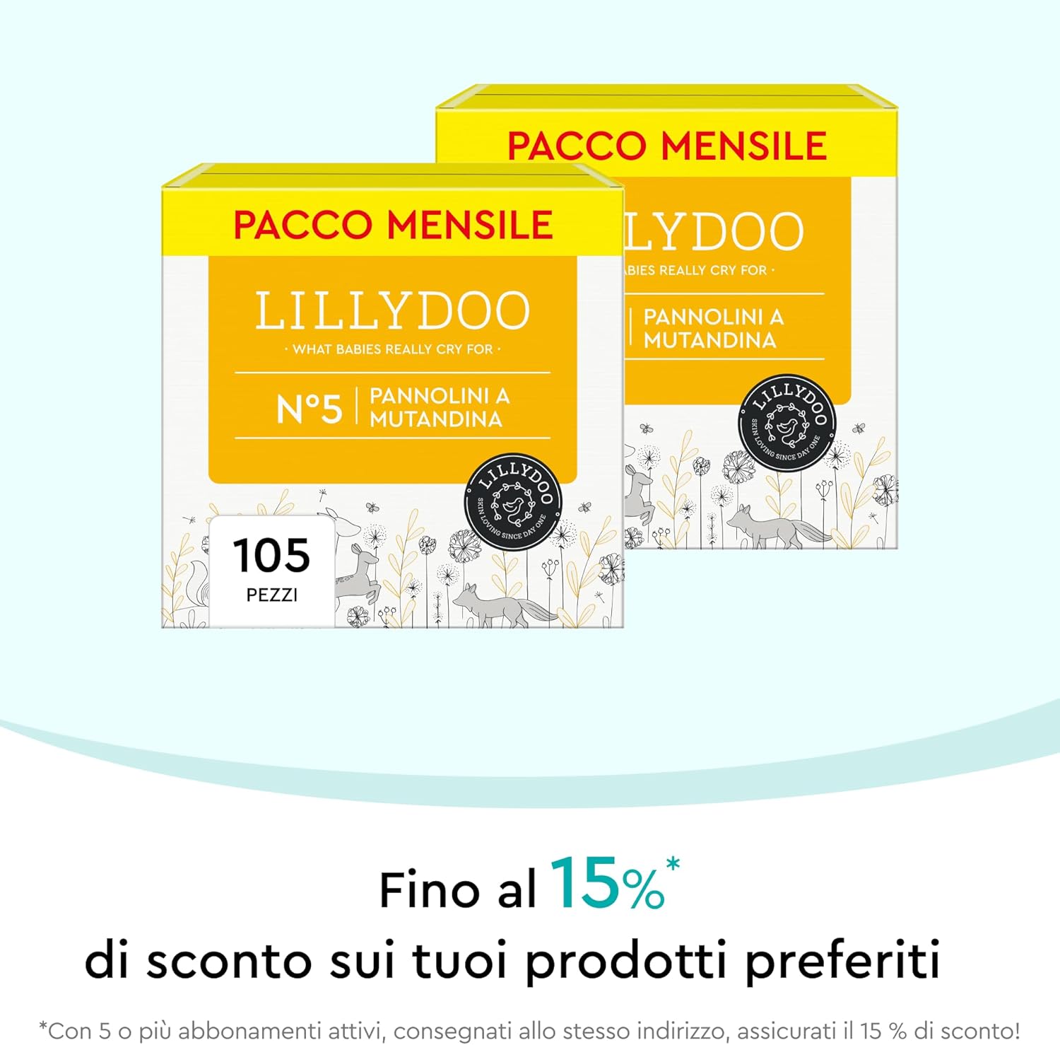 Pannolini a mutandina LILLYDOO, taglia 5 (12-17 kg), Pacco Mensile (105 pezzi) Confezione da 5 x 21