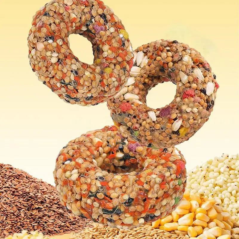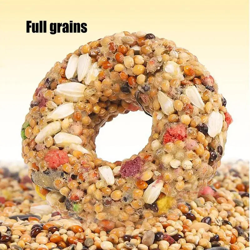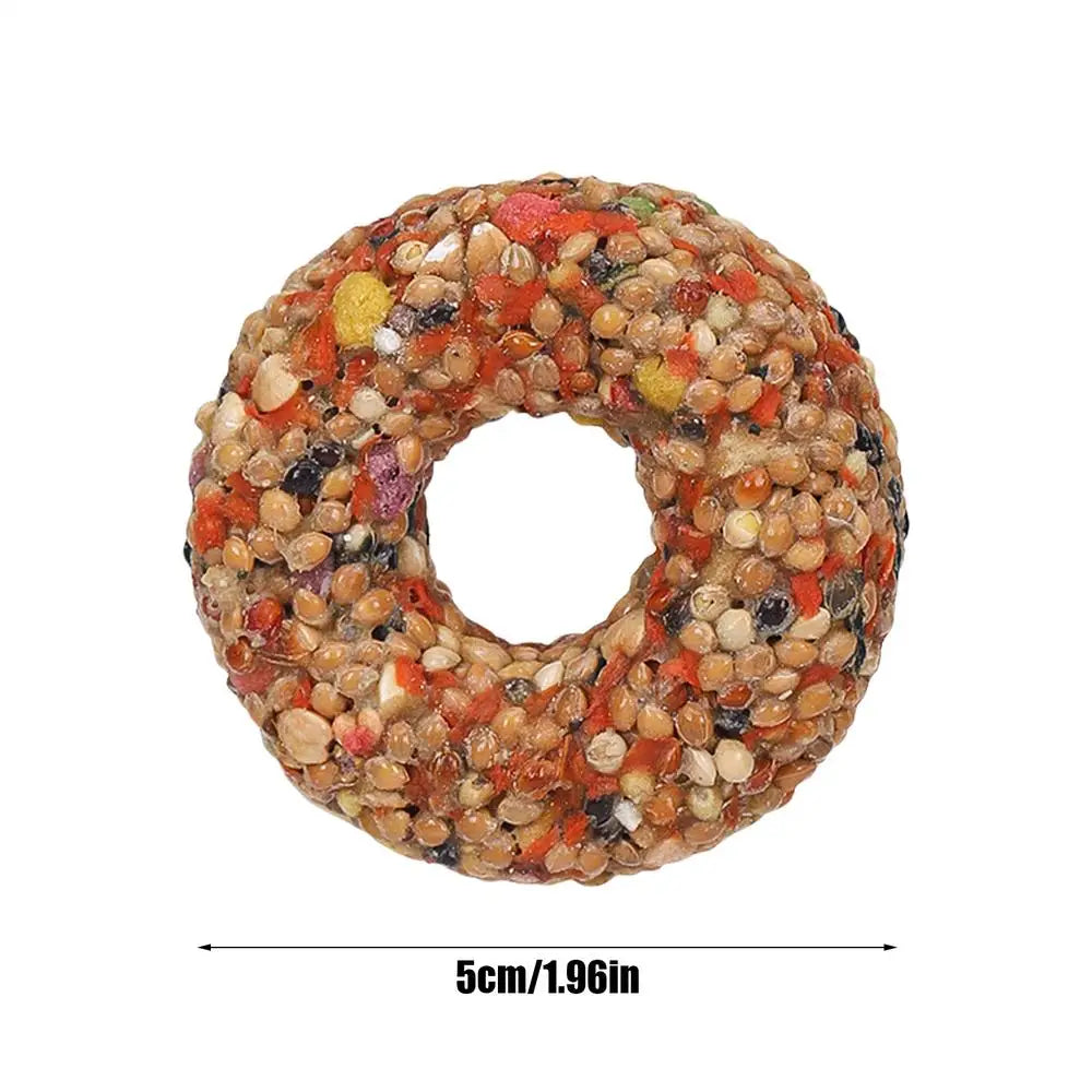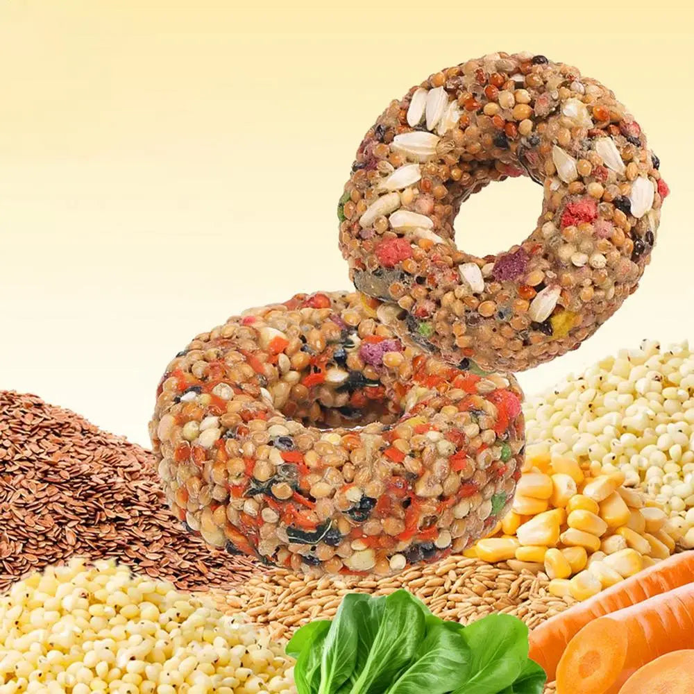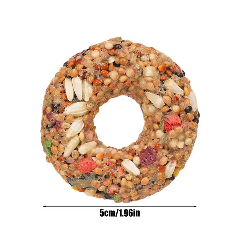 1.Healthy Ingredient: Composed of natural grains and fruits, this blend promotes daily wellness by delivering comprehensive nutrition that fills dietary gaps and supplies vital minerals to support avian health2.Beak Health Support: Medium hardness design prevents overgrowth while promoting natural filing needs for bird beaks, avoiding eating difficulties and encouraging overall health without artificial additives3.Training Reward Tool: Optimizes the training process through its appealing taste and suitability for rewarding skill-building exercises, earning trust from bird owners worldwide4.Curiosity-Driven Fun: Bright colors and fun textures keep parrots entertained, reducing boredom while sparking natural curiosity through playful chewing and exploration5.Wide Range of Uses: Designed specifically for cockatiels, budgies, and lovebirds, this bird food provides a combination that fulfills varying taste profiles and nutritional demands, proving advantageous for every kind of parrot in daily dietary applicationsLovebirds on variety and stimulation which this bird food delivers through its combination of grain and teether textures in a donut shape ideal for encouraging foraging habits and adding enrichment to aviary environments alongside dependable nutritional suppliesProduct attributesProduct name: Bird TreatsProduct weight: 30gProduct size: about 5cm/1.97 inchesNotes: 1. Due to the lighting effects and photographing angles, the product has a color difference; please understand.2. Due to manual measurement, there is a tolerance in the product size.Product listBird Treats *1