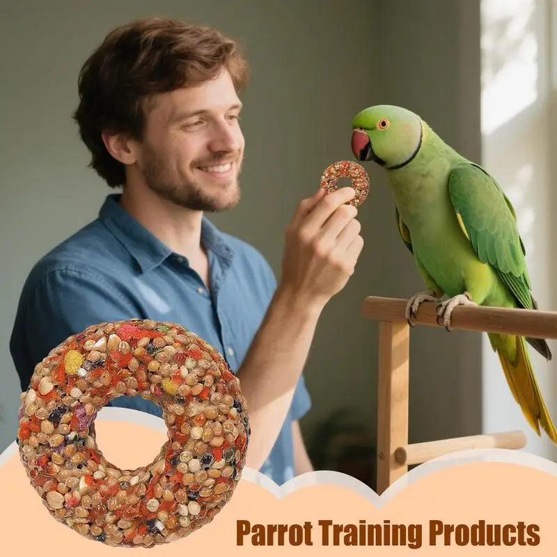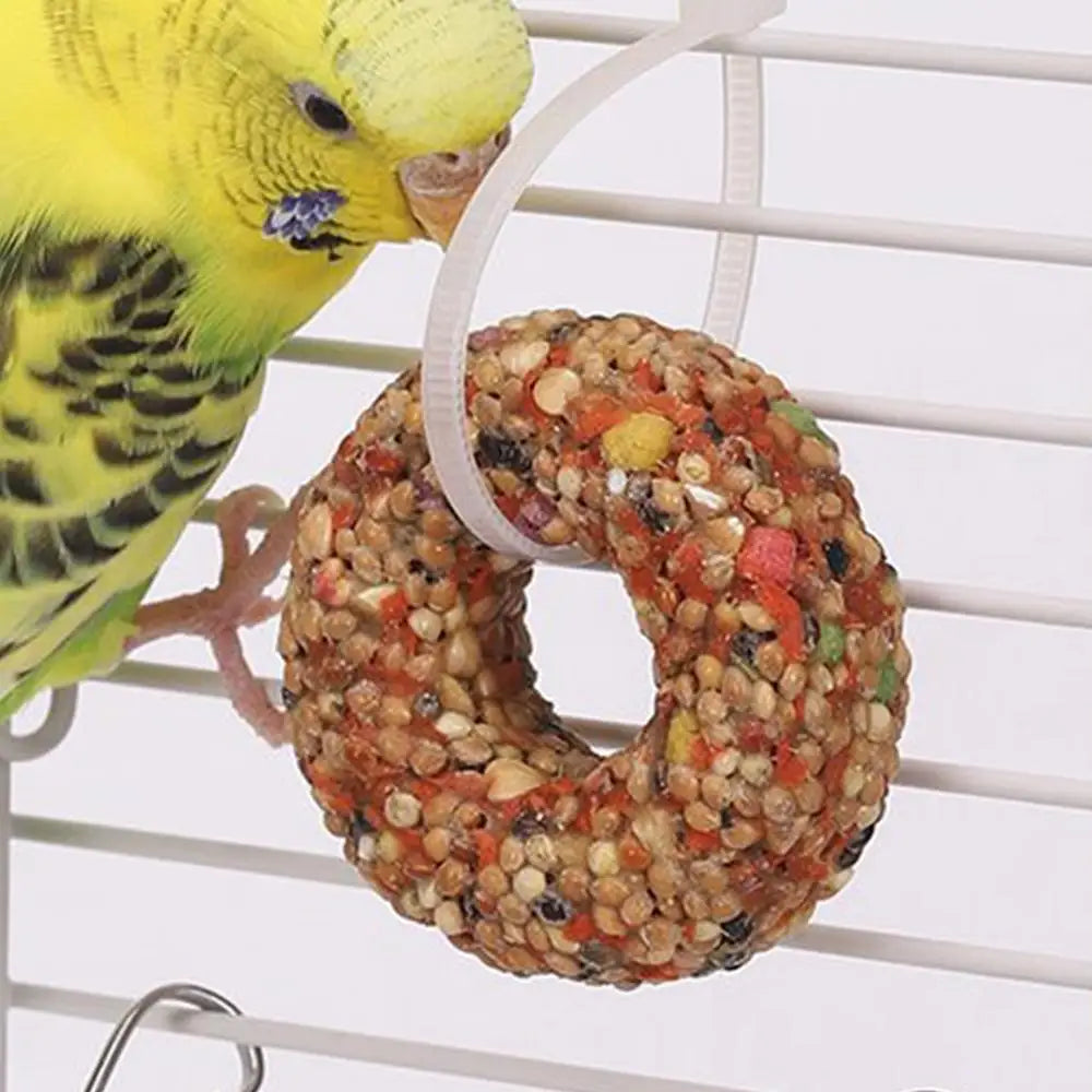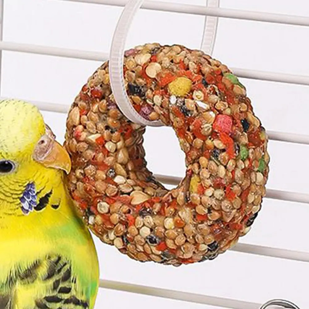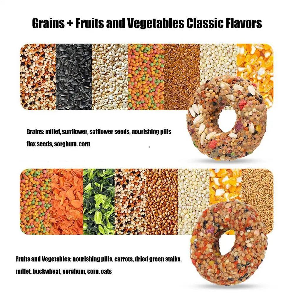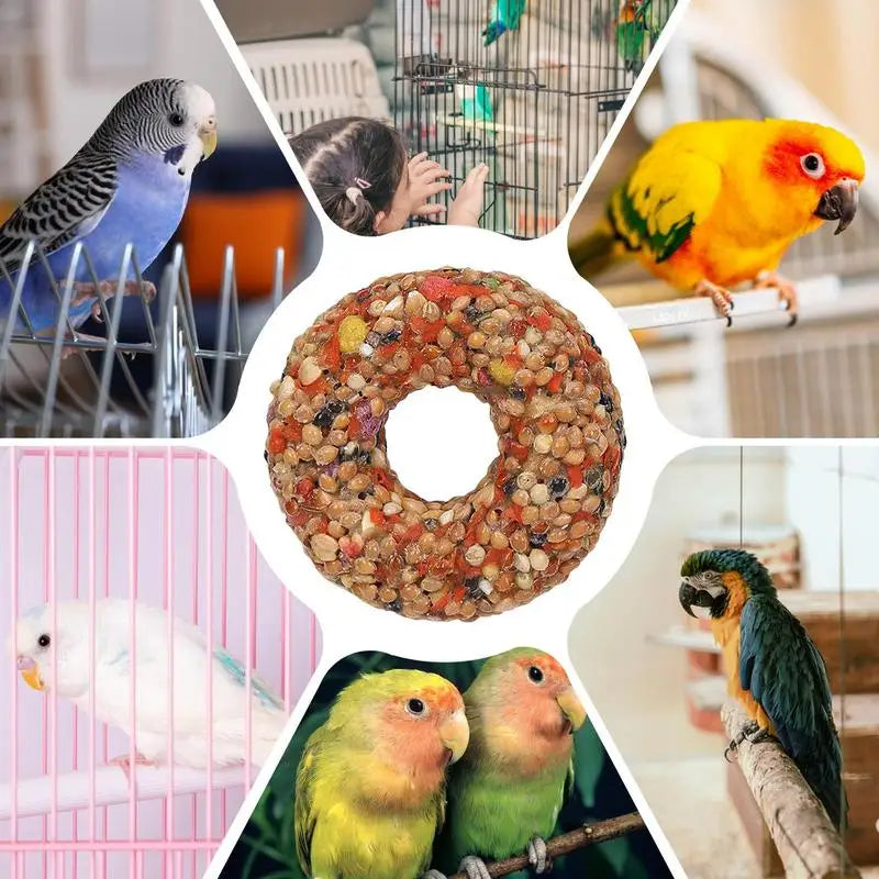 1.Healthy Ingredient: Composed of natural grains and fruits, this blend promotes daily wellness by delivering comprehensive nutrition that fills dietary gaps and supplies vital minerals to support avian health2.Beak Health Support: Medium hardness design prevents overgrowth while promoting natural filing needs for bird beaks, avoiding eating difficulties and encouraging overall health without artificial additives3.Training Reward Tool: Optimizes the training process through its appealing taste and suitability for rewarding skill-building exercises, earning trust from bird owners worldwide4.Curiosity-Driven Fun: Bright colors and fun textures keep parrots entertained, reducing boredom while sparking natural curiosity through playful chewing and exploration5.Wide Range of Uses: Designed specifically for cockatiels, budgies, and lovebirds, this bird food provides a combination that fulfills varying taste profiles and nutritional demands, proving advantageous for every kind of parrot in daily dietary applicationsLovebirds on variety and stimulation which this bird food delivers through its combination of grain and teether textures in a donut shape ideal for encouraging foraging habits and adding enrichment to aviary environments alongside dependable nutritional suppliesProduct attributesProduct name: Bird TreatsProduct weight: 30gProduct size: about 5cm/1.97 inchesNotes: 1. Due to the lighting effects and photographing angles, the product has a color difference; please understand.2. Due to manual measurement, there is a tolerance in the product size.Product listBird Treats *1