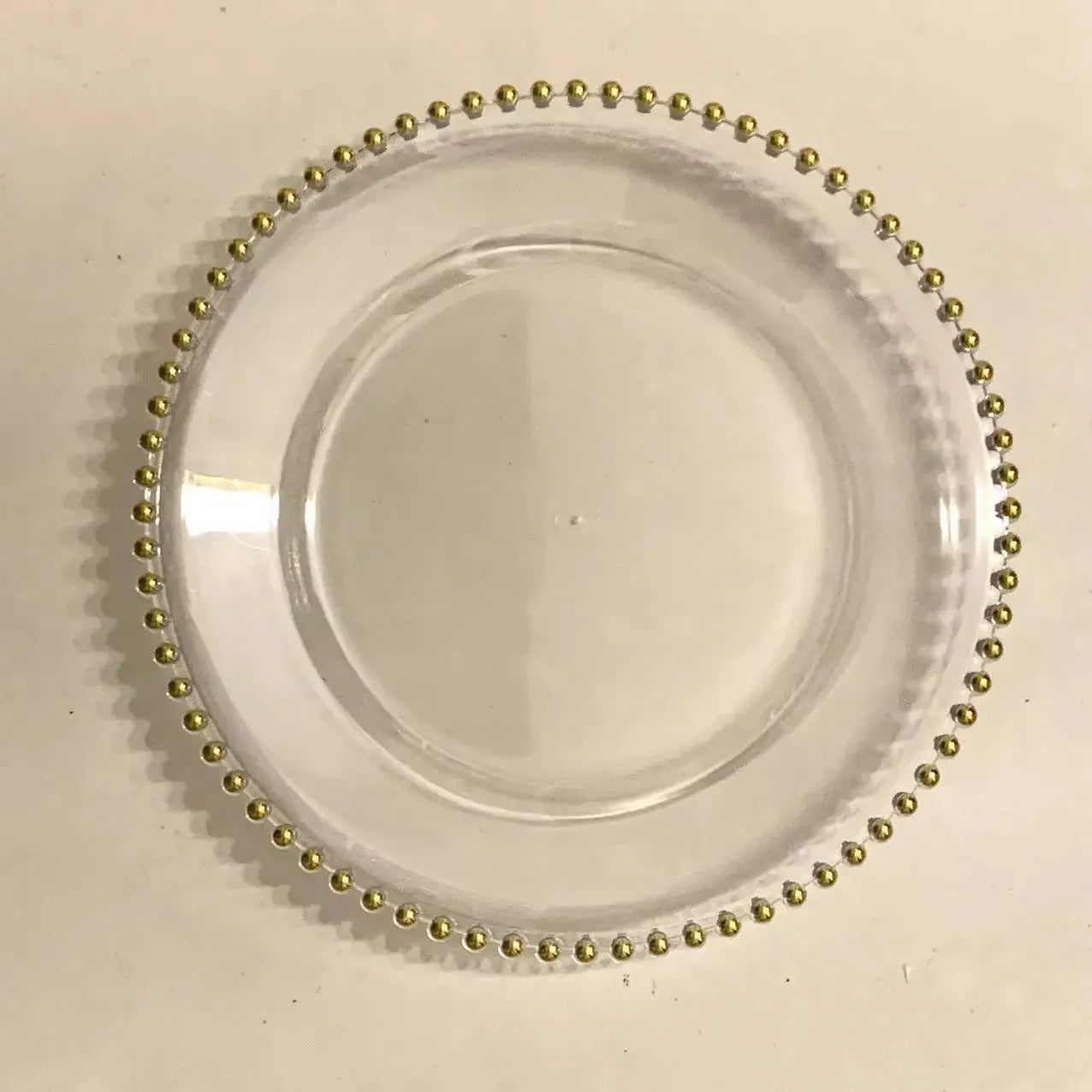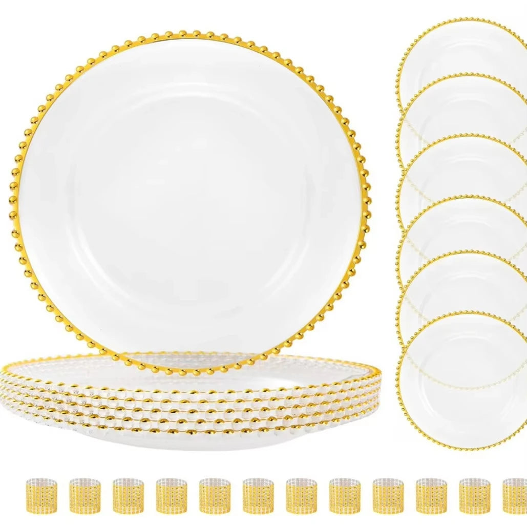 Migliora il tuo prossimo evento con l'eleganza senza pari delle nostre piastre caricabatterie in plastica trasparente con perline dorate. Ordina ora per rendere la tua tavola davvero indimenticabile!
