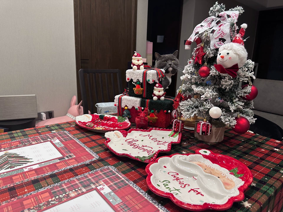 Pieni di elementi natalizi: i piatti sono dipinti con cura con il simpatico Babbo Natale e gli pinoli che simboleggiano le vacanze, aggiungendo una forte atmosfera festosa al tavolo da pranzo.
