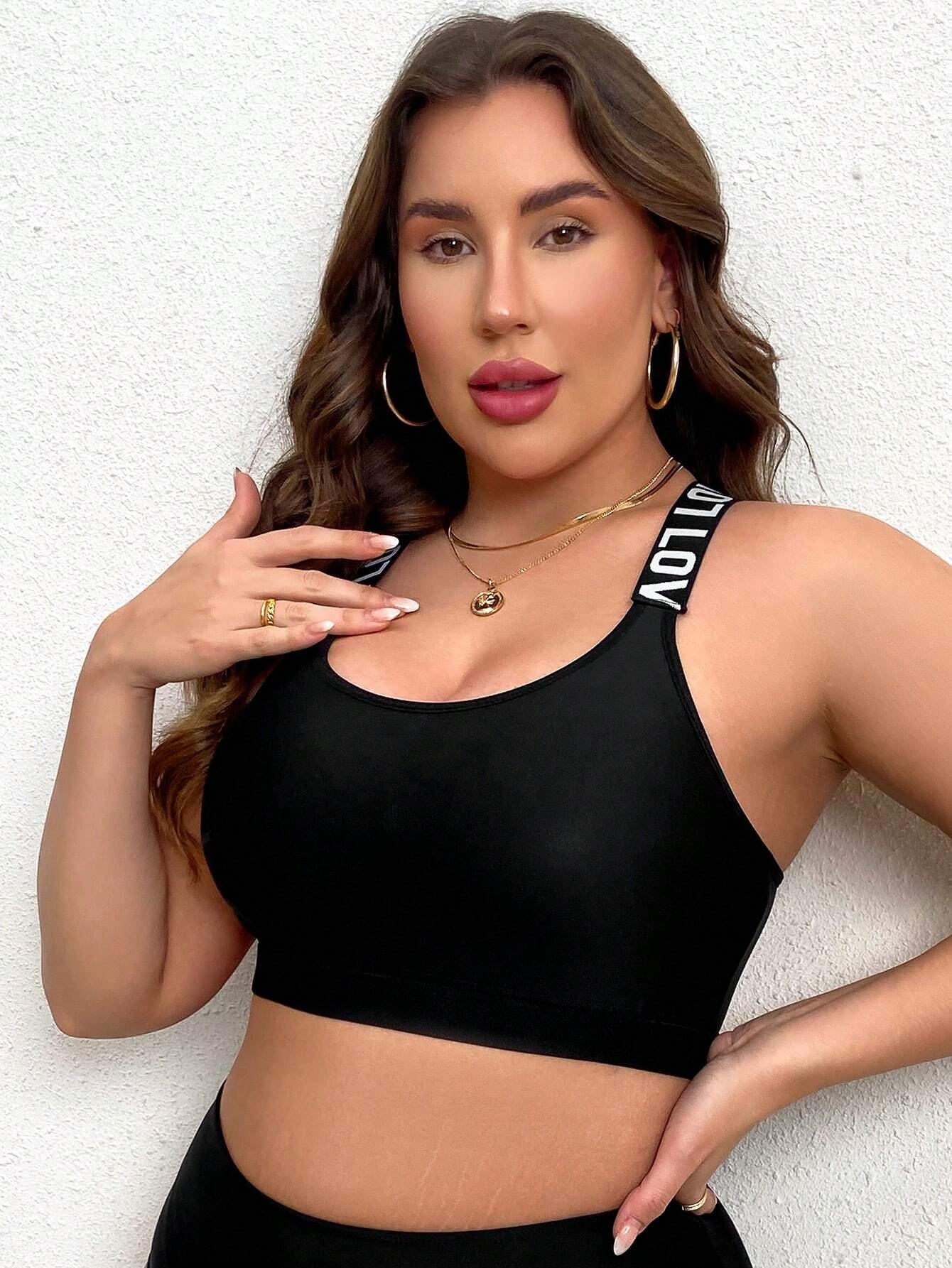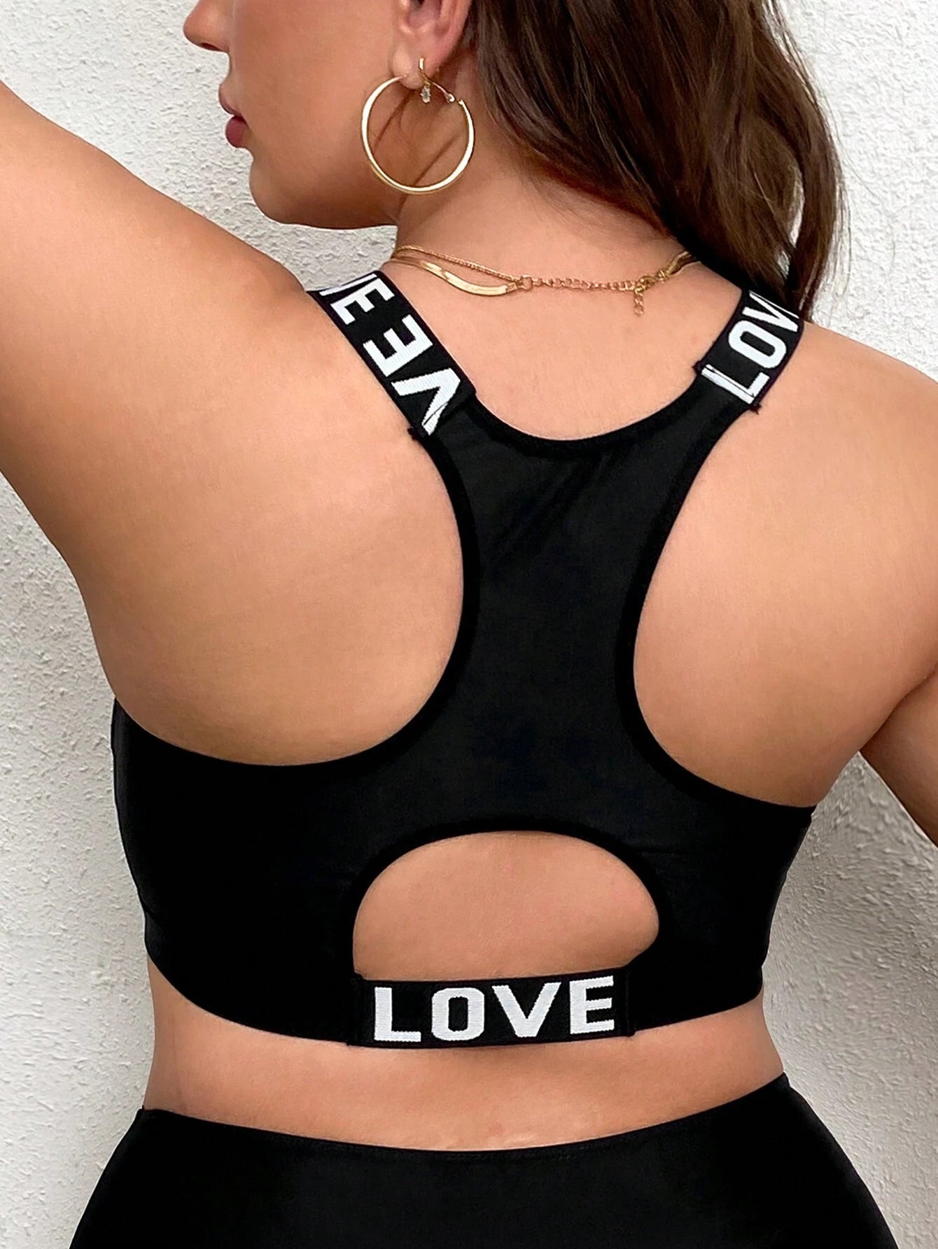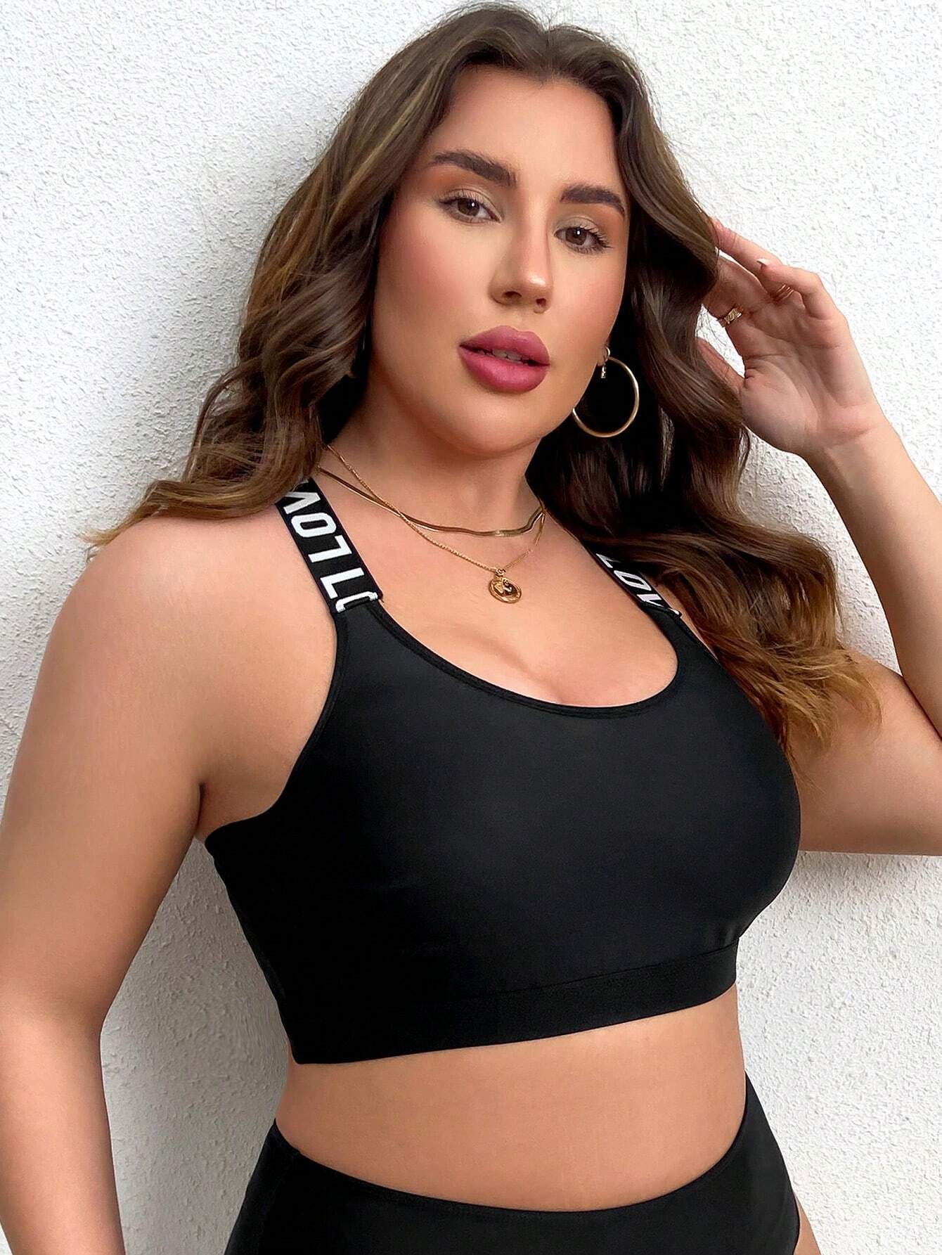 Plus Size Women's Sports Bra, Black & White Letter Tape Seamless Racerback Full Coverage Bra