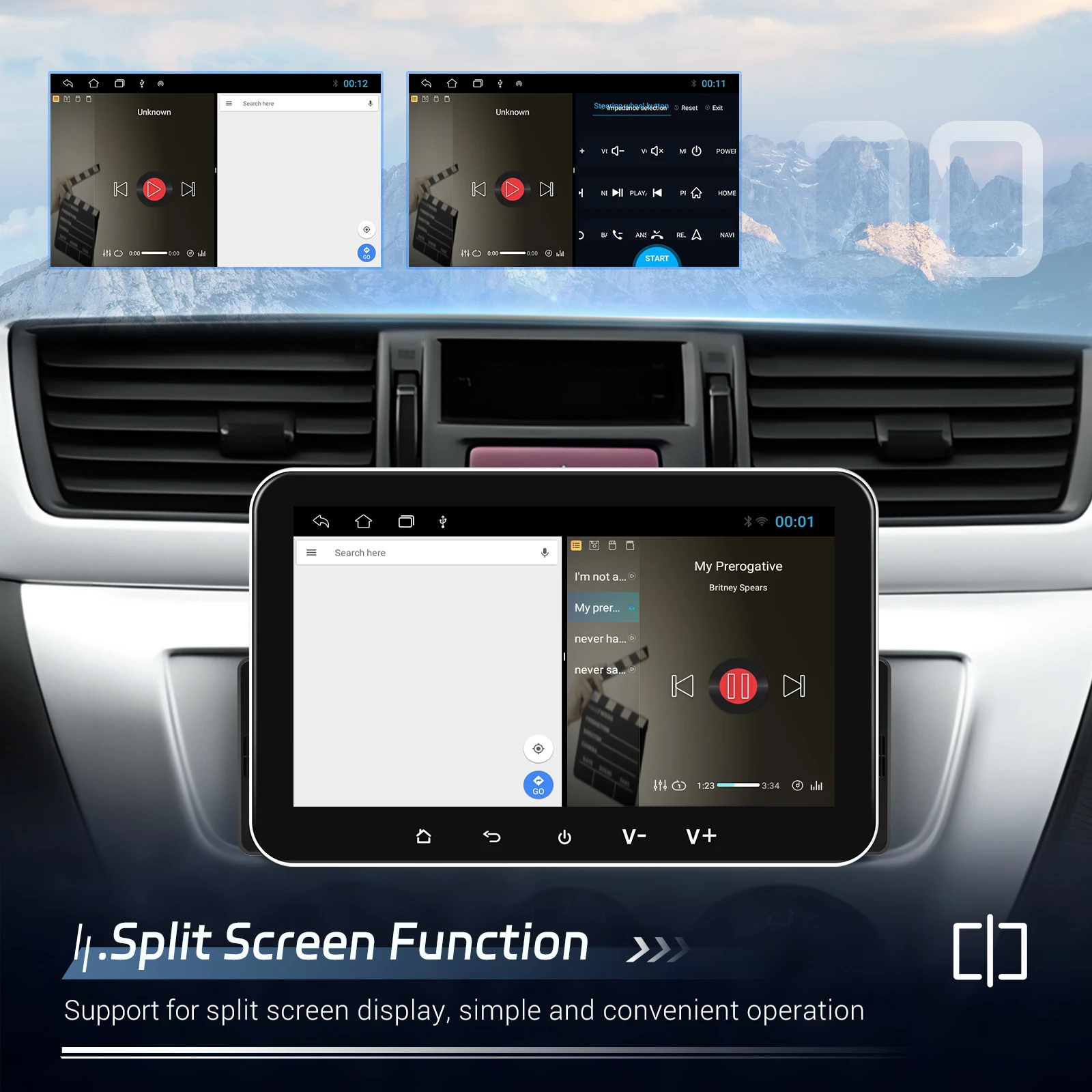 ● Split screen function: two pages can be displayed at the same time, such as navigation and music display at the same time
