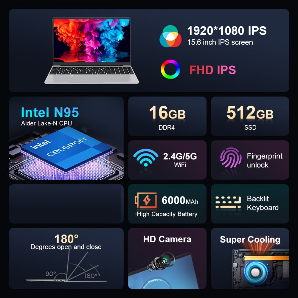 Portatile Ninkear N15 AIR 15,6 pollici IPS 1080P con processore Intel Celeron N95 3,4 GHz, 16 GB di RAM e 512 GB di SSD, adatto per gaming e uso da ufficio