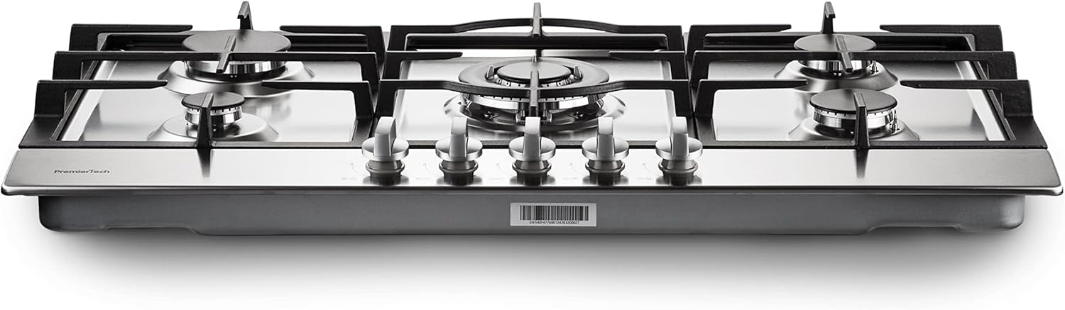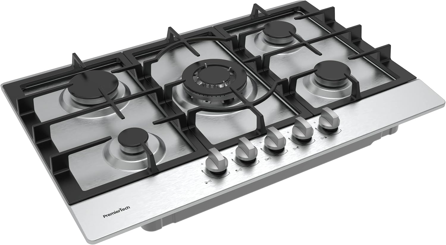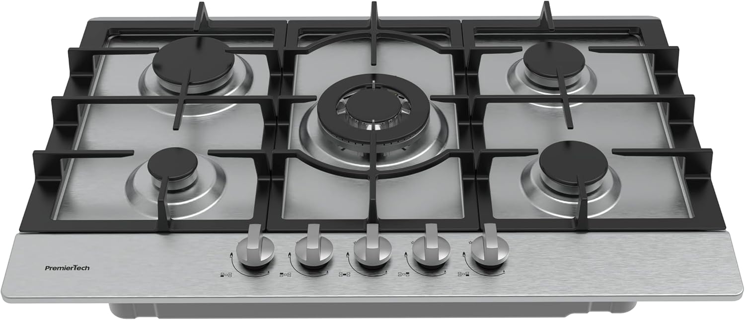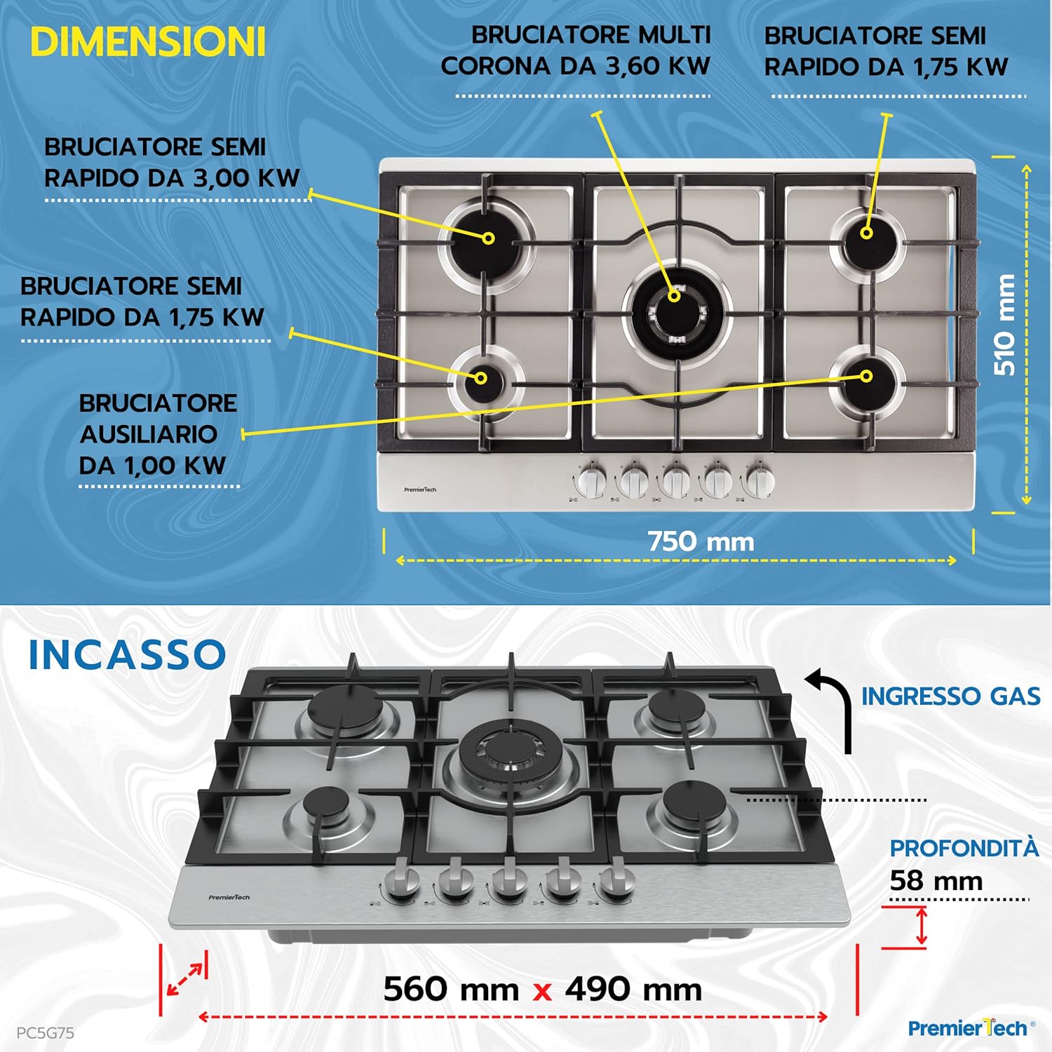 PremierTech Piano Cottura a Gas 5 fuochi, 75 cm, Inox, Bruciatore Centrale, Supporti in Ghisa, predisposto Metano e kit ugelli GPL inclusi, PC5G75