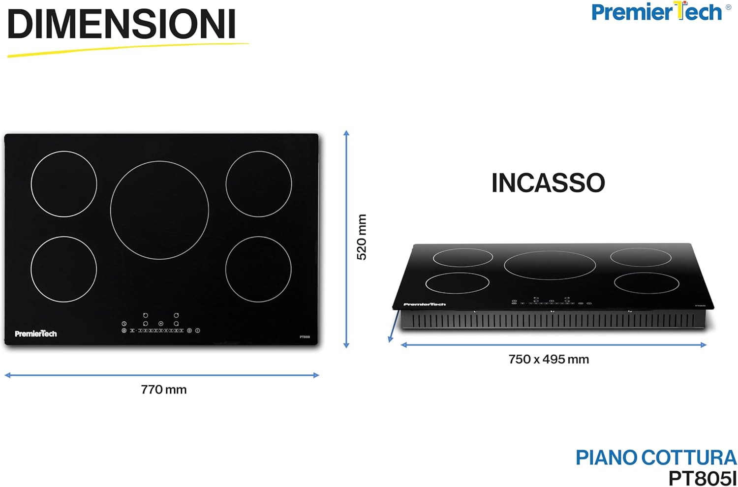 PremierTech Piano Cottura a Induzione, 80cm 5 zone (77cm esterne), funzioni Timer, Lock, Boost, Design, PT805I