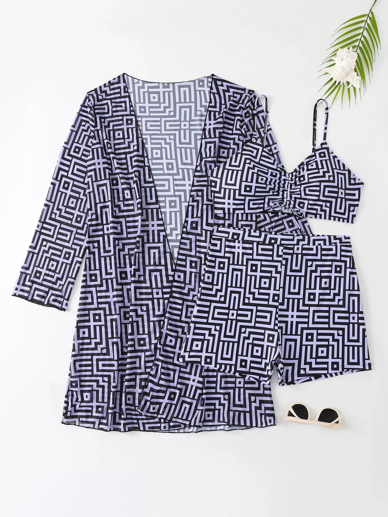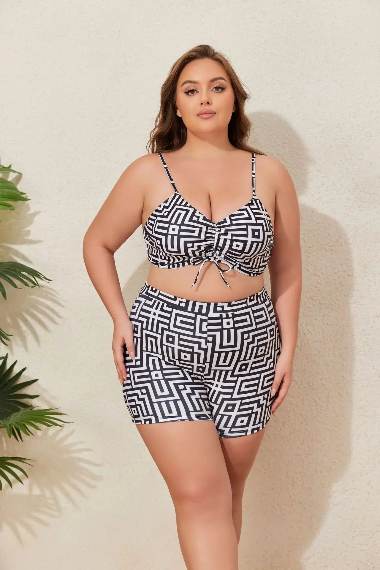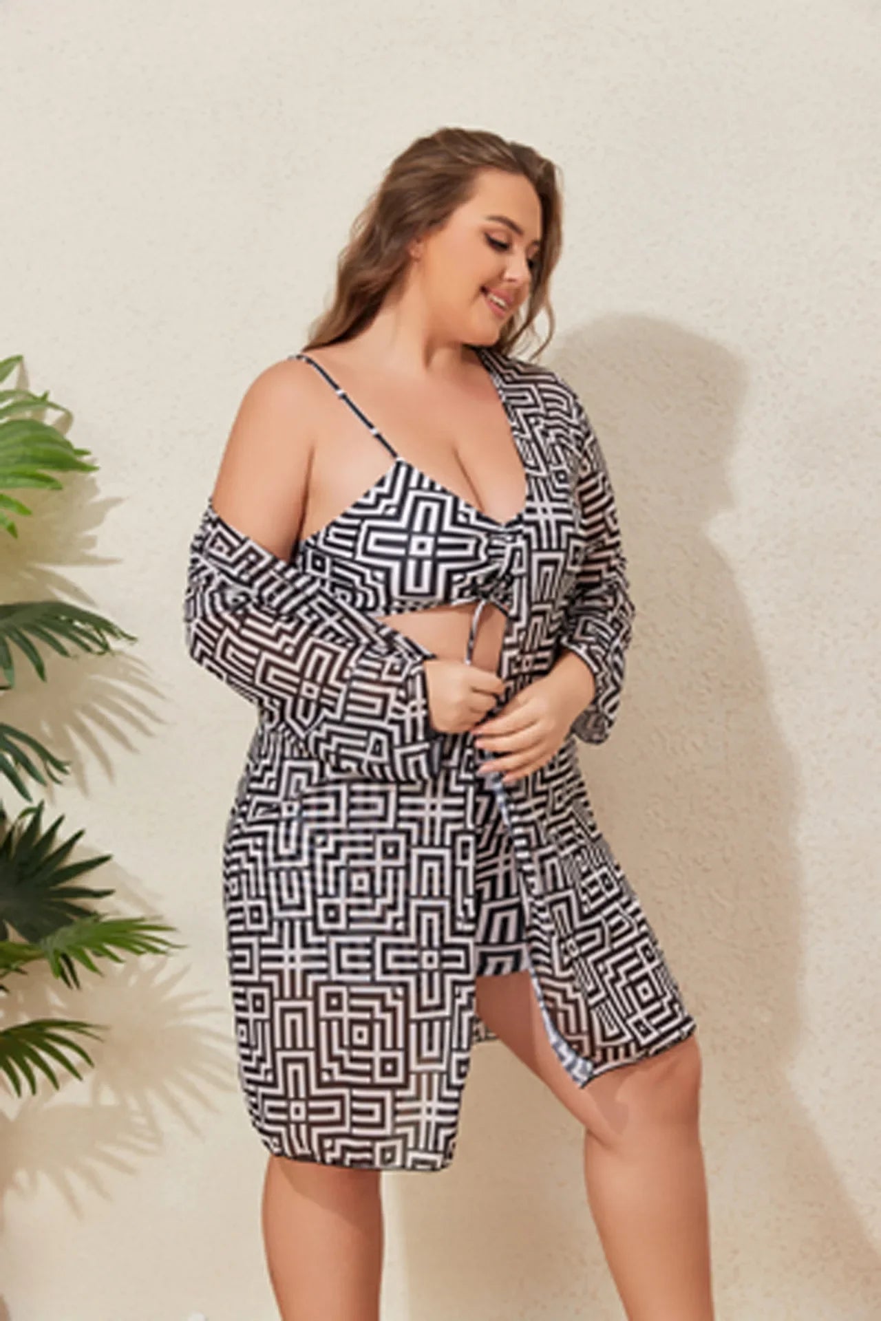 Print 3 Piece Mesh Cove Up Plus Size Bikini Set Women Lady Push UP Big Swimsuit Curvy High Waist Shorts Chubby Bathing Suit