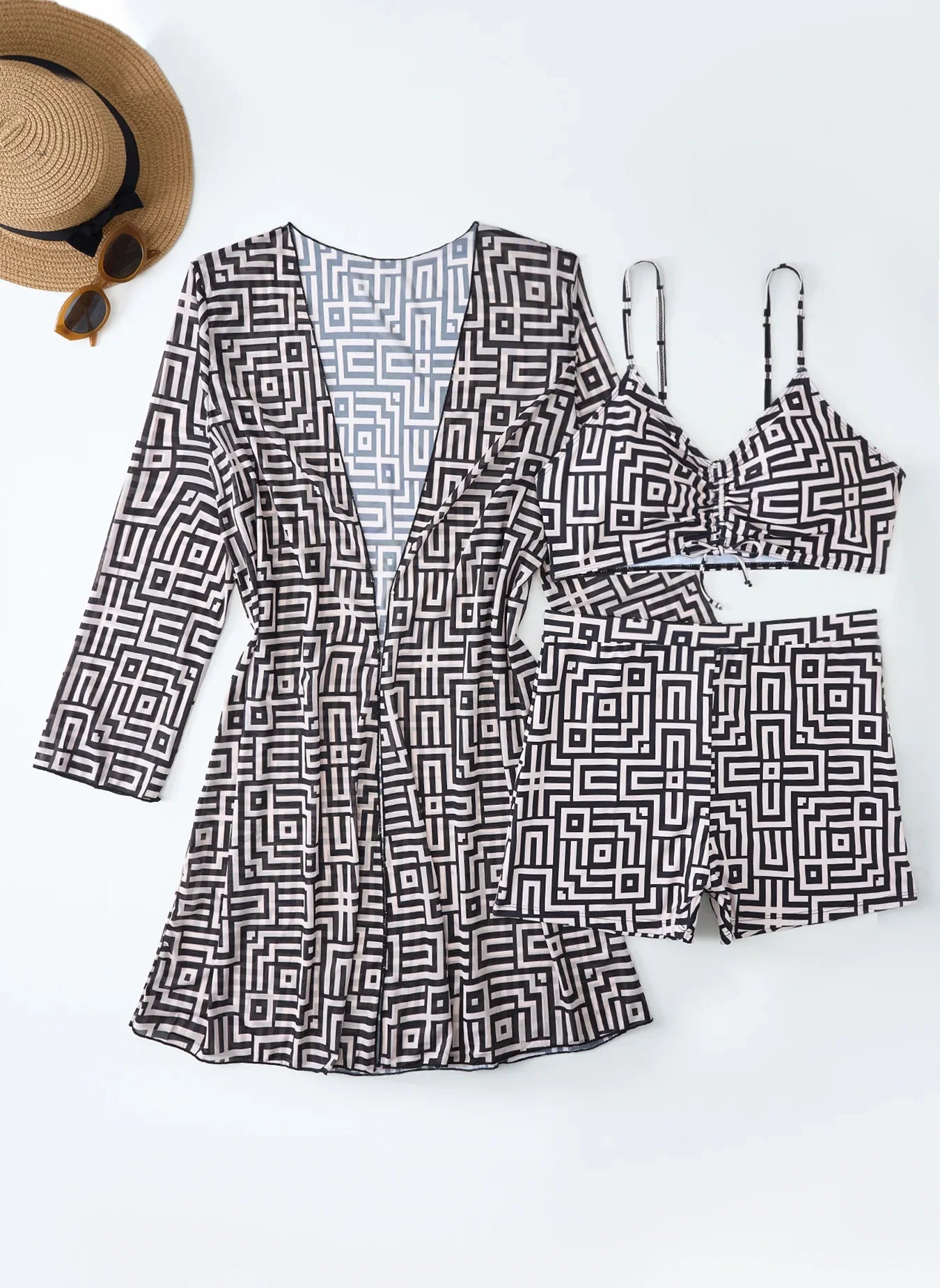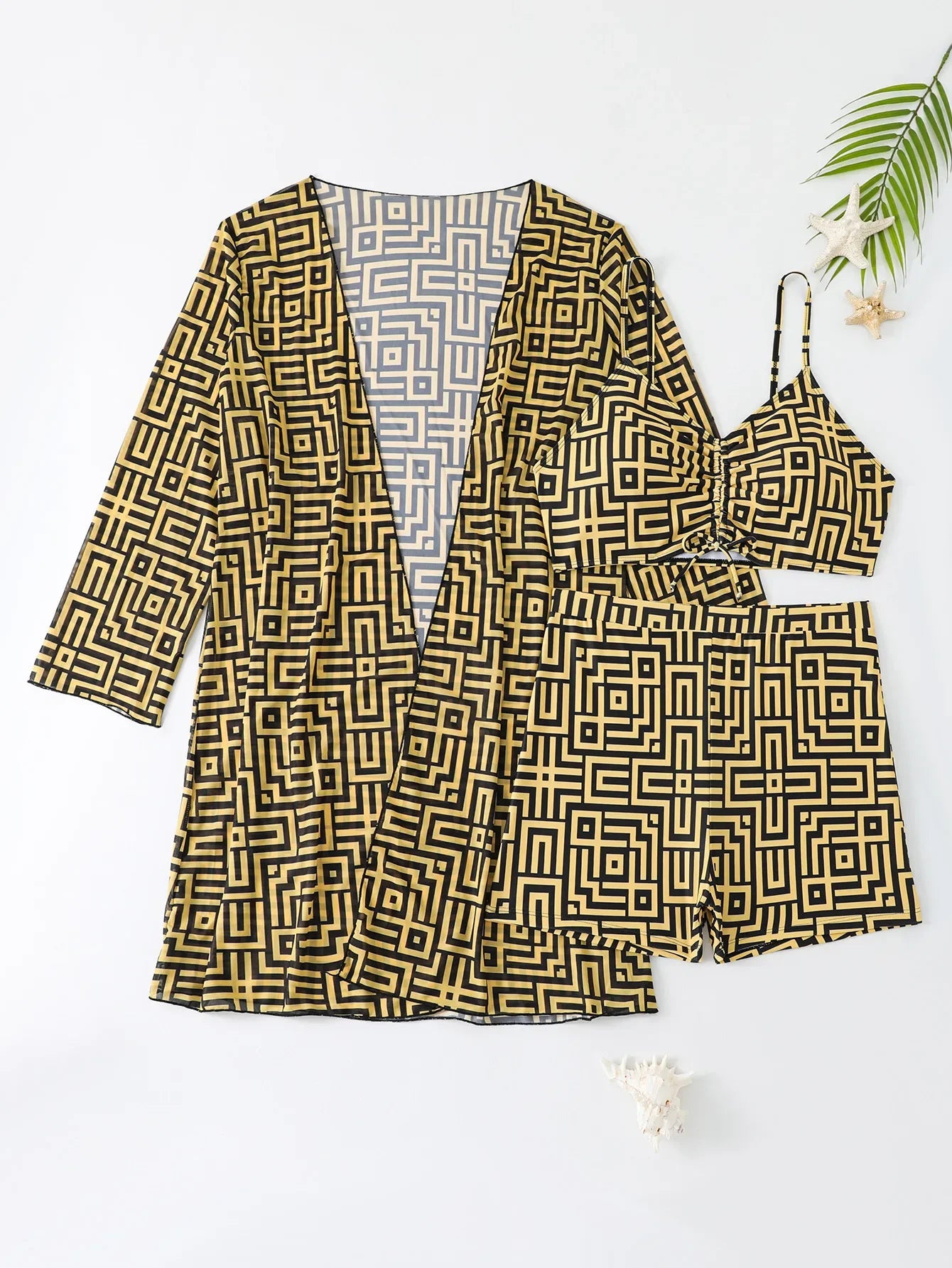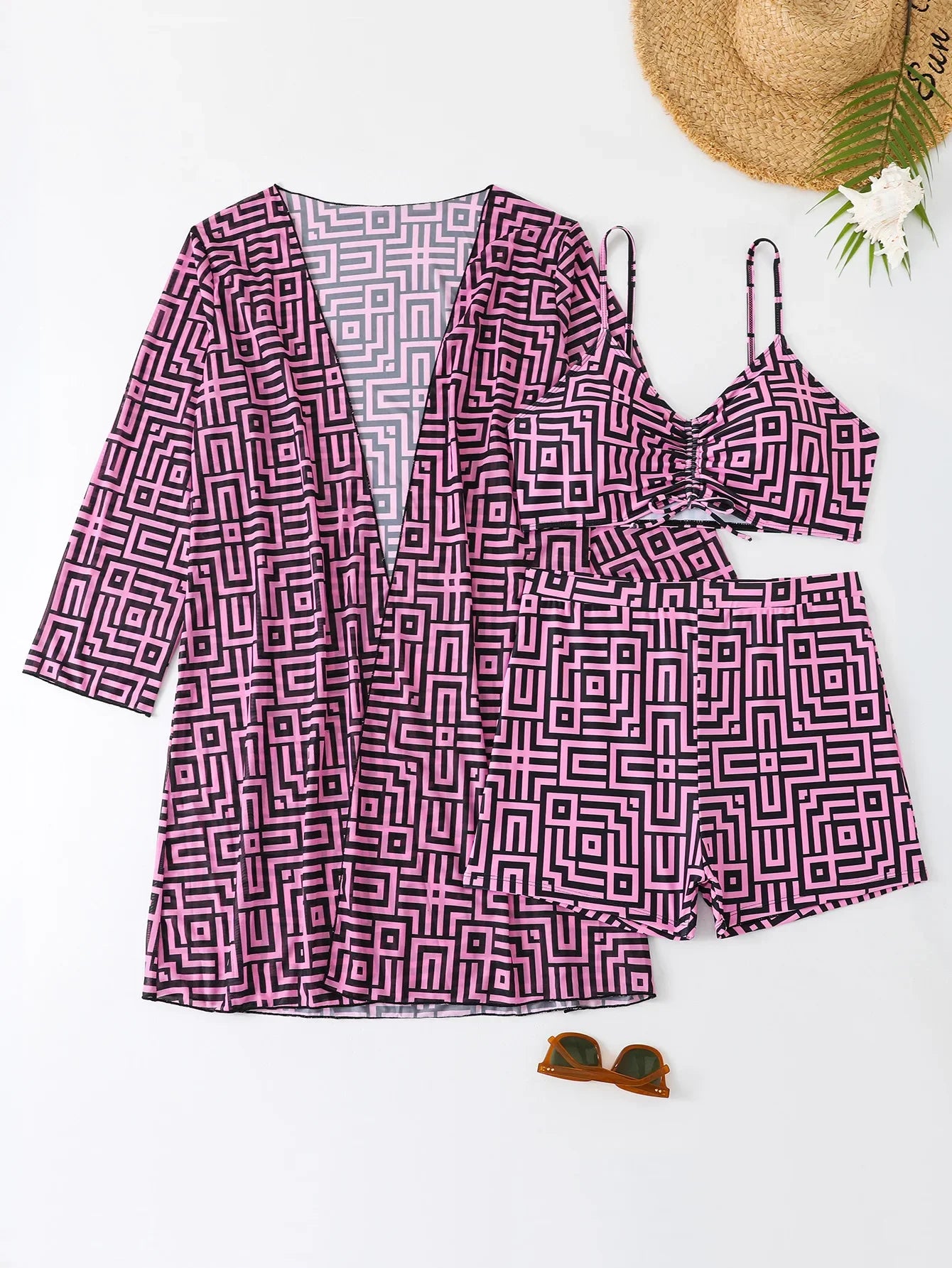 Print 3 Piece Mesh Cove Up Plus Size Bikini Set Women Lady Push UP Big Swimsuit Curvy High Waist Shorts Chubby Bathing Suit