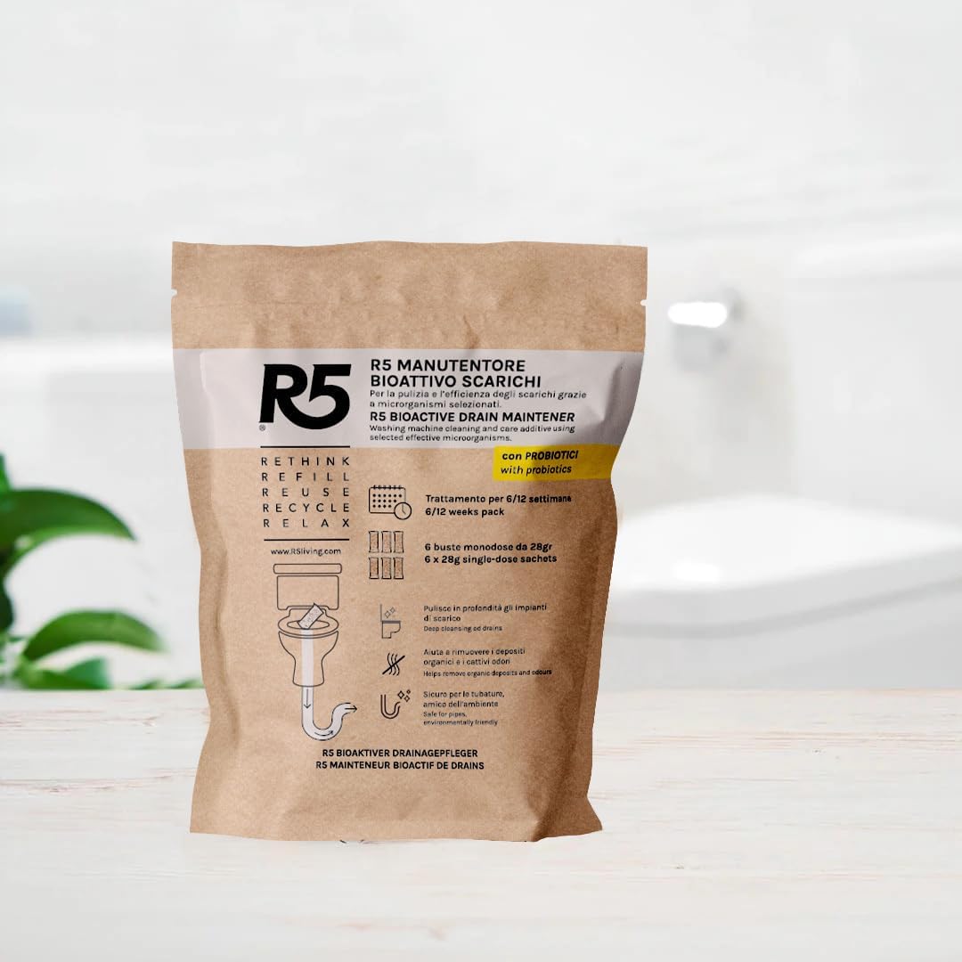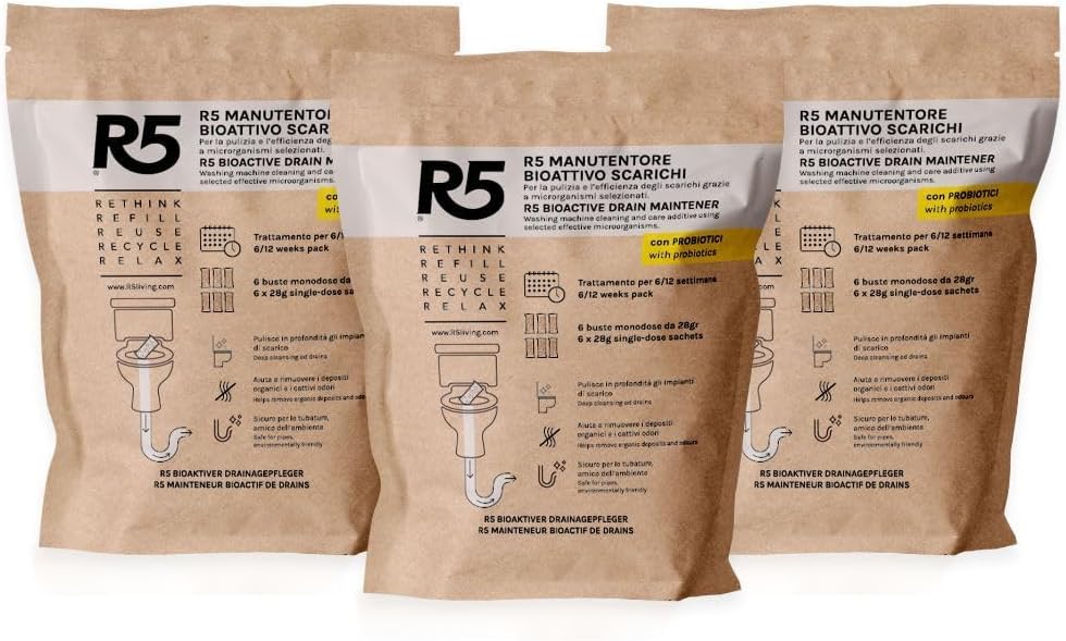 R5, Manutentore Bioattivo Scarichi, 3 Confezioni da 6 Monodosi, Additivo per la Pulizia e la Cura degli Scarichi con l'Ausilio di Microrganismi Effettivi Selezionati, Made in Italy