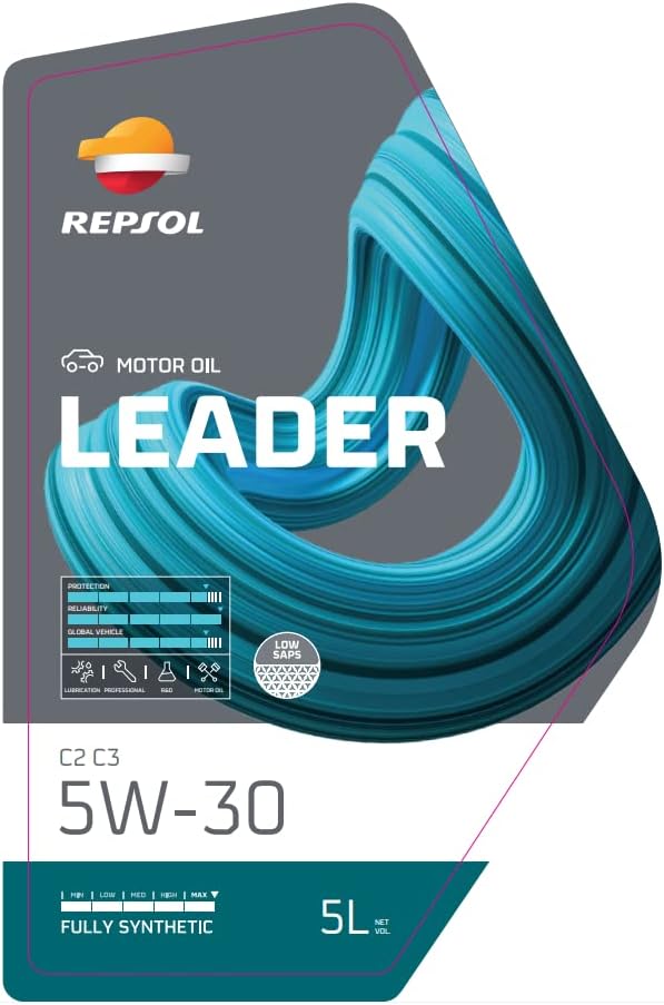 Olio lubrificante per motori Repsol Leader C2 C3 5W-30 5 litri Lubrificante sintetico per motori a benzina e diesel leggeri della maggior parte delle case automobilistiche. È compatibile con i veicoli dotati di DPF. La sua formulazione a basso contenuto di ceneri lo rende adatto alle tecnologie di post-trattamento dei gas di scarico e allo stesso tempo contribuisce alla conservazione dell'ambiente riducendo al minimo le emissioni di particolato nocivo. Aiuta a ridurre il consumo di carburante in condizioni di guida normali. Di conseguenza, contribuisce alla riduzione delle emissioni di CO2 nell'atmosfera e quindi alla salvaguardia dell'ambiente. Consigliato per i motori a benzina e diesel di un'ampia gamma di produttori di veicoli. Il suo basso contenuto di ceneri lo rende necessario per la durata delle nuove tecnologie di abbattimento delle emissioni, come i filtri antiparticolato diesel (DPF), contribuendo così maggiormente alla protezione dell'ambiente rispetto ai lubrificanti convenzionali. Contribuisce a ridurre la formazione di depositi e fanghi, mantenendo la pulizia del motore. Protegge il motore dall'usura offrendo un'ottima resistenza all'ossidazione e alla rottura del film di taglio. Grazie alla sua tecnologia sintetica e alla viscosità studiata, consente un risparmio di carburante fino al 2,5% rispetto ad altri lubrificanti, nelle condizioni standard del test M111FE. Approvazione: ACEA C2/C3, API SN/CF (approvazione formale).