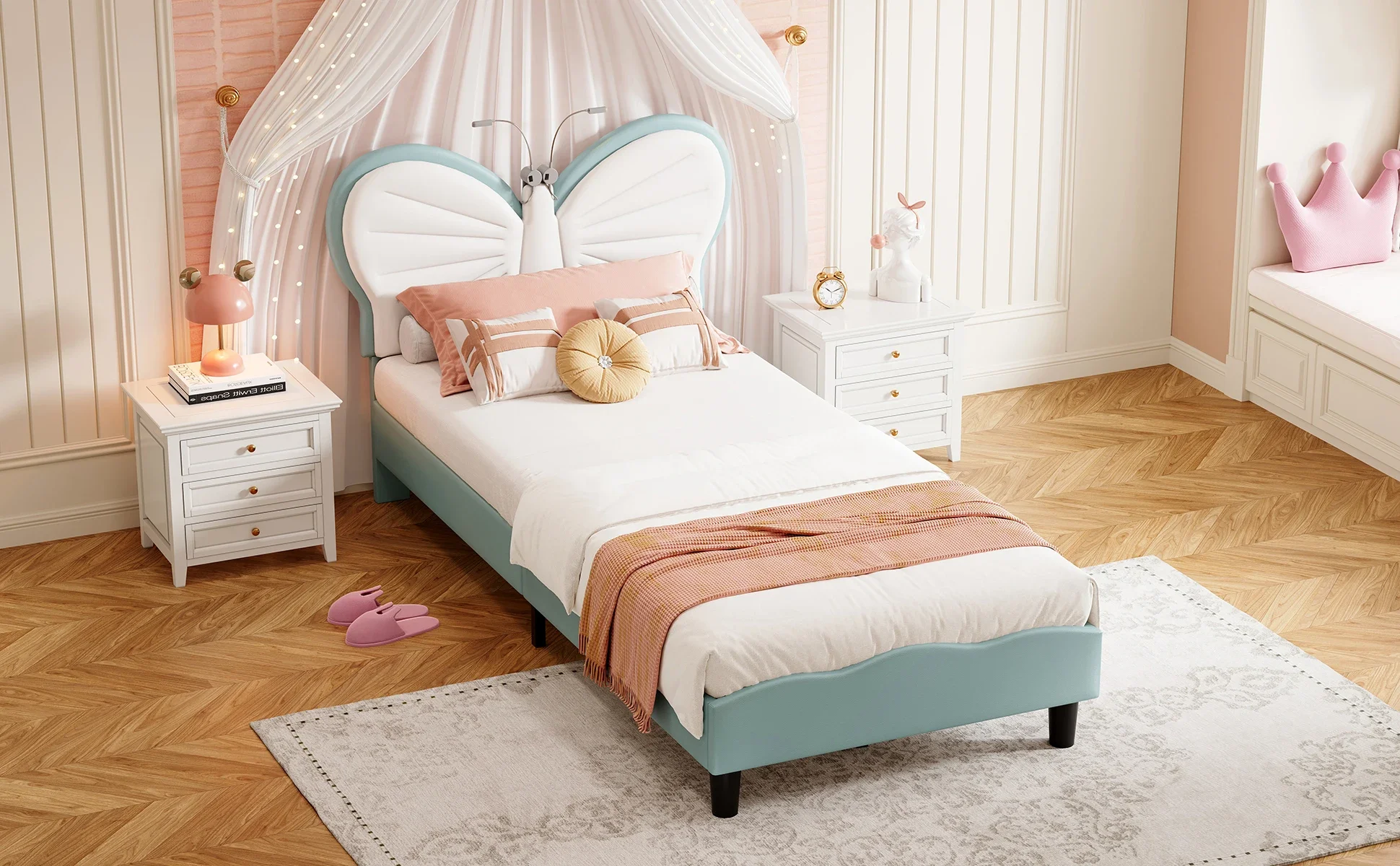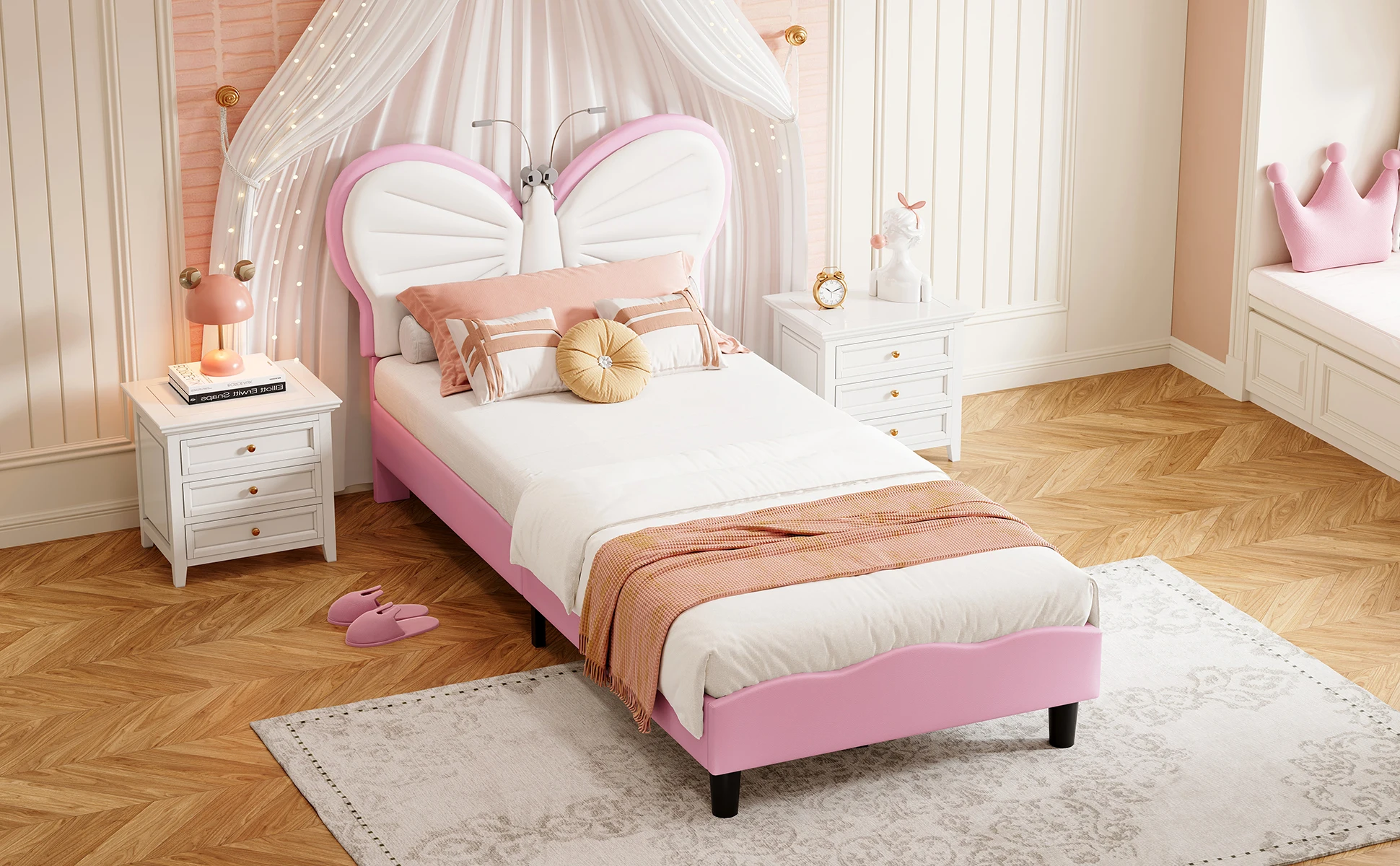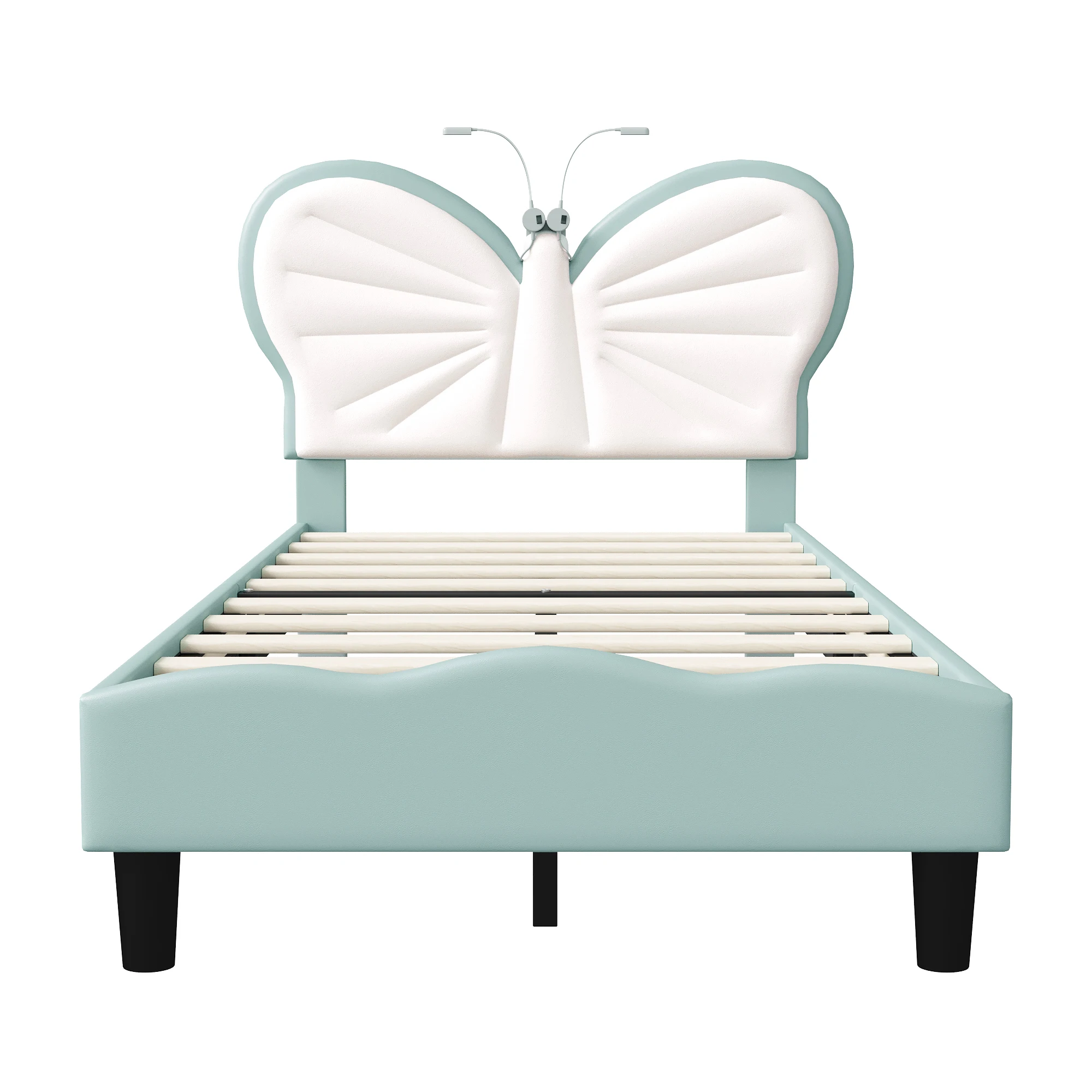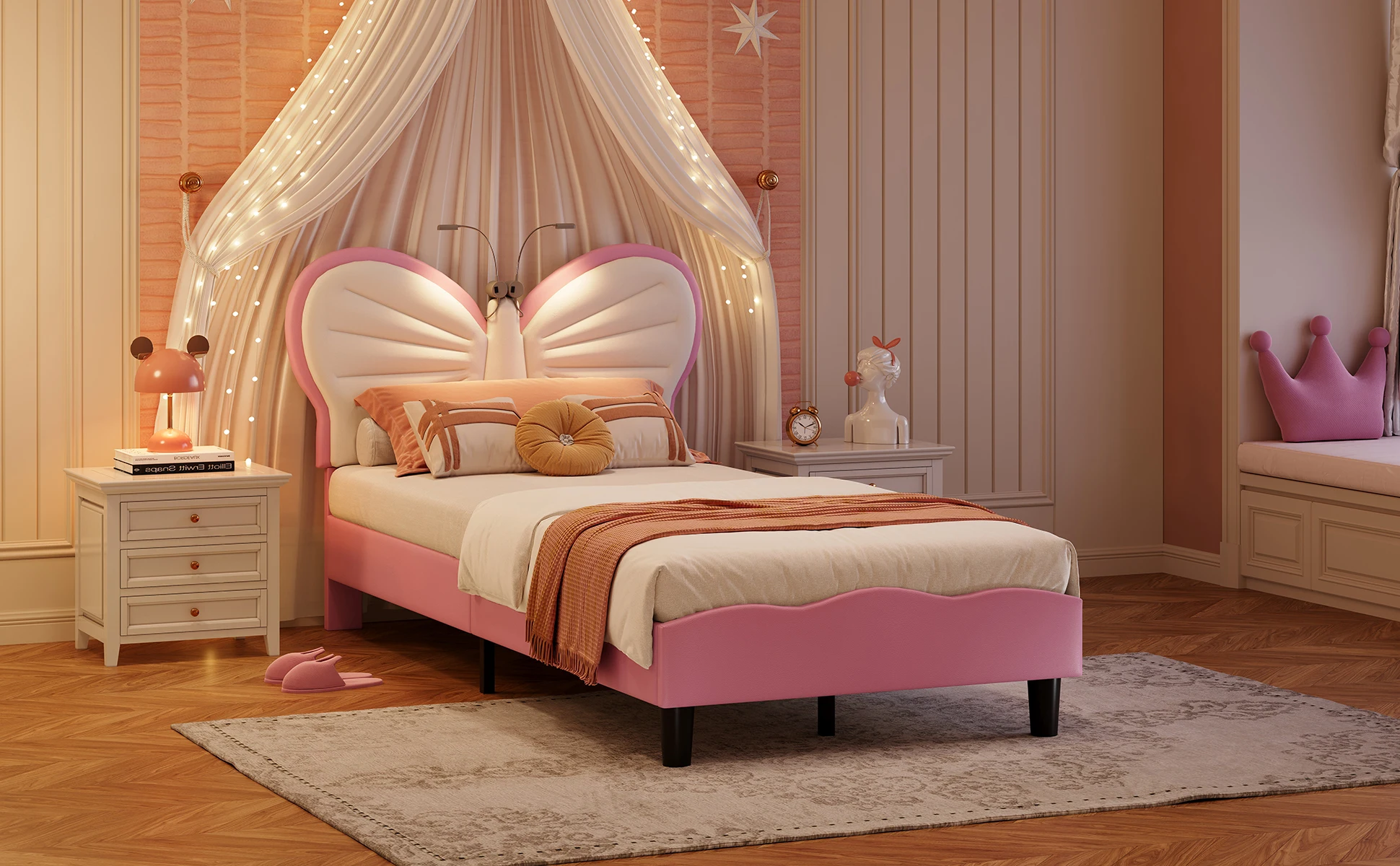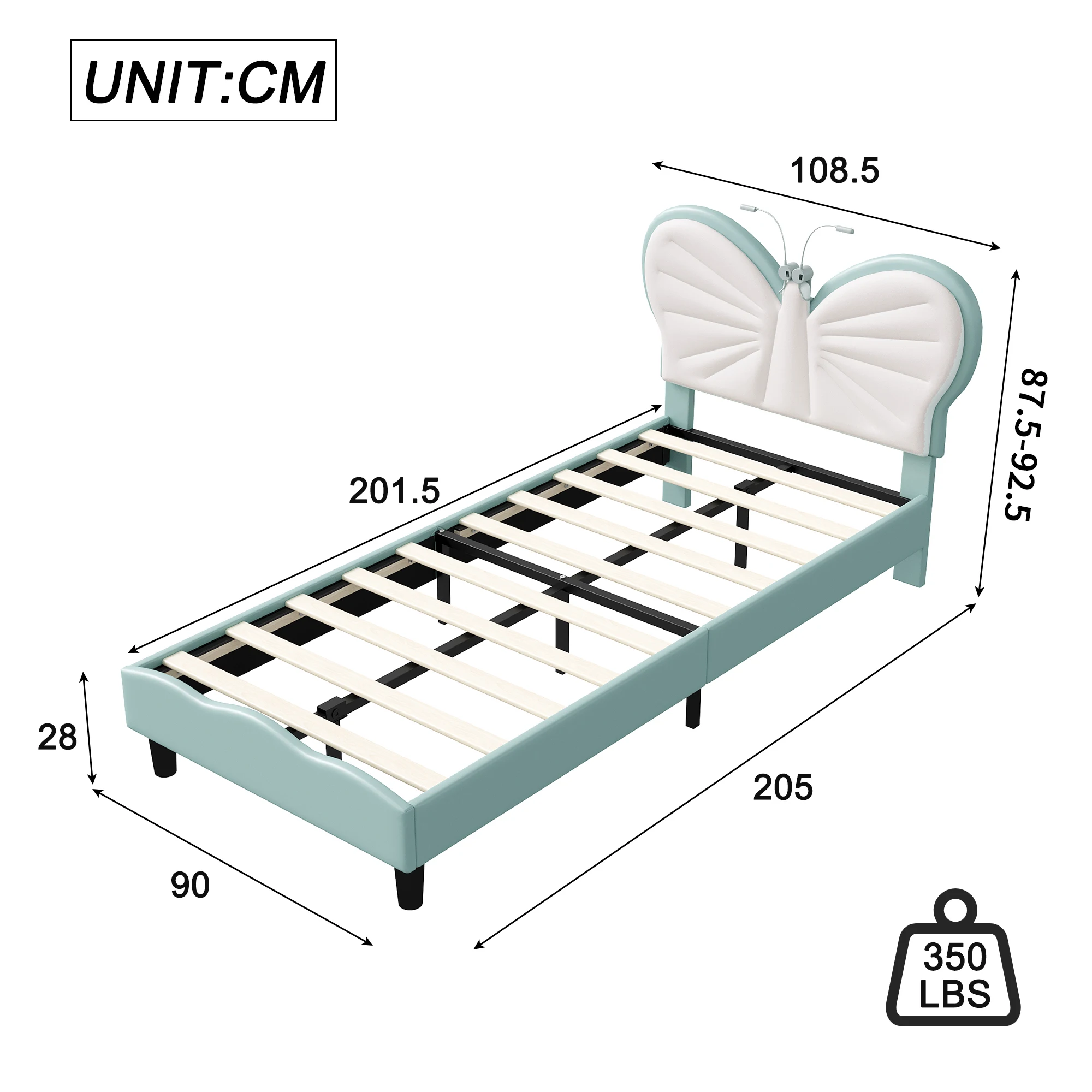 Rosahqnda Letto per bambini 90x200 cm,Cama singolo per ragazzi e ragazze,Culla a farfalla con luce LED, testiera regolabile in velluto,senza materasso